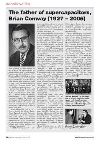University of Pennsylvania to join his former PhD supervisor, John Bockris, who had taken up a position there in the previous year and convinced him to try his hand in the US. He stayed until 1956, at which time he was persuaded by chemical kinetics pioneer professor Keith Laidler to apply for a faculty position at the then two-year-old chemistry department of the University of Ottawa. Conway — who would become a Canadian citizen — would remain there for the next 49 years. He was promoted to the rank of full professor in 1962, then four years later as chairman of the department. Conway worked on nearly all aspects of electrochemistry: the electrified interface, ion solvation, adsorption, electrode kinetics, oxide film formation, electrocatalysis, rechargeable batteries, and electrochemical capacitors Between 1975 and 1980, Conway carried out extensive fundamental and development work on the ruthenium oxide type of electrochemical capacitor. In 1991 he coined the term ‘supercapacitor’ as the explanation for increased capacitance by surface redox reactions with faradaic charge transfer between electrodes and ions. Conway’s work in applied electrochemistry has allowed the development of rechargeable, compact batteries and supercapacitors for cellular phones In the early 2000s, Axion Power International developed its e3 Supercell, a low cost batterysupercapacitor hybrid that uses the same cases, materials, internal components and manufacturing equipment as conventional leadacid batteries; offers faster recharge rates, higher power output and longer cycle-life. During this time, Conway collaborated with the East Penn Manufacturing Company, and Sandia National Laboratories, an independent testing facility owned by the US Department of Energy and managed by Lockheed Martin Corporation. Brian Conway died on July 9, 2005. Less than a year later, in May