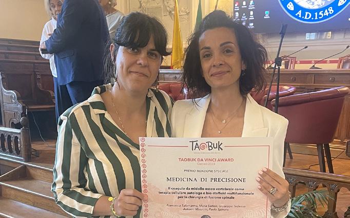 L’edizione 2023 del Taobuk Festival di Taormina, evento internazionale che ogni anno trasforma la città siciliana in luogo in cui la letteratura incontra le arti e la scienza, ha premiato durante i Taobuk Da Vinci Award Contest un progetto di ricerca del Rizzoli conferendogli il Premio menzione speciale medicina di precisione. Lo studio si intitola “Il coagulo da midollo osseo vertebrale come terapia cellulare autologa e bio-scaffold multifunzionale per la chirurgia di fusione spinale”. A ritirare il premio sono state Francesca Salamanna e Maria Sartori, ricercatrici del laboratorio Scienze e Tecnologie Chirurgiche diretto dal dottor Gianluca Giavaresi e rispettivamente Principal Investigator e Co-Principal Investigator del progetto svolto in collaborazione con gli specialisti Giuseppe Tedesco della Chirurgia Vertebrale, Antonio Mazzotti della Clinica I e Paolo Spinnato della Radiologia diagnostica ed interventistica del Rizzoli.