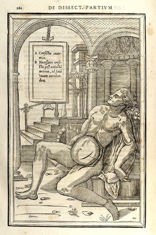 A conclusione di questo viaggio all’interno del libro De Dissectione viene presentata, sullo sfondo di architetture prospettiche cinquecentesche (fig. 1), la “messa in scena” di due figure femminili nel momento della loro gestazione (fig. 2). La realizzazione xilografica di tali immagini è stata attribuita all’incisore Jean Jollat (1490-1550). Lo studio della rappresentazione del genere femminile all’interno di altri testi antichi di medicina proseguirà nei prossimi numeri di IorNews.