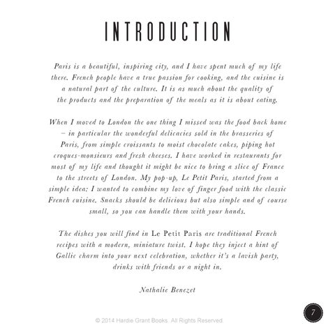 INTRODUCTION Paris is a be au tif u l, in spi ri n g c i t y, an d I hav e spe n t m u ch o f m y l i fe the re. Fre n ch pe ople hav e a t r u e passi o n fo r c o o k i n g , an d t he c u i si n e i s a n atu ral part of the c u l t u re. I t i s as m u ch abo u t t he qu al i t y o f t he produ cts an d the pre parat i o n o f t he m e al s as i t i s abo u t e at i n g. W he n I m ov e d to Lon don t he o n e t hi n g I m i sse d w as t he fo o d back ho me – in particu lar the w o n de rf u l de l i c ac i e s so l d i n t he brasse ri e s o f Paris, f rom sim ple croi ssan t s t o m o i st cho c o l at e c ak e s, pi pi n g ho t croqu e s-m on sie u rs an d f re sh che e se s. I hav e w o rk e d i n re st au ran t s fo r m ost of m y life an d th ou g ht i t m i g ht be n i c e t o bri n g a sl i c e o f Fran c e to the stre e ts of Lon don . M y po p- u p, Le Pe t i t Pa ri s, st art e d f ro m a sim ple ide a: I w an te d to c o m bi n e m y l o v e o f f i n g e r fo o d w i t h t he cl assic Fre n ch cu isin e. Sn ack s sho u l d be de l i c i o u s bu t al so s i m pl e an d o f c o u rse sm all, so you c an han dl e t he m w i t h yo u r han ds. T he dishe s you w ill f in d i n L e Peti t Pa r i s are t radi t i o n al Fre n ch re cipe s w ith a m ode r n , m i n i at u re t w i st . I ho pe t he y i n j e c t a hi n t o f G allic char m in to you r n e xt c e l e brat i o n , w he t he r i t ’s a l av i sh part y, drin k s w i t h f ri e n ds o r a n i g ht i n . Nat hal i e B e n eze t