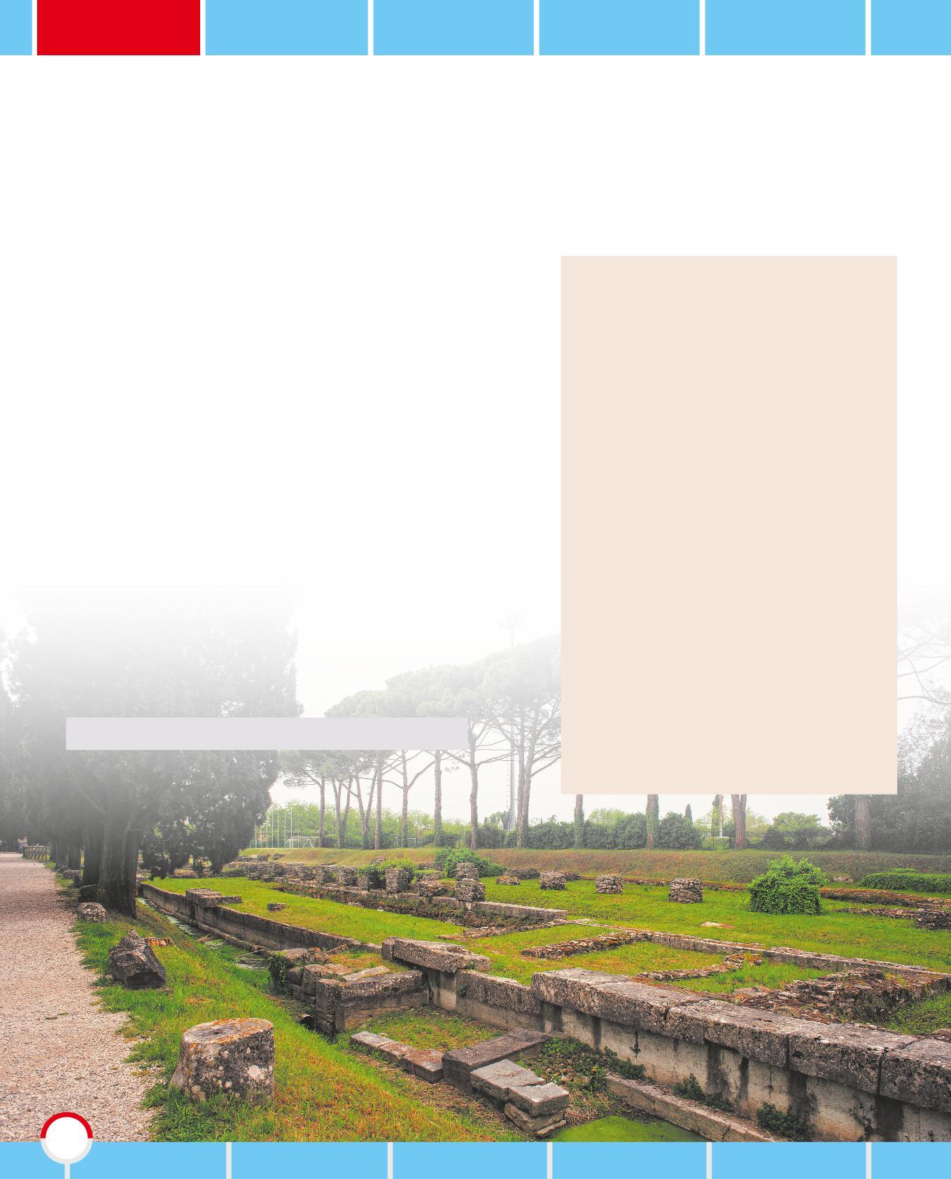 UNA COLONIA ROMANA IN ITALIA: AQUILEIA Gli antichi Romani fondarono in Italia la colonia di Aquileia, in un luogo strategico sia per la difesa dei confini, sia per la posizione geografica, vicino al Mare Adriatico e all’Europa centrale. La città romana, situata nell’attuale Regione del FriuliVenezia Giulia, risale al 181 a.C. Secondo le fonti, fu fondata per ospitare 3 000 soldati in congedo che dovevano difendere i vicini confini e coltivare i terreni, suddivisi secondo il metodo della centuriazione. Verso il III secolo d.C. la città giunse ad avere più di 100 000 abitanti. Aquileia, come Roma, sorgeva lungo un fiume navigabile molto vicino al mare ed era un importante centro commerciale, dove giungevano merci da tutto l’Impero. La città era nota per la lavorazione dei gioielli e del vetro e fu uno dei centri più grandi e ricchi dell’Impero romano, fino a quando, nel 452 d.C., fu saccheggiata e distrutta dal popolo degli Unni, guidati dal loro capo Attila.