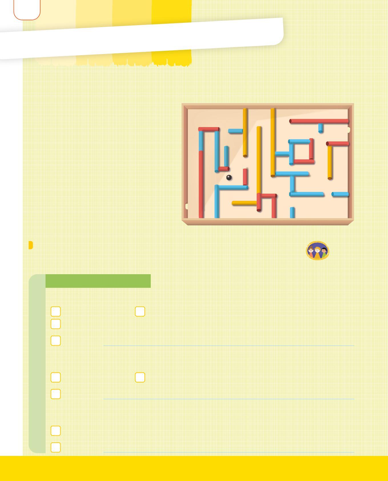 166 HAI MAI GIOCATO CON UN LABIRINTO PER LE BIGLIE? È UN GIOCO MOLTO DIVERTENTE: DEVI MUOVERE IL LABIRINTO PER GUIDARE UNA BIGLIA FINO ALL’USCITA. È UN GIOCO DI PERCORSI E DI EQUILIBRIO. ORA TOCCA A VOI. DIVIDETEVI IN GRUPPI DI TRE E RAGIONATE SU COME COSTRUIRE IL LABIRINTO. •QUALI MATERIALI PENSATE DI UTILIZZARE? CARTONE CANNUCCE LANA E STOFFA PER LE DECORAZIONI ESTERNE ALTRO: •QUALI STRUMENTI VI SERVONO? COLLA FORBICI ALTRO: •CHE COS’ALTRO VI SERVE? BIGLIE PER GIOCARE ALTRO: SCELTA DEI MATERIALI COMPITO DI REALTÀ IL LABIRINTO