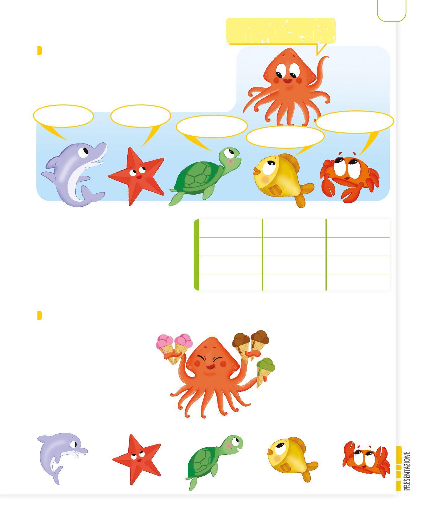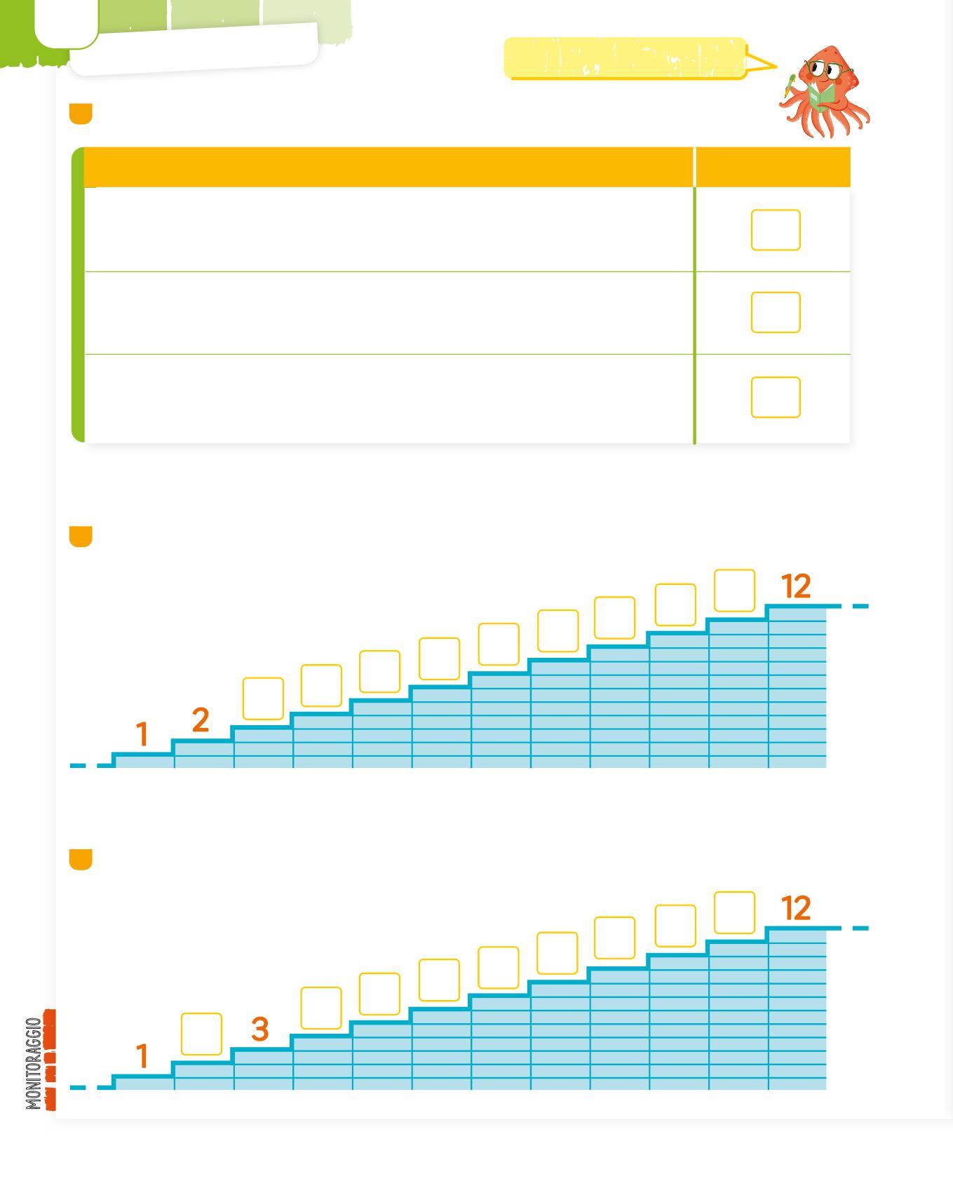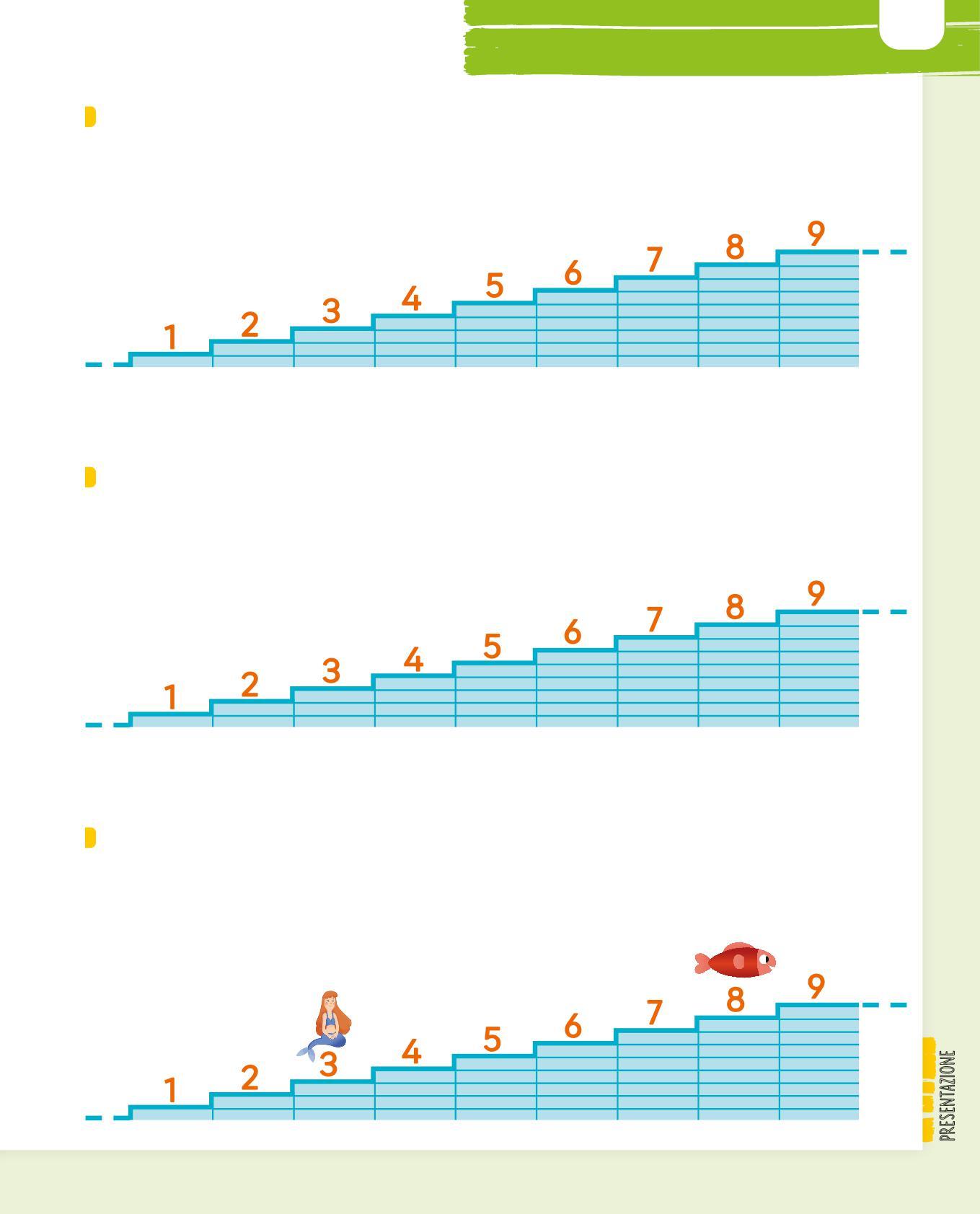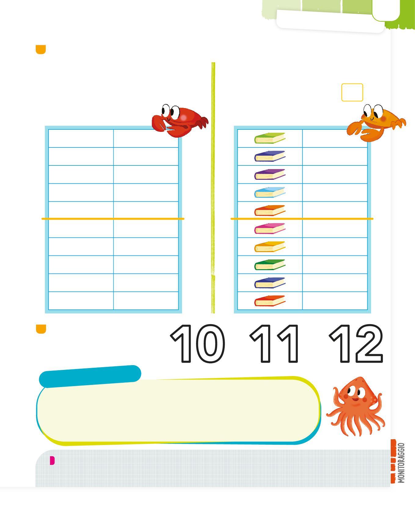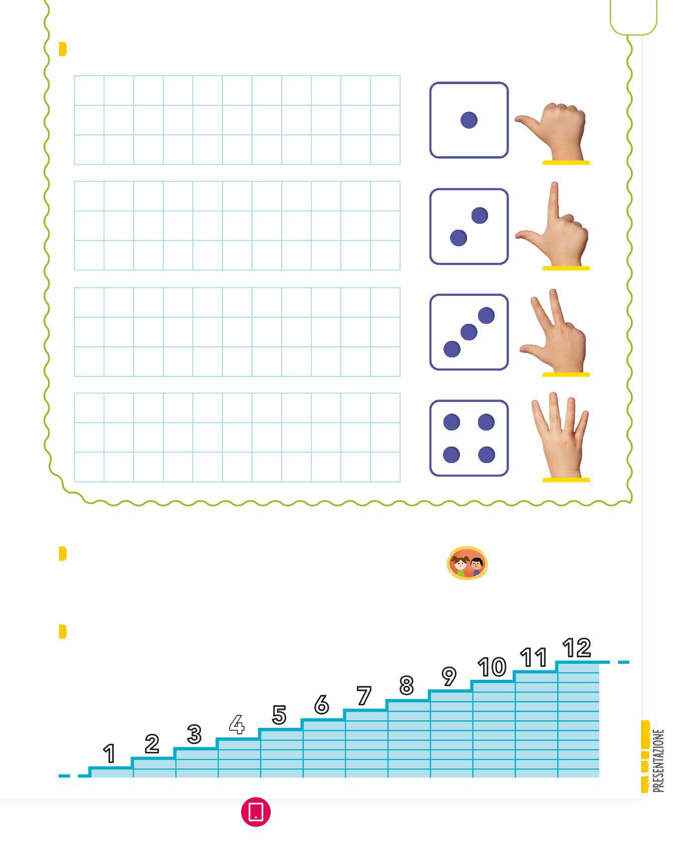 La storia di 1 • 2 • 3 • 4 9 I numeri 1 • 2 • 3 • 4 16 La storia di 5 17 Il numero 5 20 Indovina il numero 21 I numeri fino a 5 24 MONITORAGGIO I numeri fino a 5 26 I numeri fino a 5 28 La storia di 6 • 7 • 8 • 9 29 I numeri 6 • 7 • 8 • 9 35 Indovinate il numero! 36 Maggiore • minore • uguale 37 Precedente • successivo 38 MONITORAGGIO I numeri fino a 9 40 I numeri fino a 9 42 La storia di 0 43 Il numero 0 45 La storia della decina • 10 • 11 • 12 46 La decina e il 10 49 Gioco con la decina 50 I numeri 11 • 12 53 Numeri in codice 54 MONITORAGGIO I numeri fino a 12 56 I numeri fino a 12 58 Cubetti e contatab 59 HO IMPARATO I numeri fino a 12