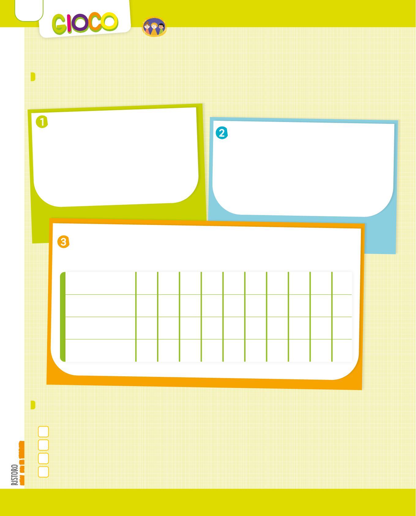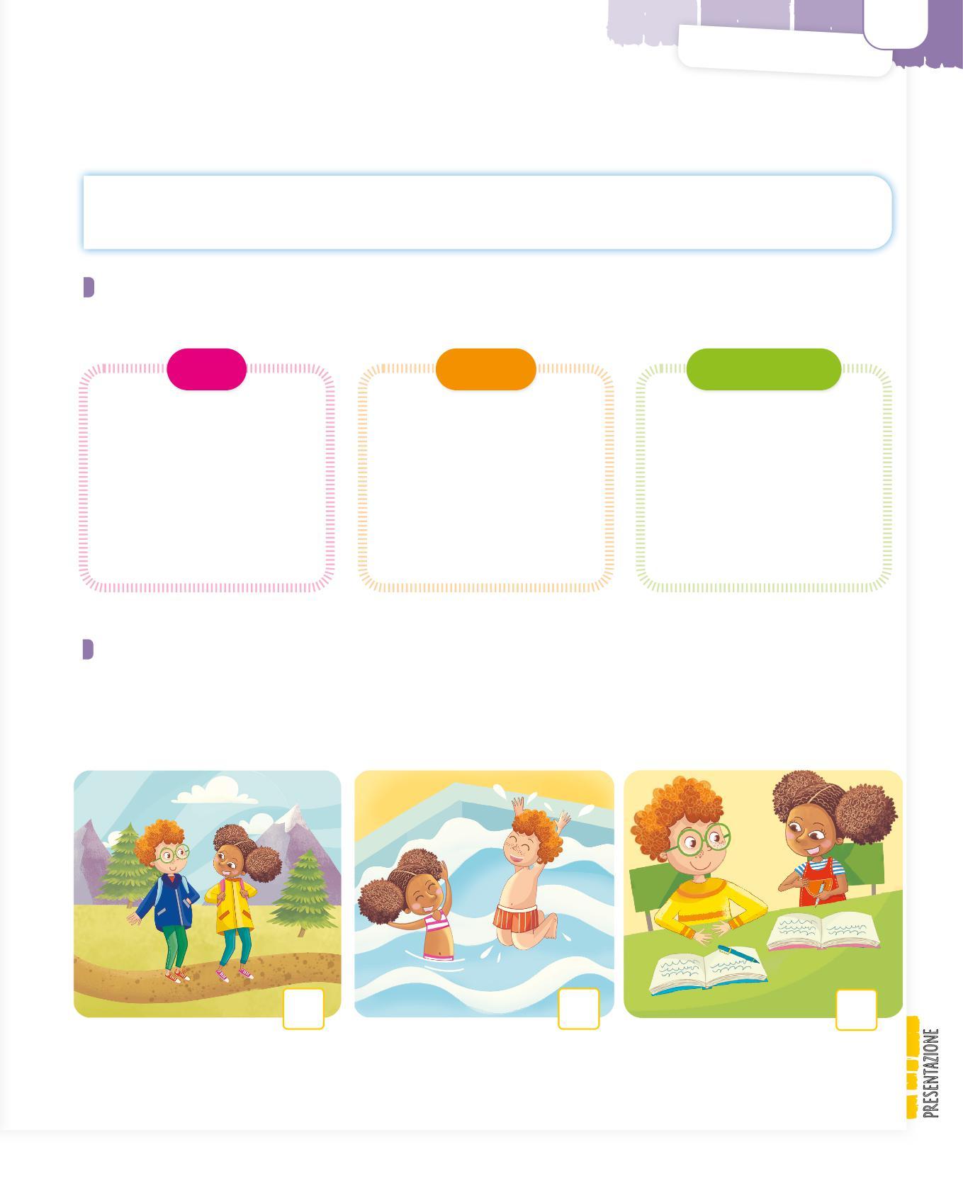 141 Il tempo intorno a te 142 Le parole del tempo • 1 143 Le parole del tempo • 2 144 Le parole del tempo 145 La durata 146 Quanto dura un gioco? 147 Ieri • Oggi • Domani 148 La giornata 149 La settimana 150 La tua settimana 151 Mi oriento nella settimana 152 I mesi e l’anno 153 Filastrocca dei mesi 154 Le stagioni 155 Le stagioni sugli alberi 156 Passato • Presente • Futuro