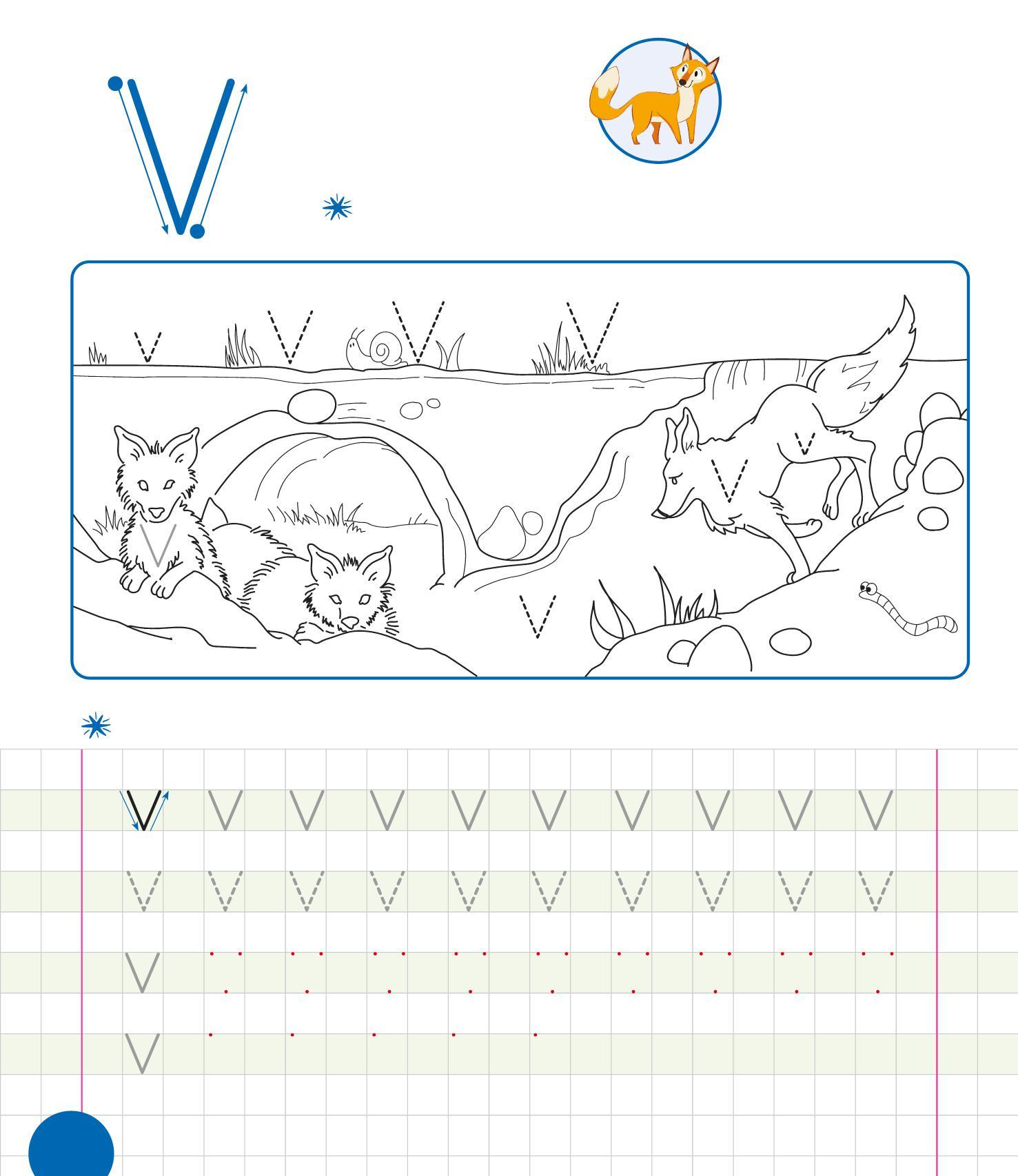 RIPASSA LE V, POI TRACCIANE ALTRE SUL PRATO. COLORA IL DISEGNO.