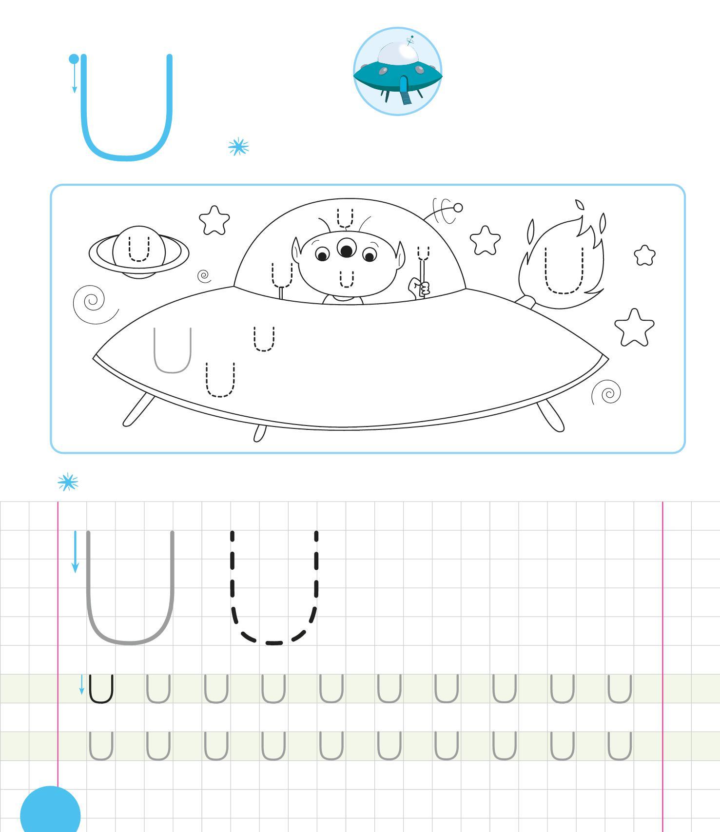 RIPASSA LE U, POI TRACCIANE ALTRE SULL’UFO. COLORA IL DISEGNO.