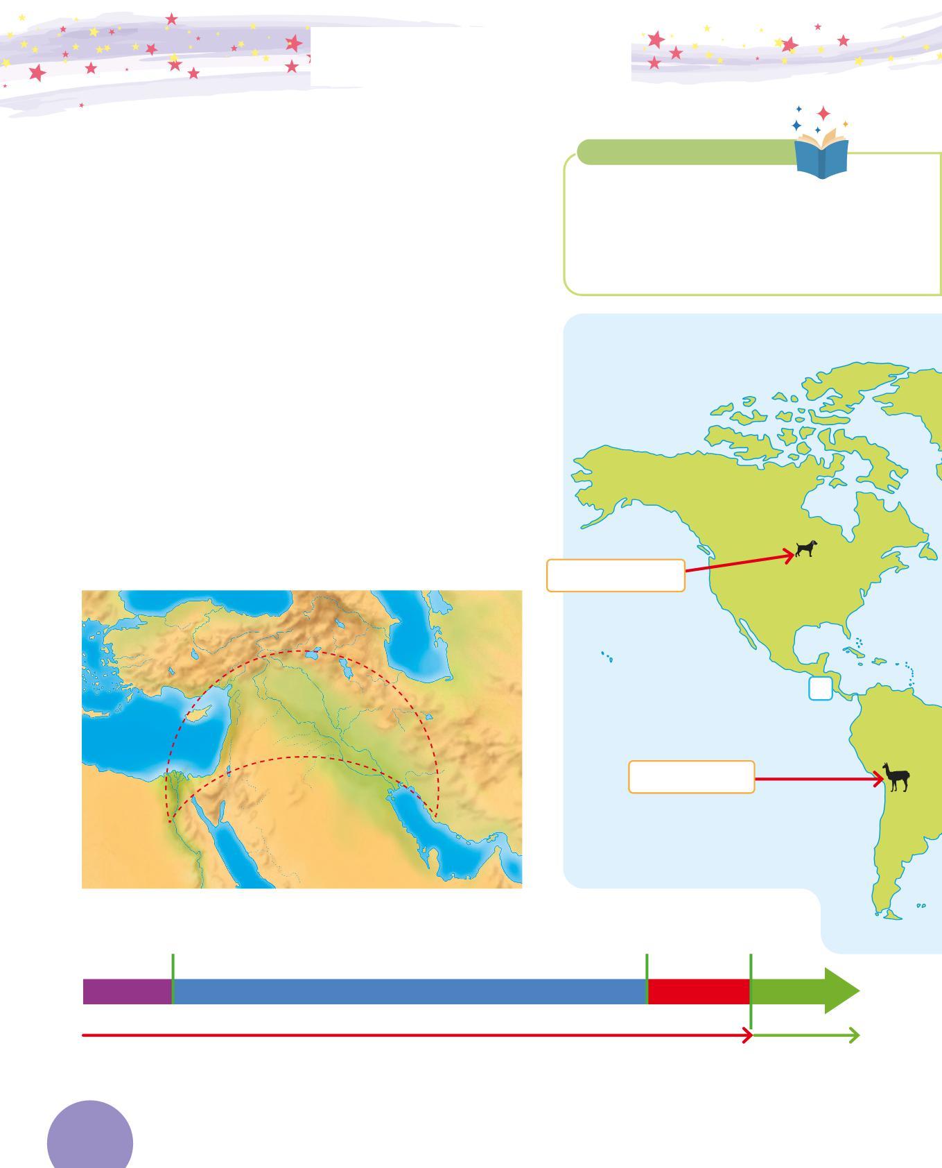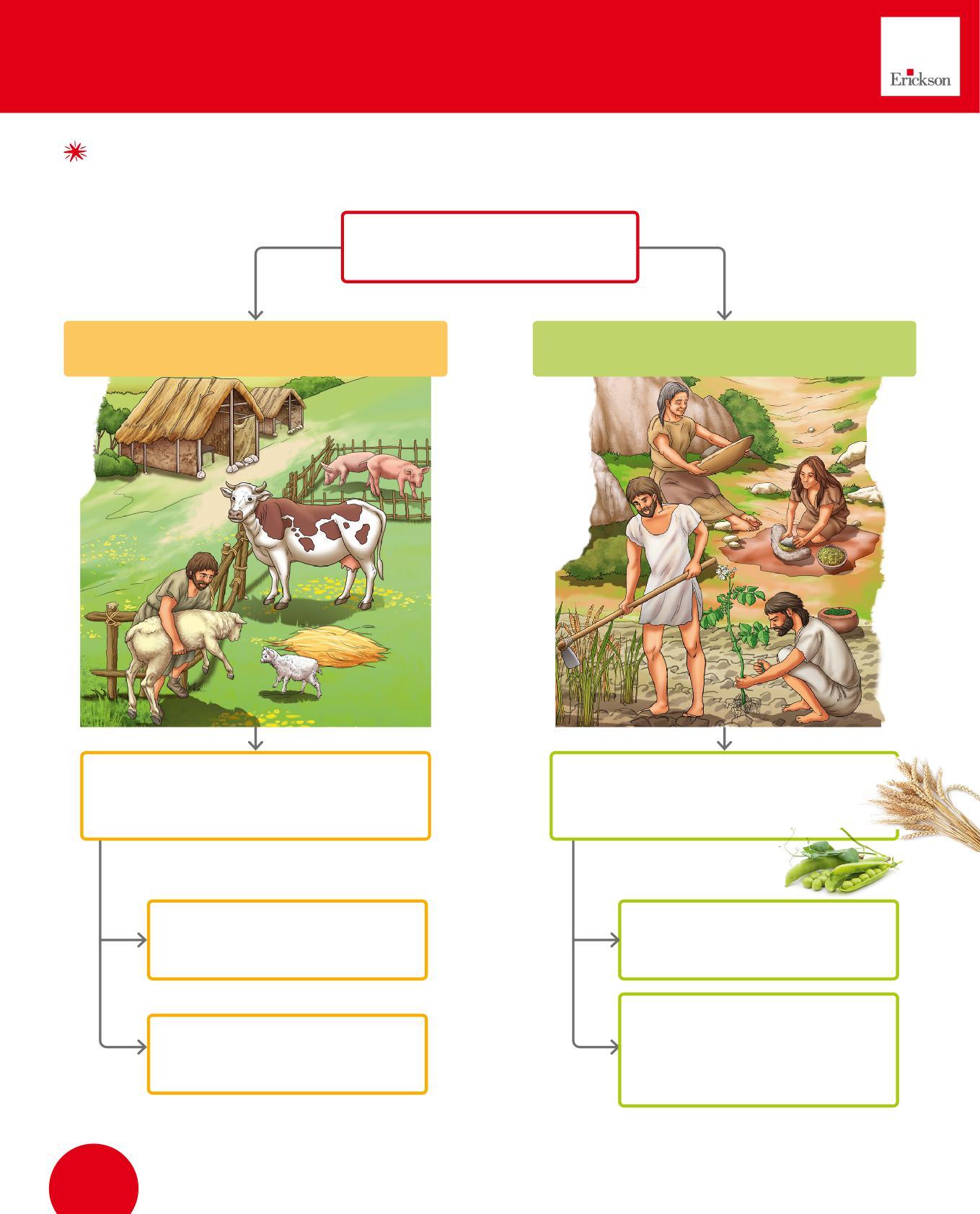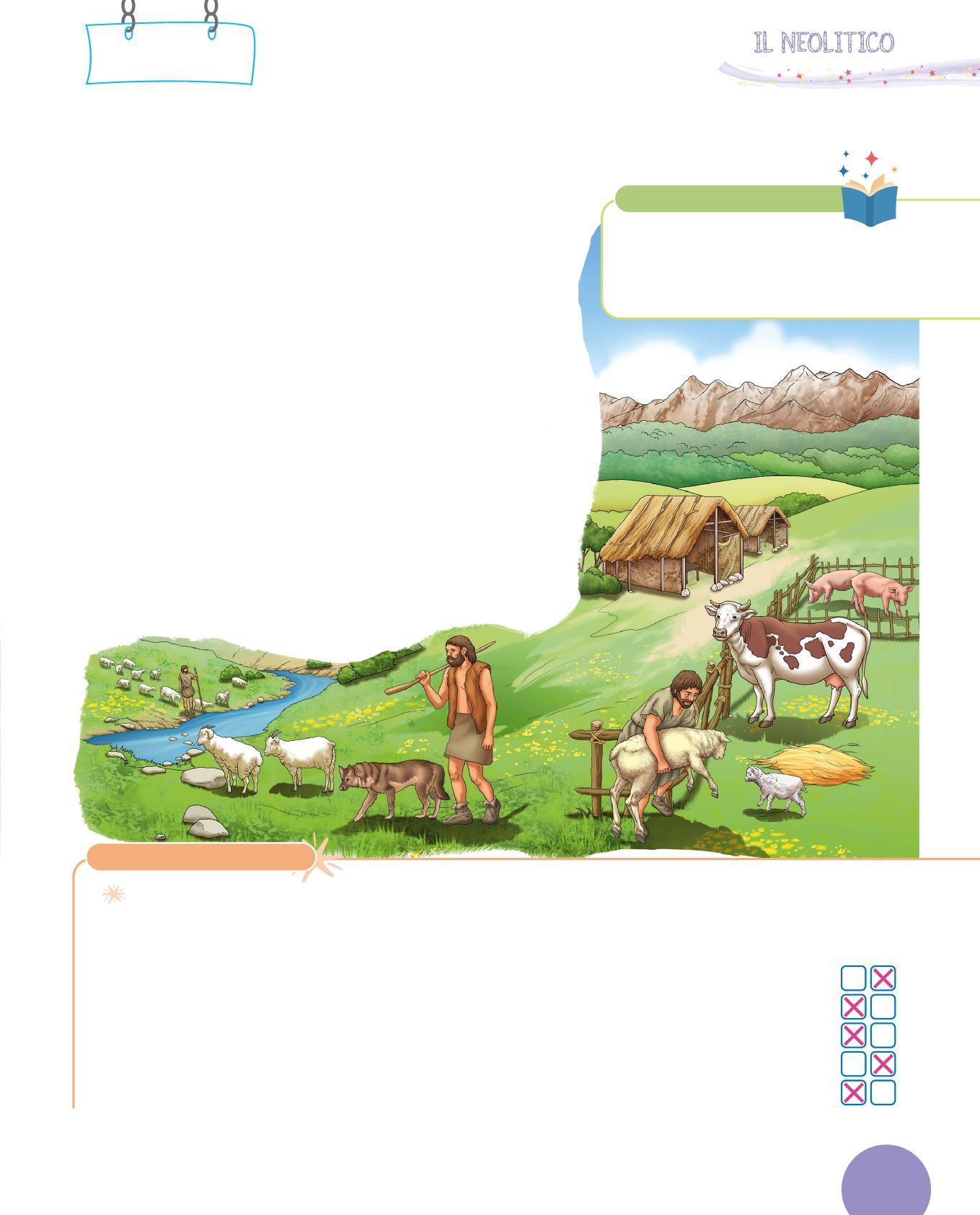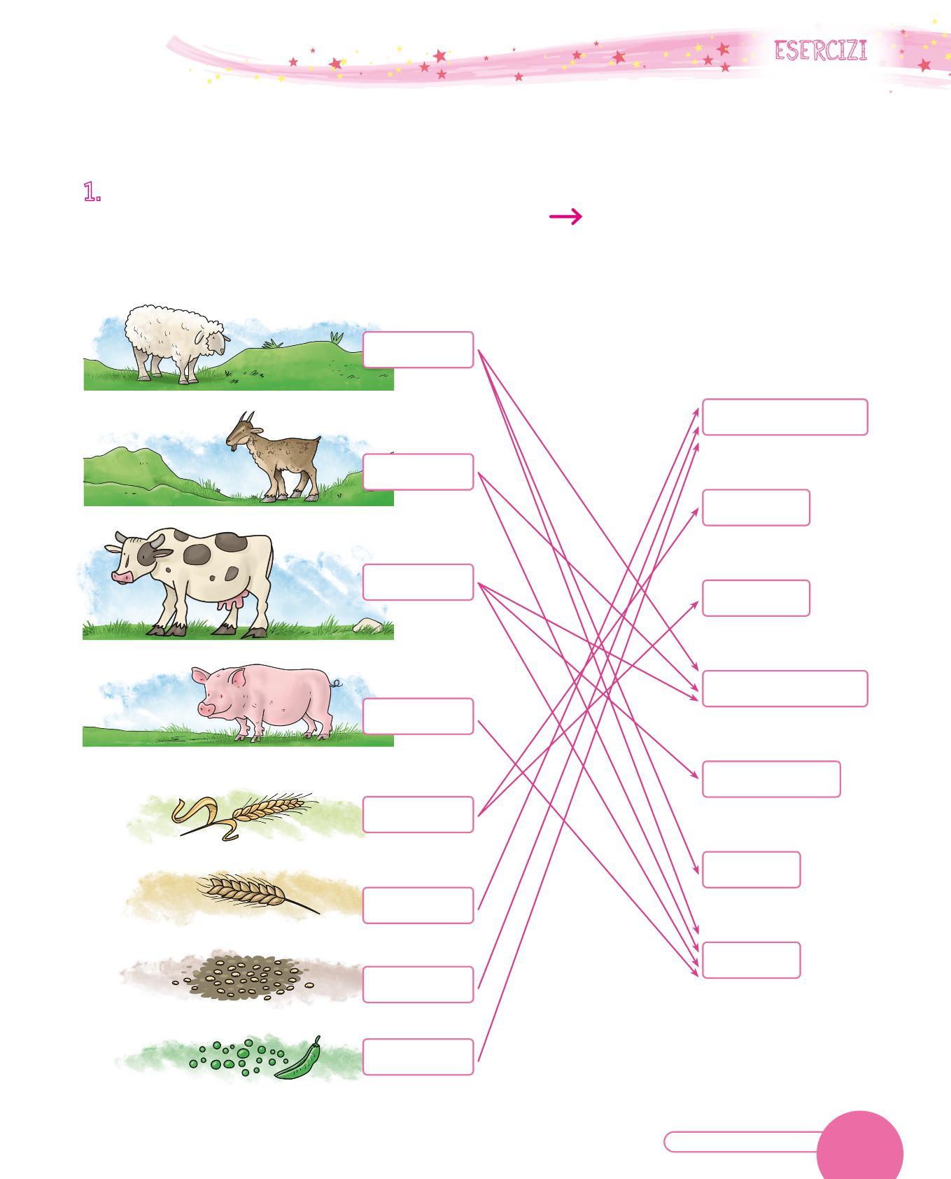 1. Scopri quali animali allevavano e quali piante coltivavano gli uomini e le donne del Neolitico, poi collegali con una ai prodotti che fornivano. Attenzione: un animale o una pianta possono dare più prodotti, e animali diversi possono dare lo stesso prodotto.