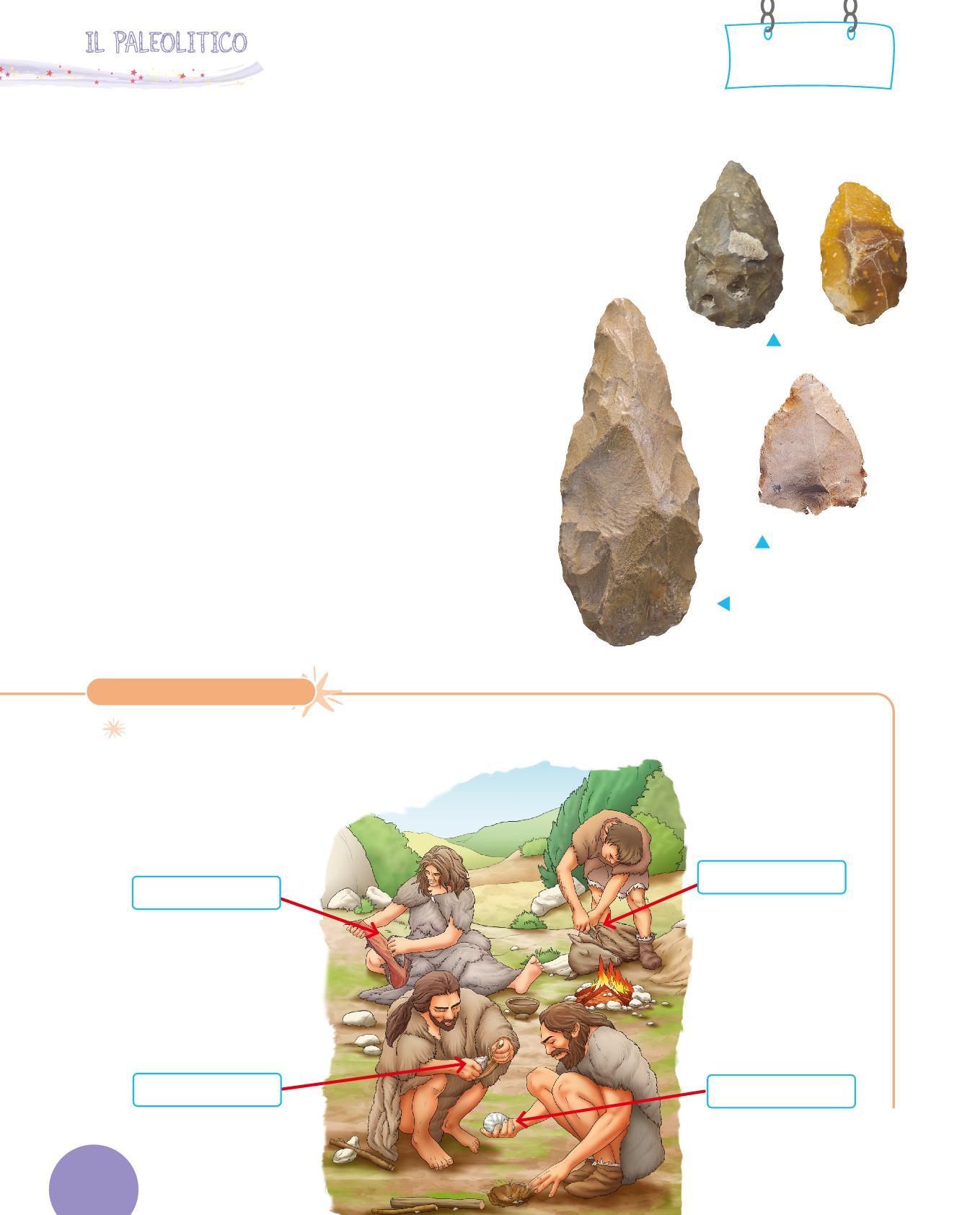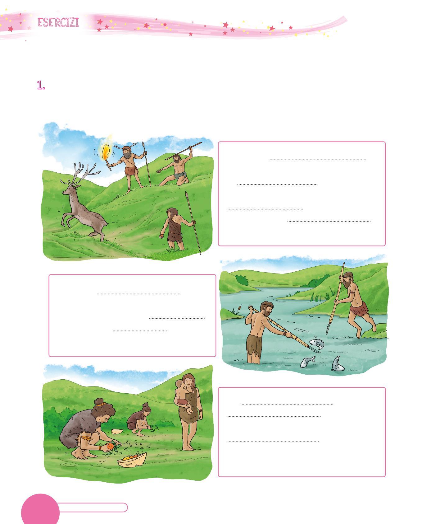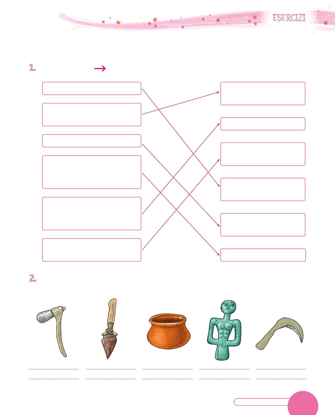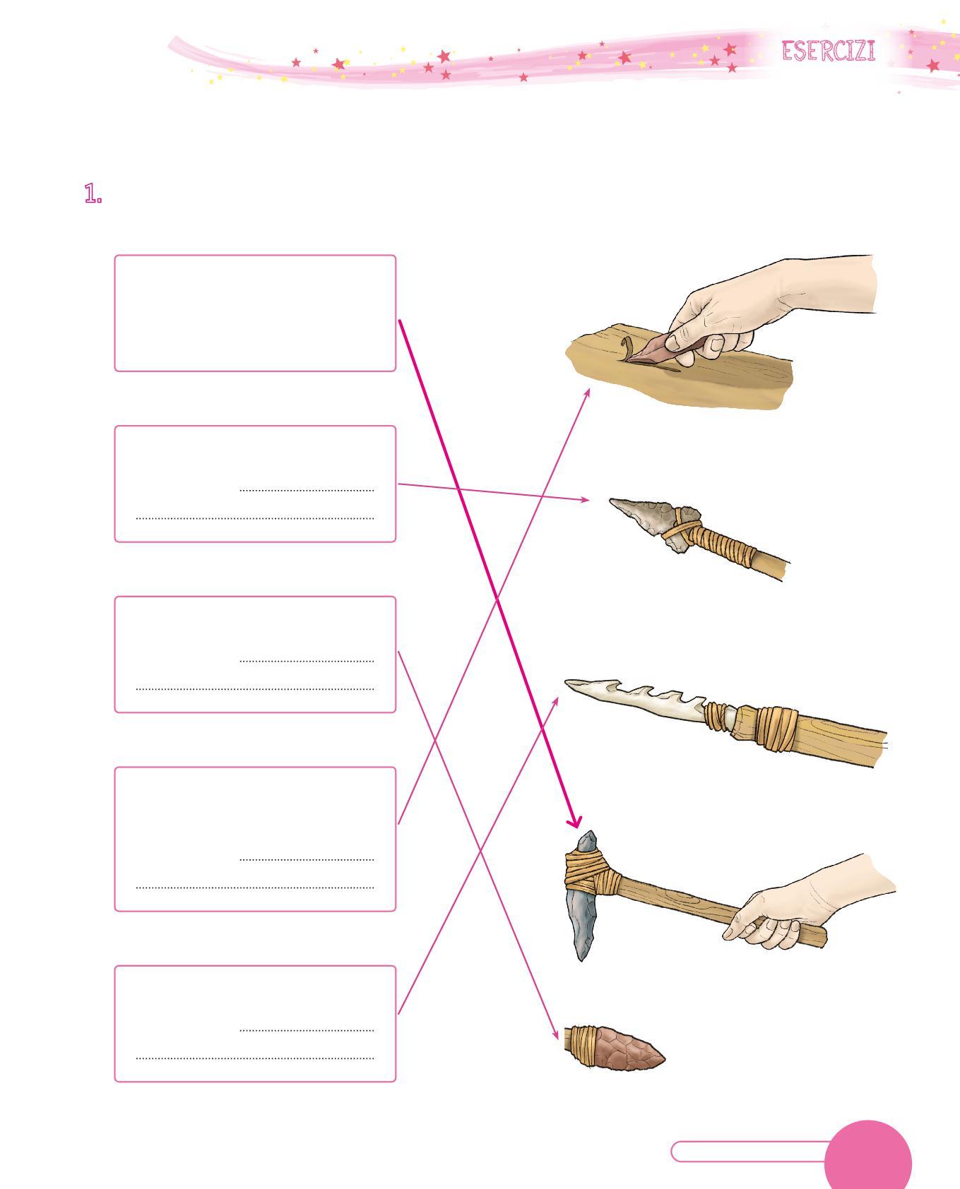 1. Collega con una freccia ogni utensile dei Sapiens al suo uso. Poi osserva i disegni e scrivi sotto con quale materiale era realizzato. Segui l’esempio.