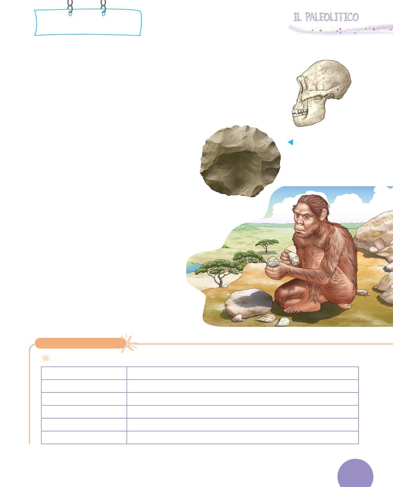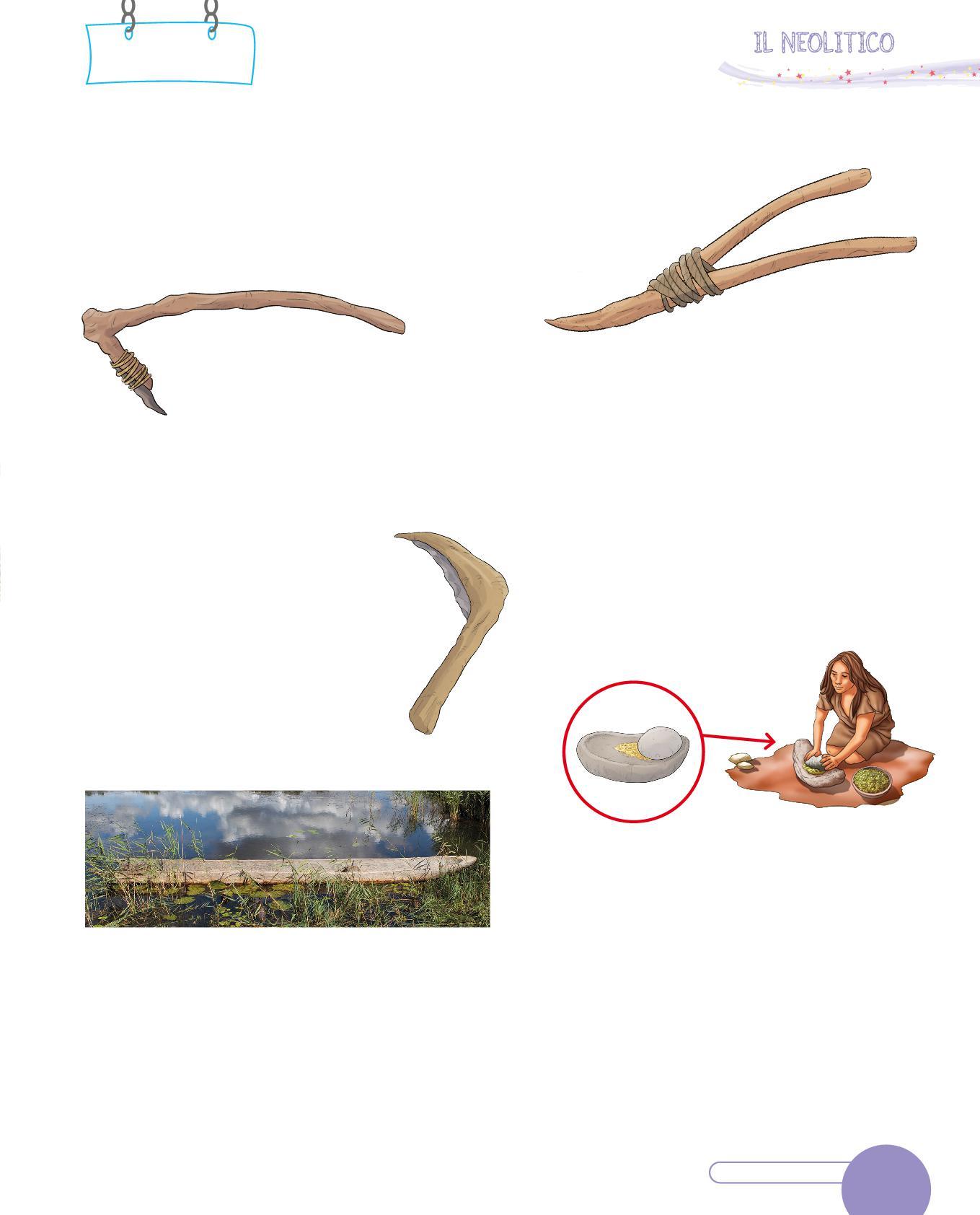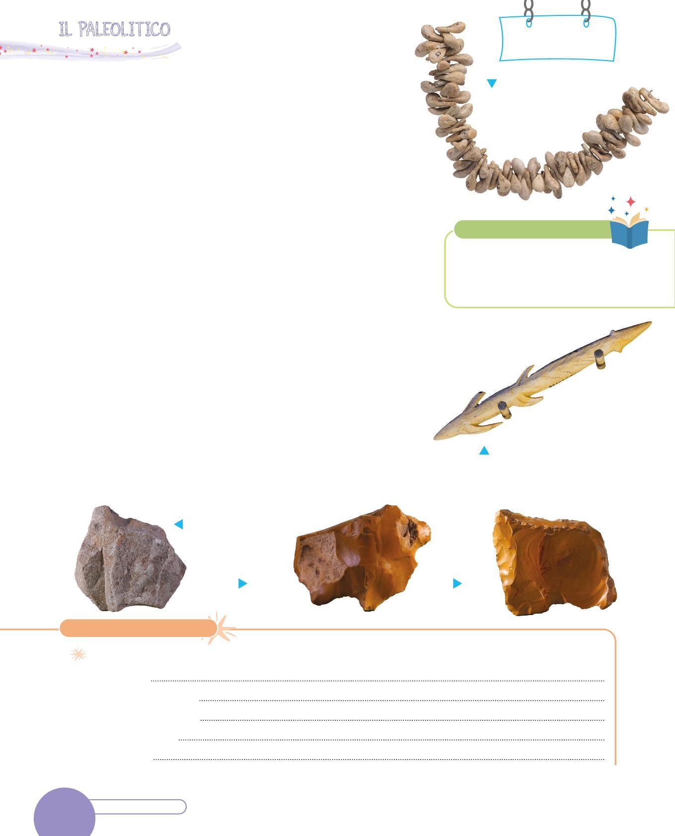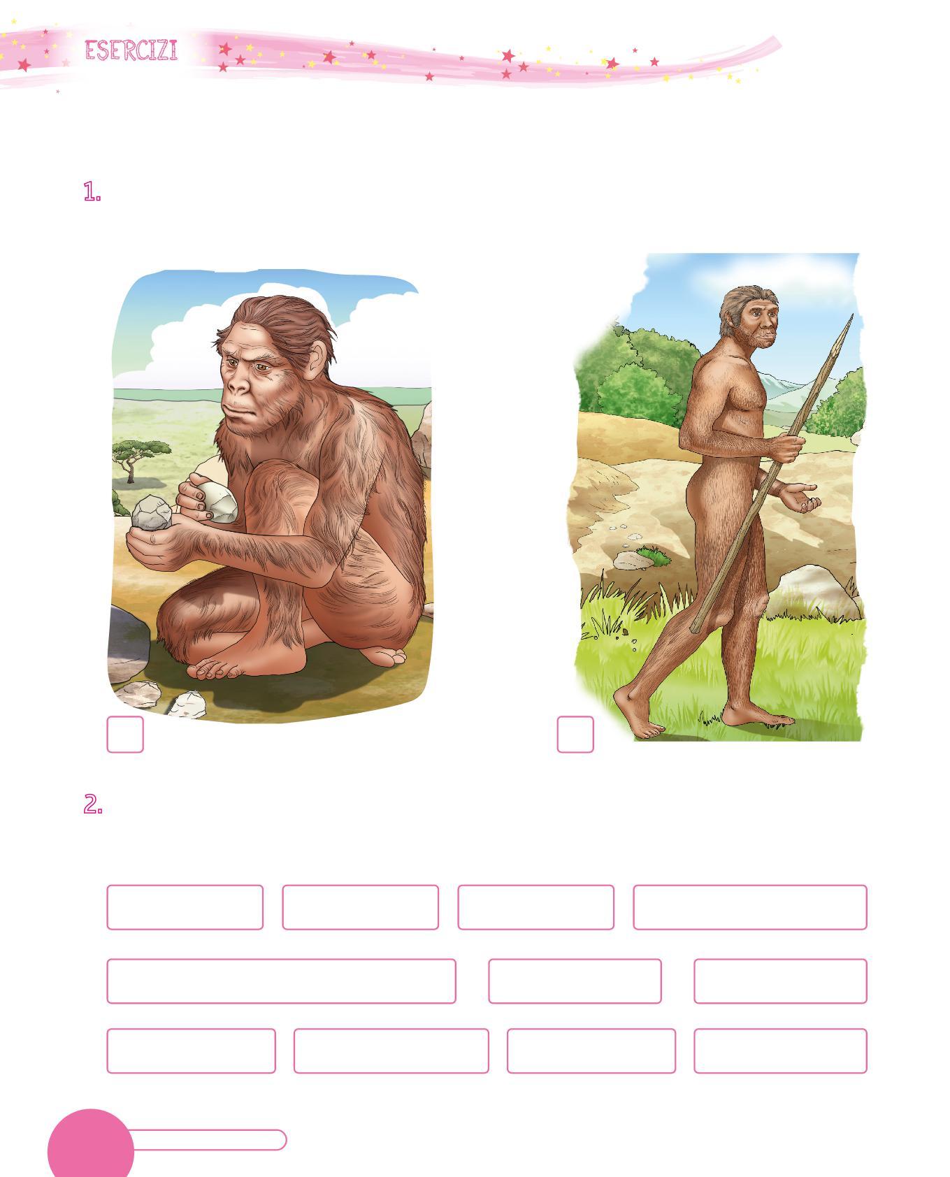 1. Collega con una freccia ogni utensile dei Sapiens al suo uso. Poi osserva i disegni e scrivi sotto con quale materiale era realizzato. Segui l’esempio.