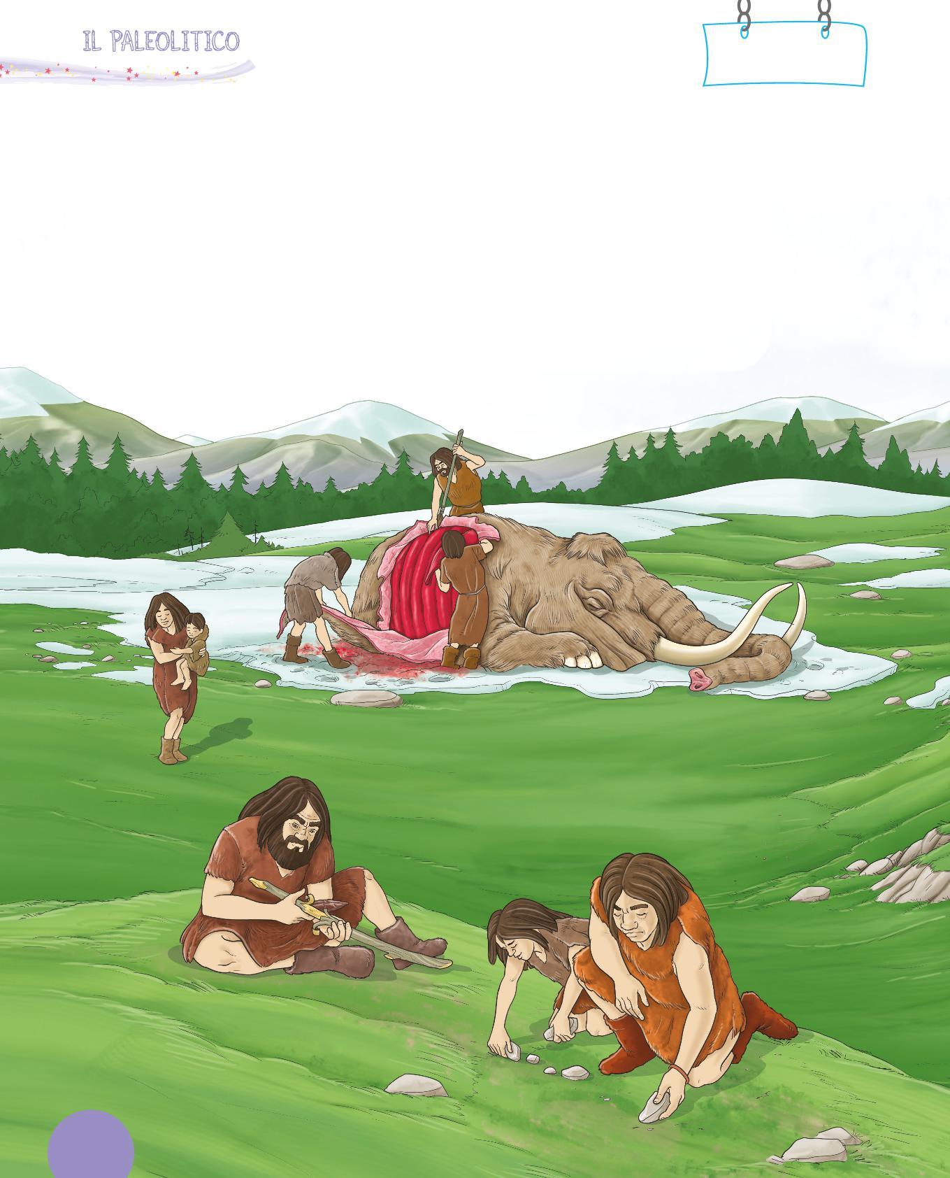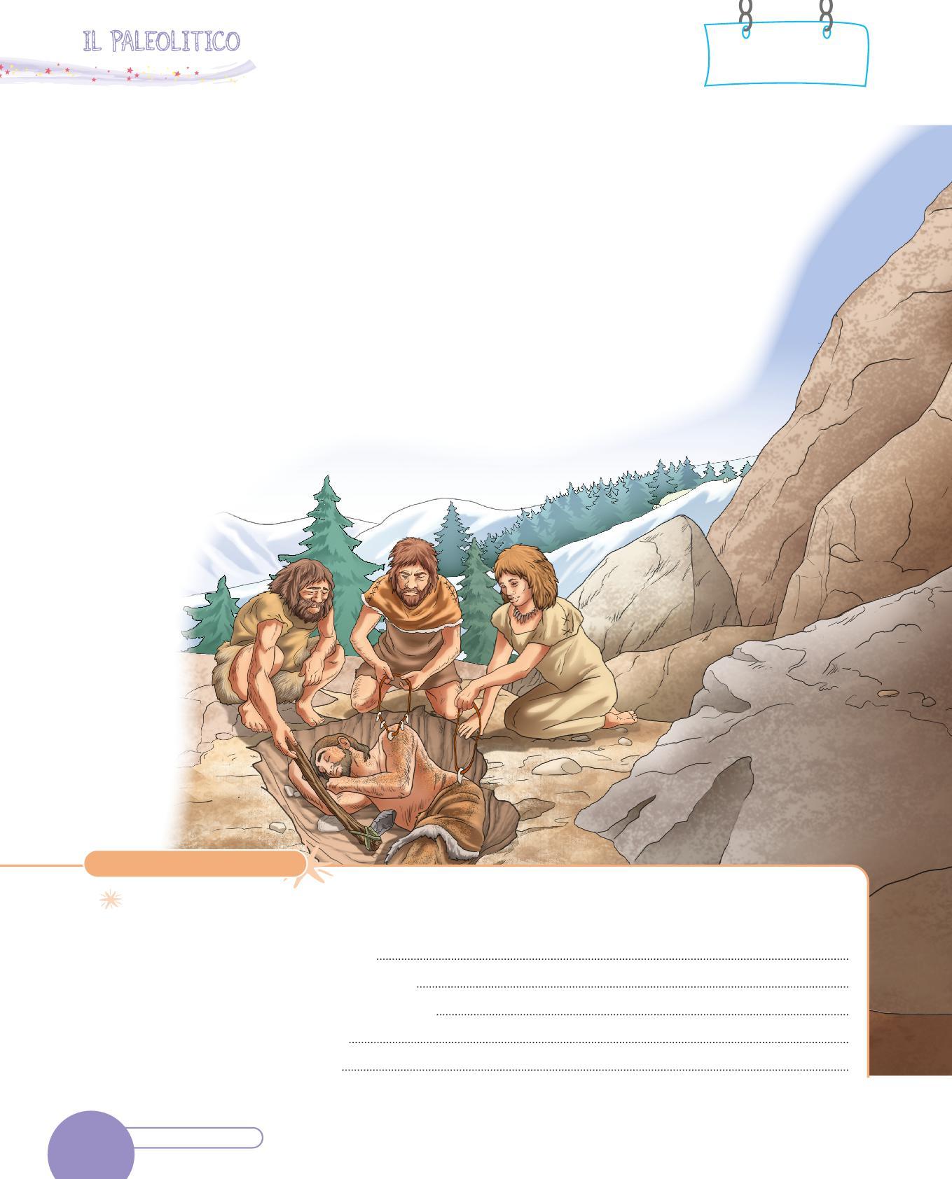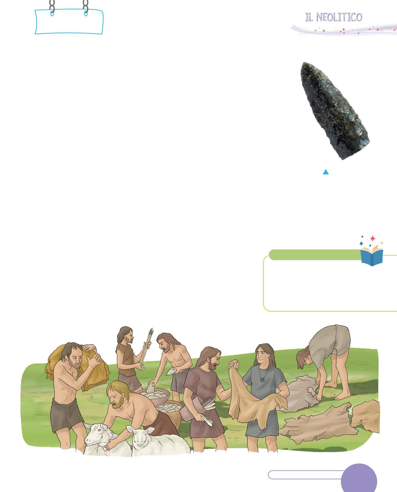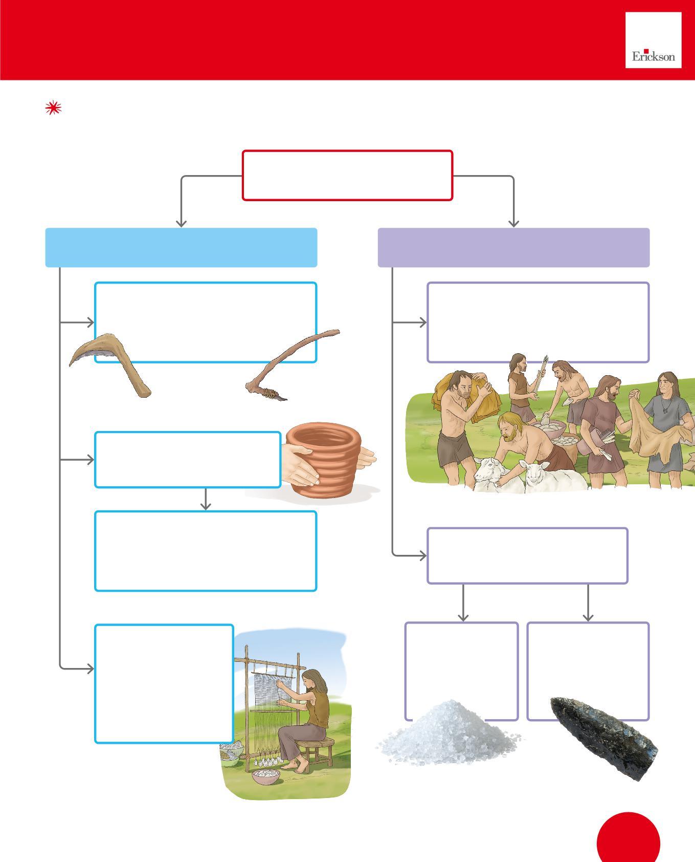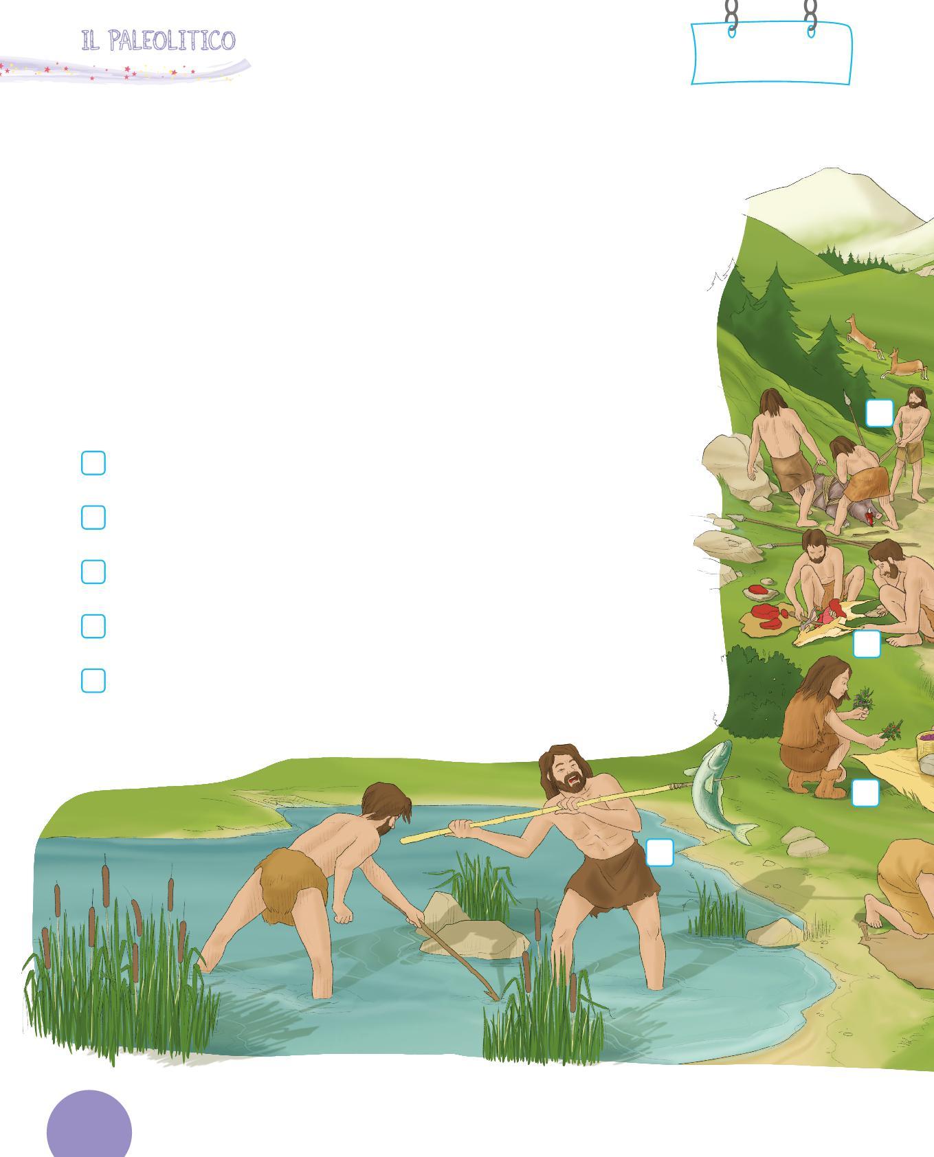 1. Collega con una freccia ogni utensile dei Sapiens al suo uso. Poi osserva i disegni e scrivi sotto con quale materiale era realizzato. Segui l’esempio.