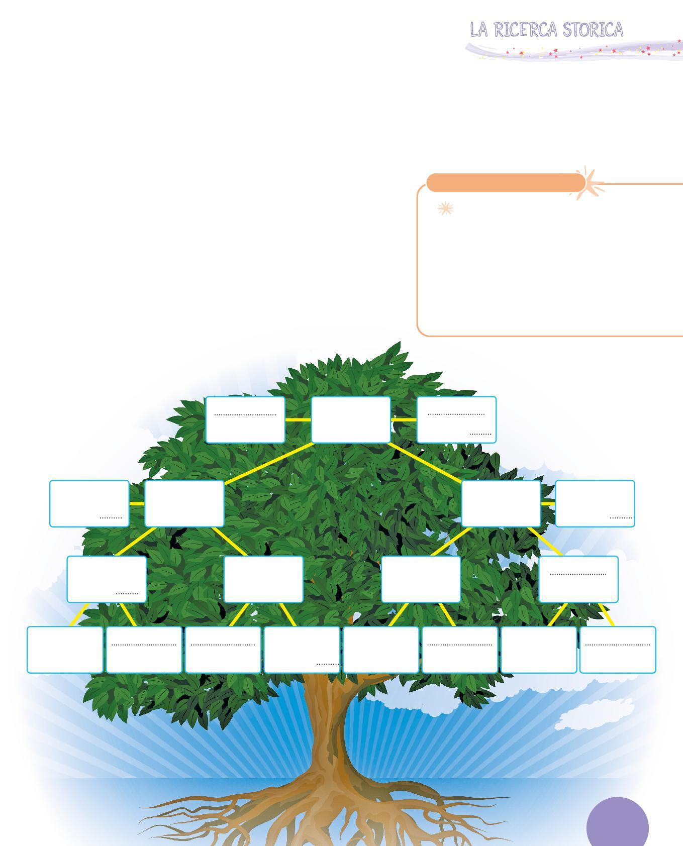 Quando si passa da genitori a figli si dice che è trascorsa una generazione. Le storiche e gli storici per rappresentare le generazioni di una famiglia utilizzano l’albero genealogico. È un albero speciale, dove le foglie sono le persone che appartengono a una stessa famiglia e i rami sono i legami che le uniscono. La generazione più giovane occupa i rami più alti e quella più vecchia occupa i rami più bassi. Quando in una famiglia nasce una bambina o un bambino, si aggiunge all’albero una foglia e il relativo ramo.