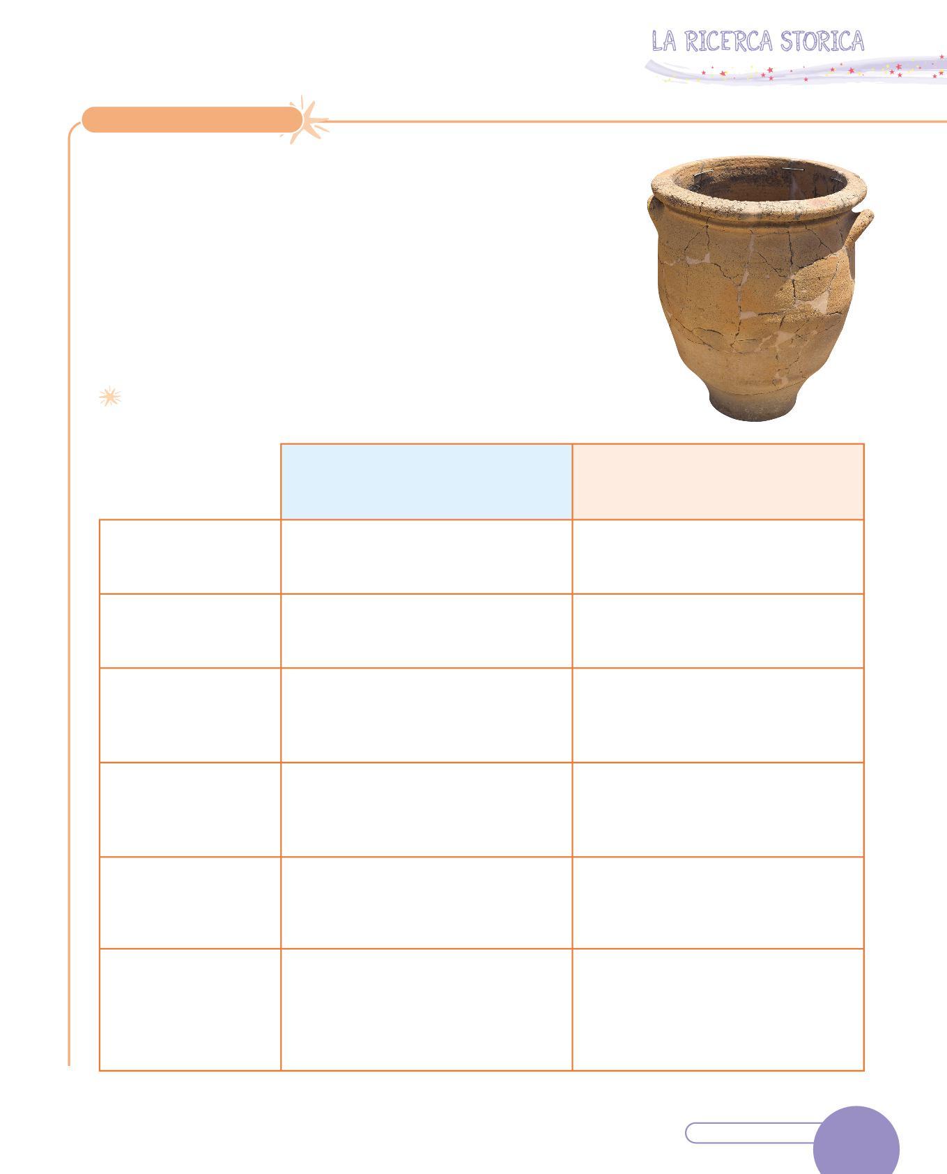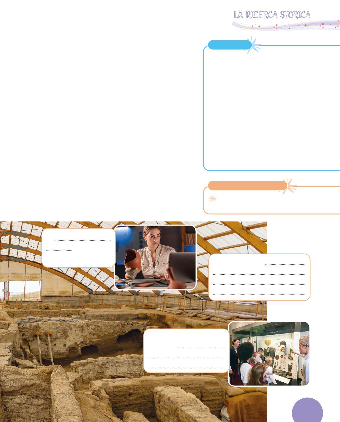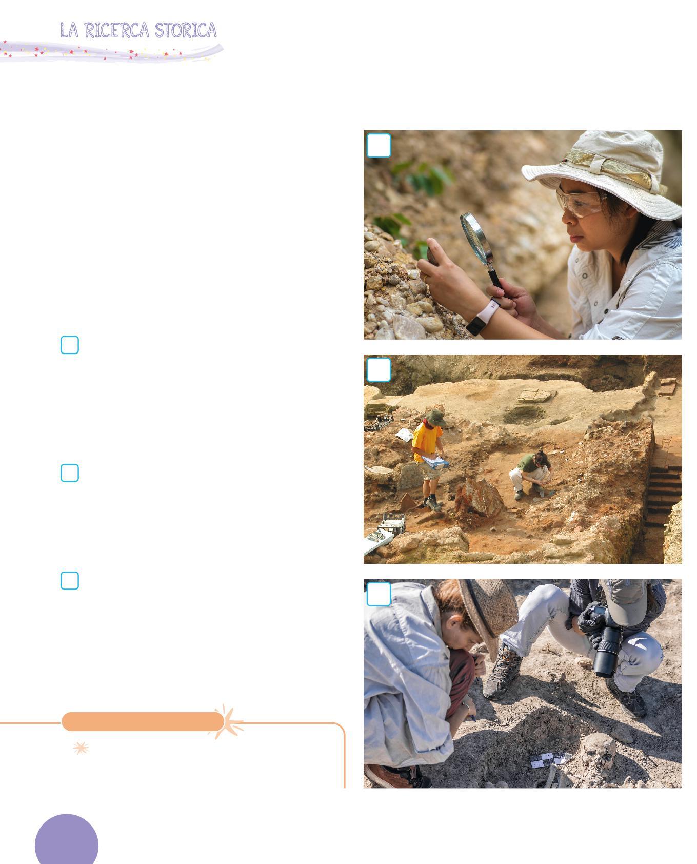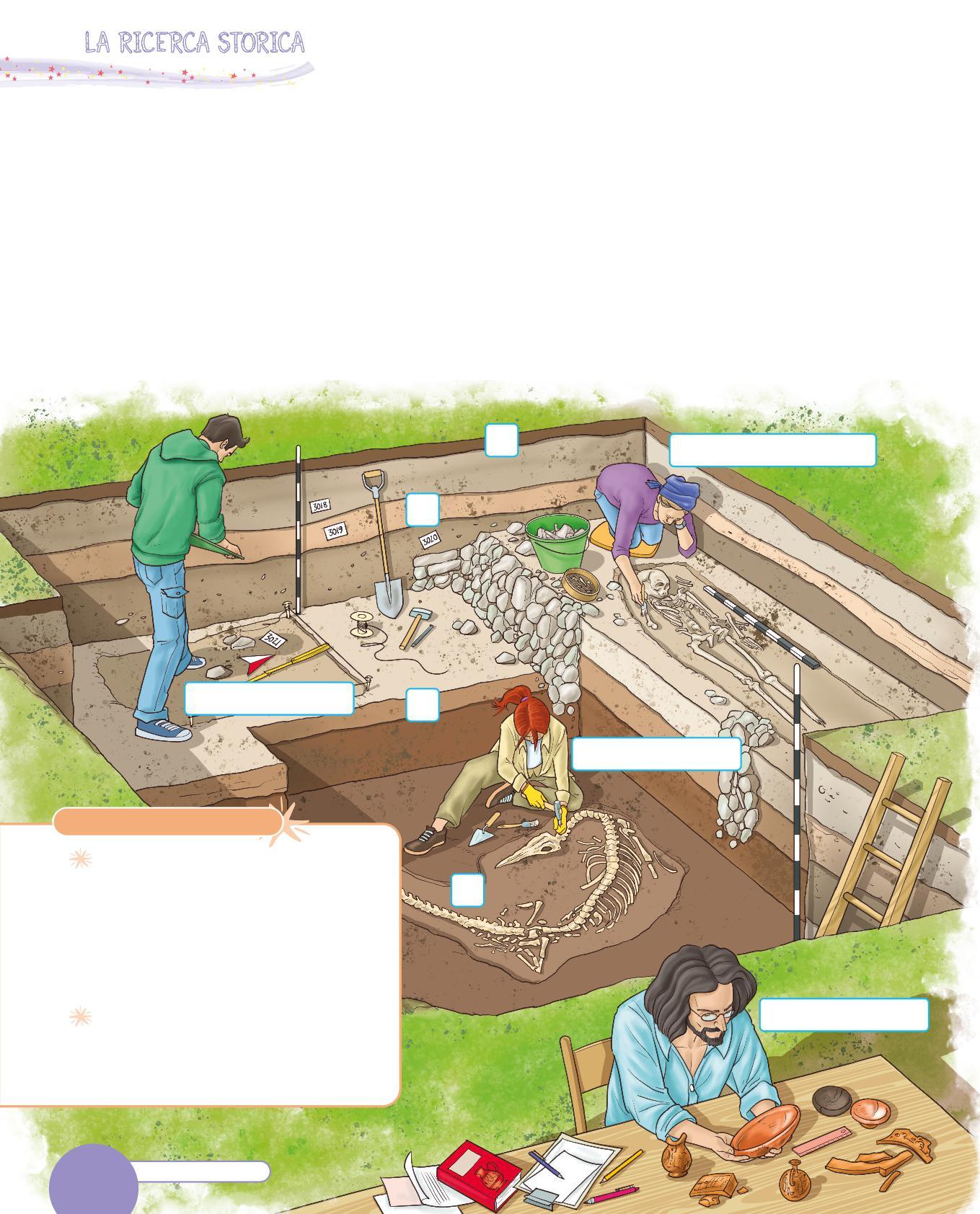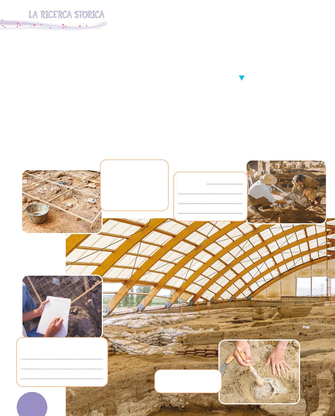 1 L’archeologa e l’archeologo studiano i reperti, cioè oggetti, resti di edifici, resti di cibo, che sono rimasti sepolti sottoterra. Grazie a questi, ricostruiscono il passato degli esseri umani.