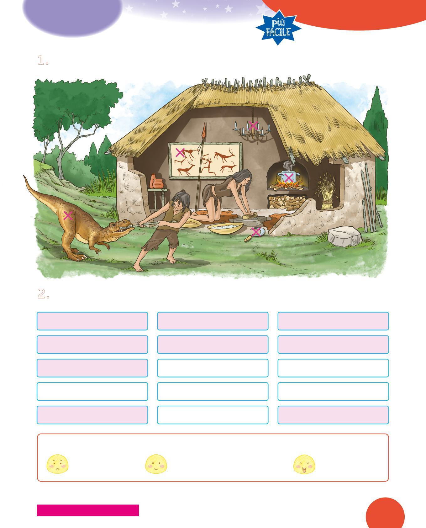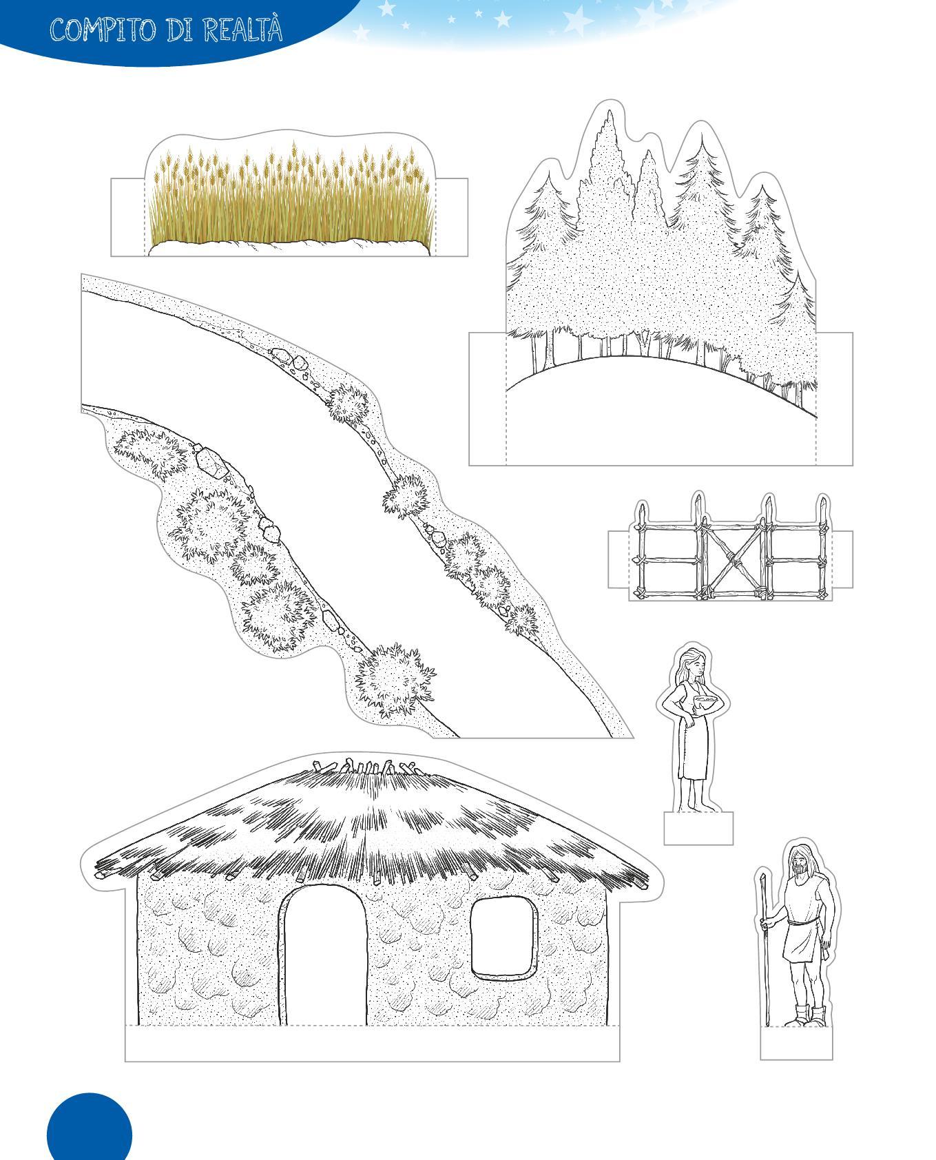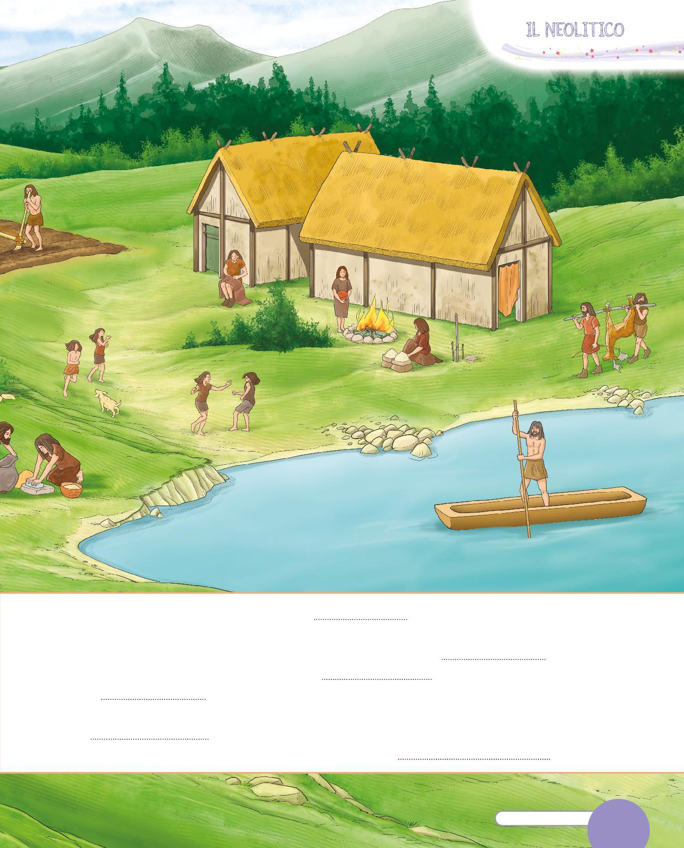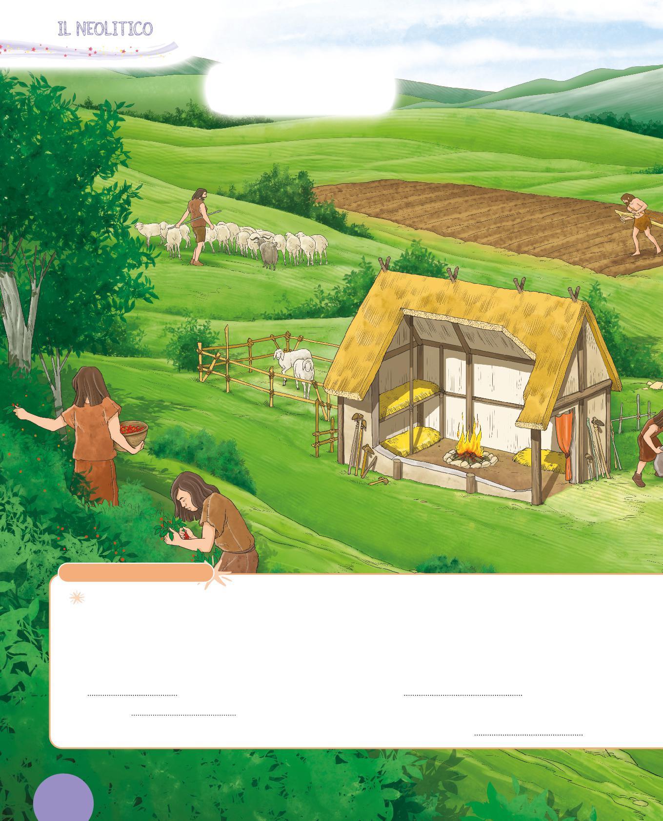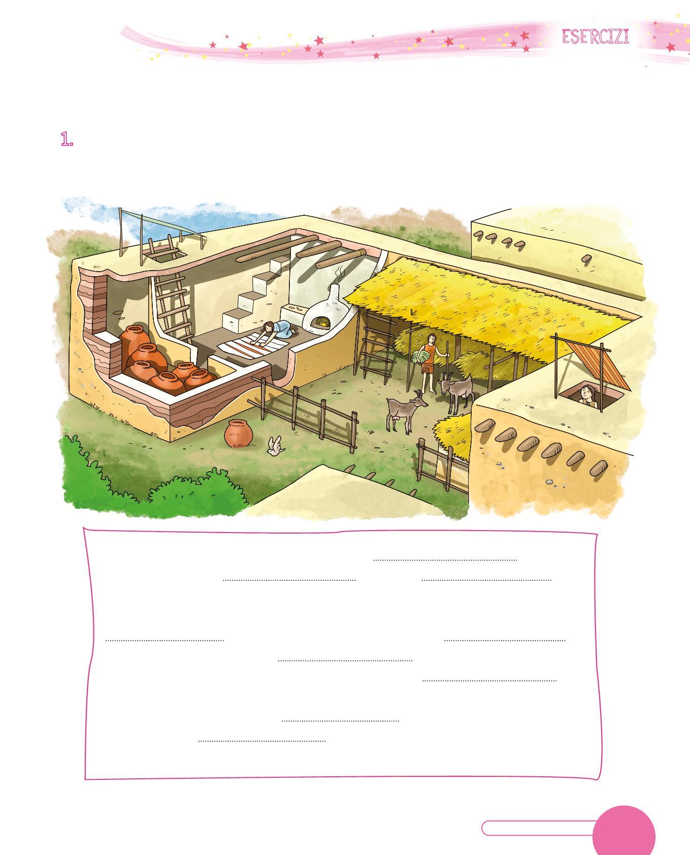 1. Osserva il disegno di un’abitazione del Neolitico e completa la descrizione con le parole sotto. Scegli tra: paglia • porta • tetto • legno • tessuti • mattoni • vasi • stalla • stanza