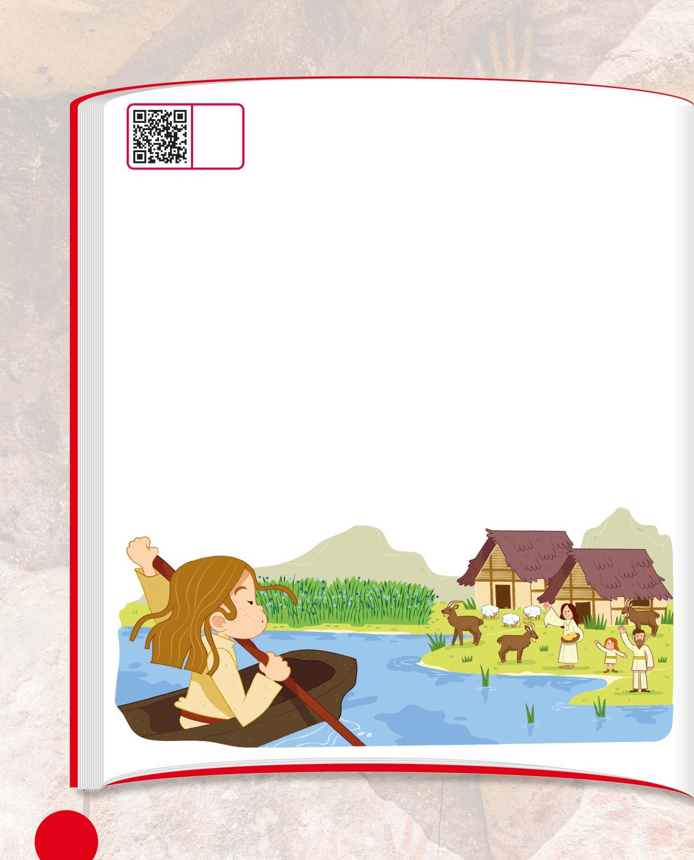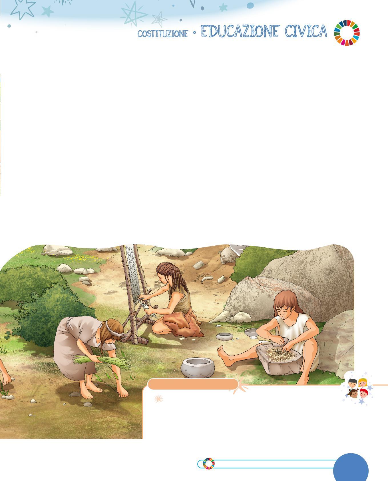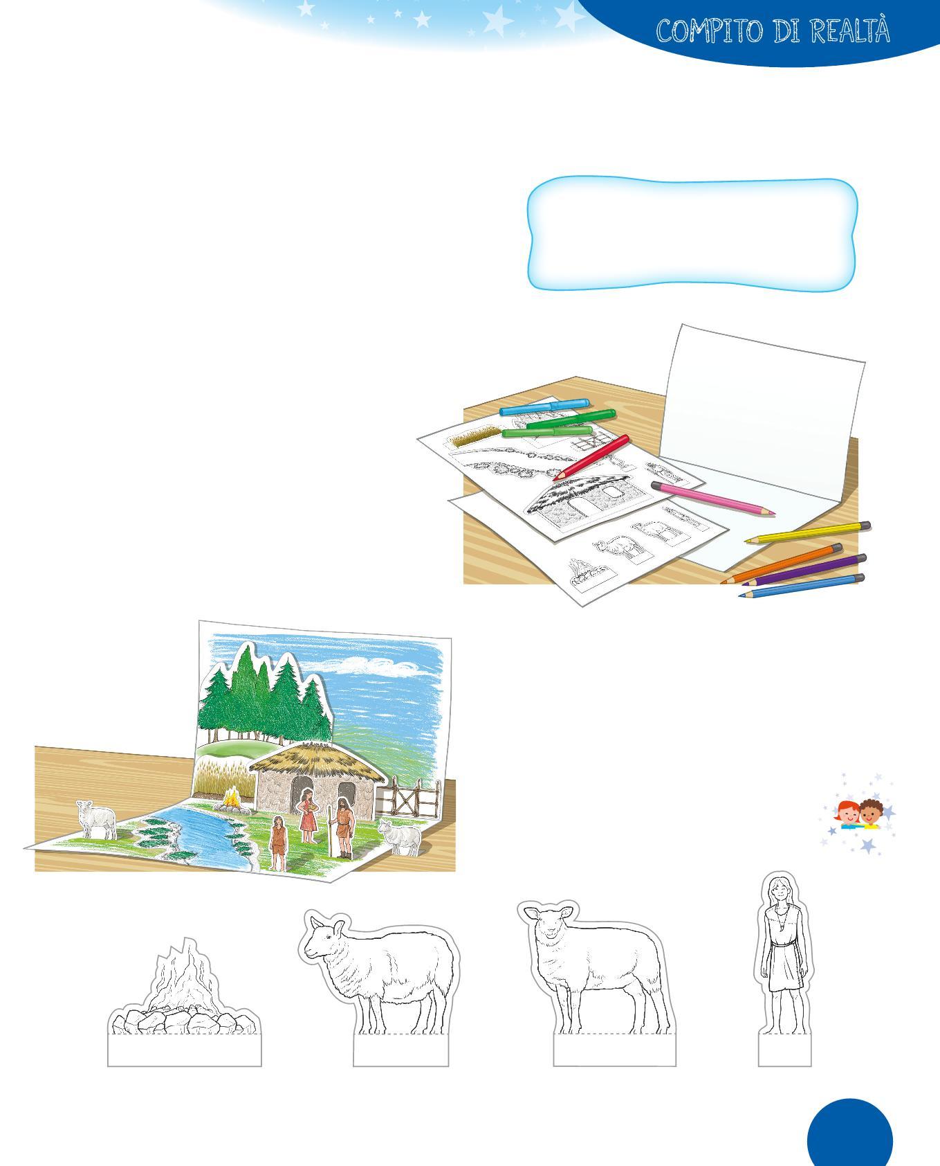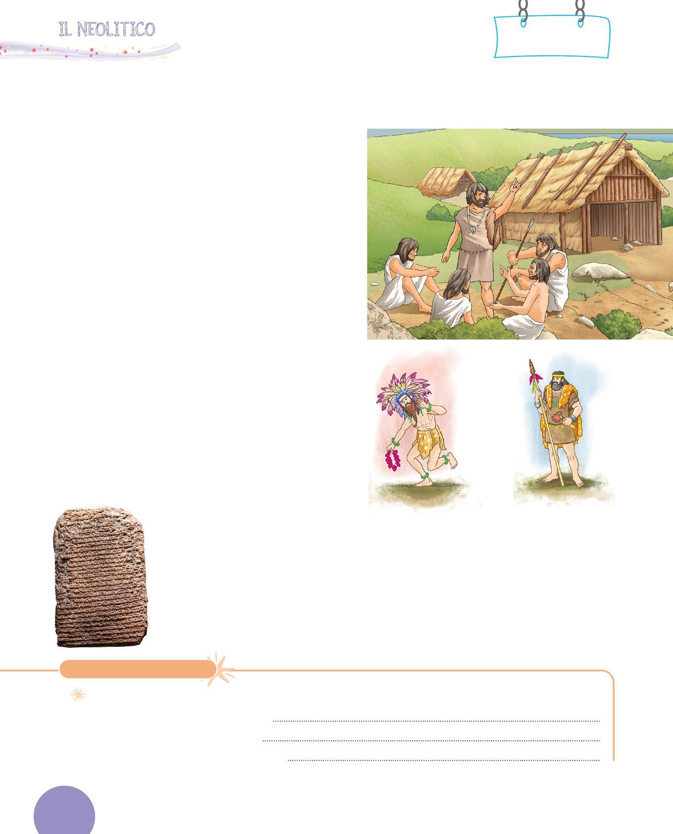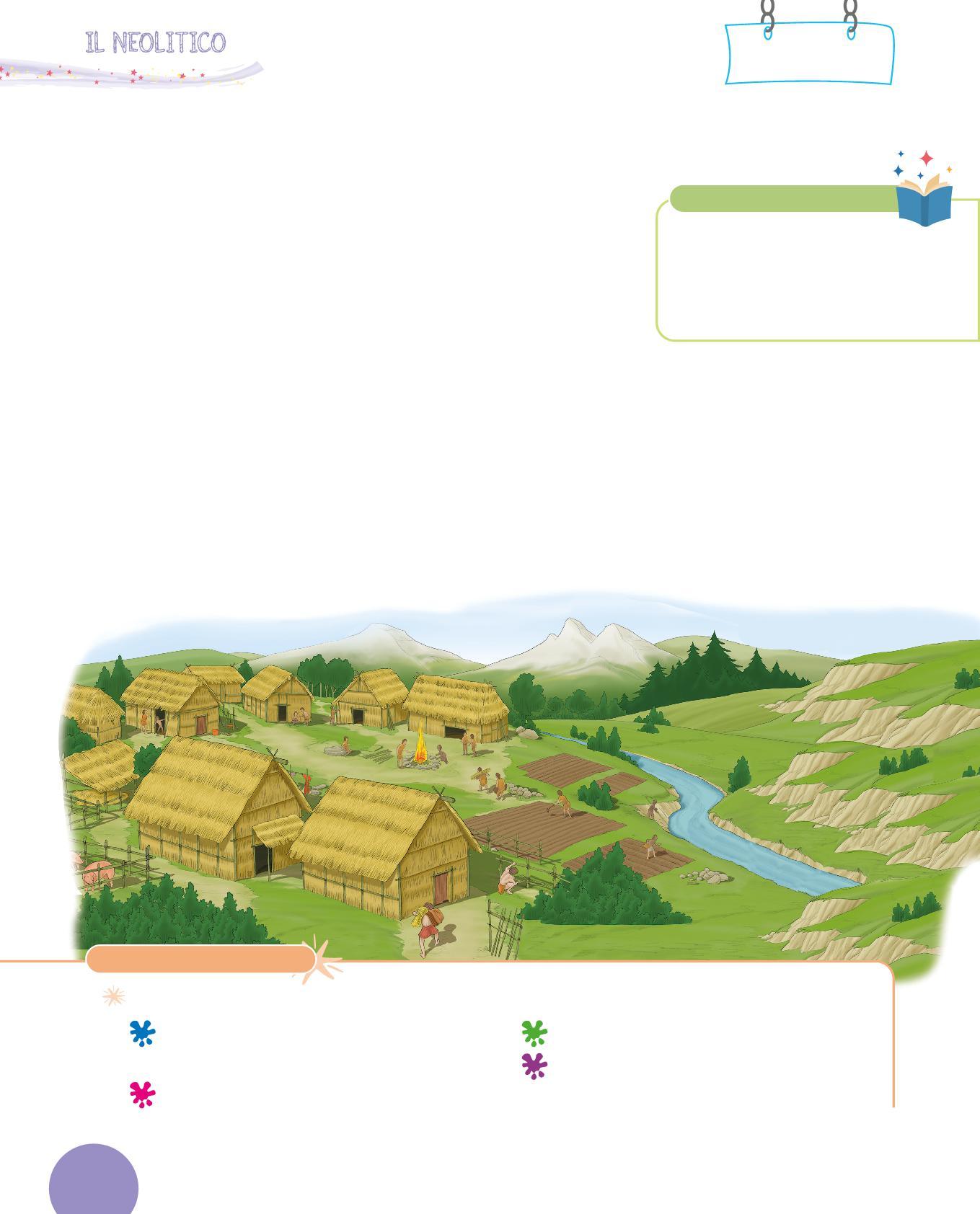 1. Osserva il disegno di un’abitazione del Neolitico e completa la descrizione con le parole sotto. Scegli tra: paglia • porta • tetto • legno • tessuti • mattoni • vasi • stalla • stanza