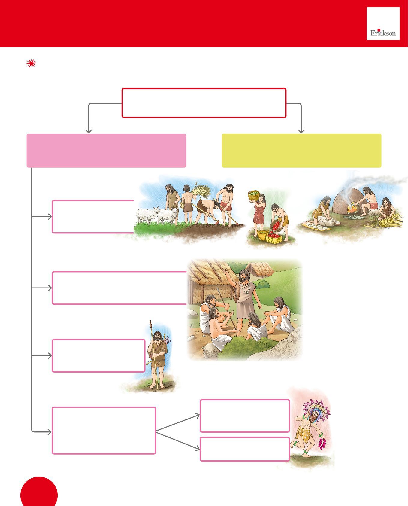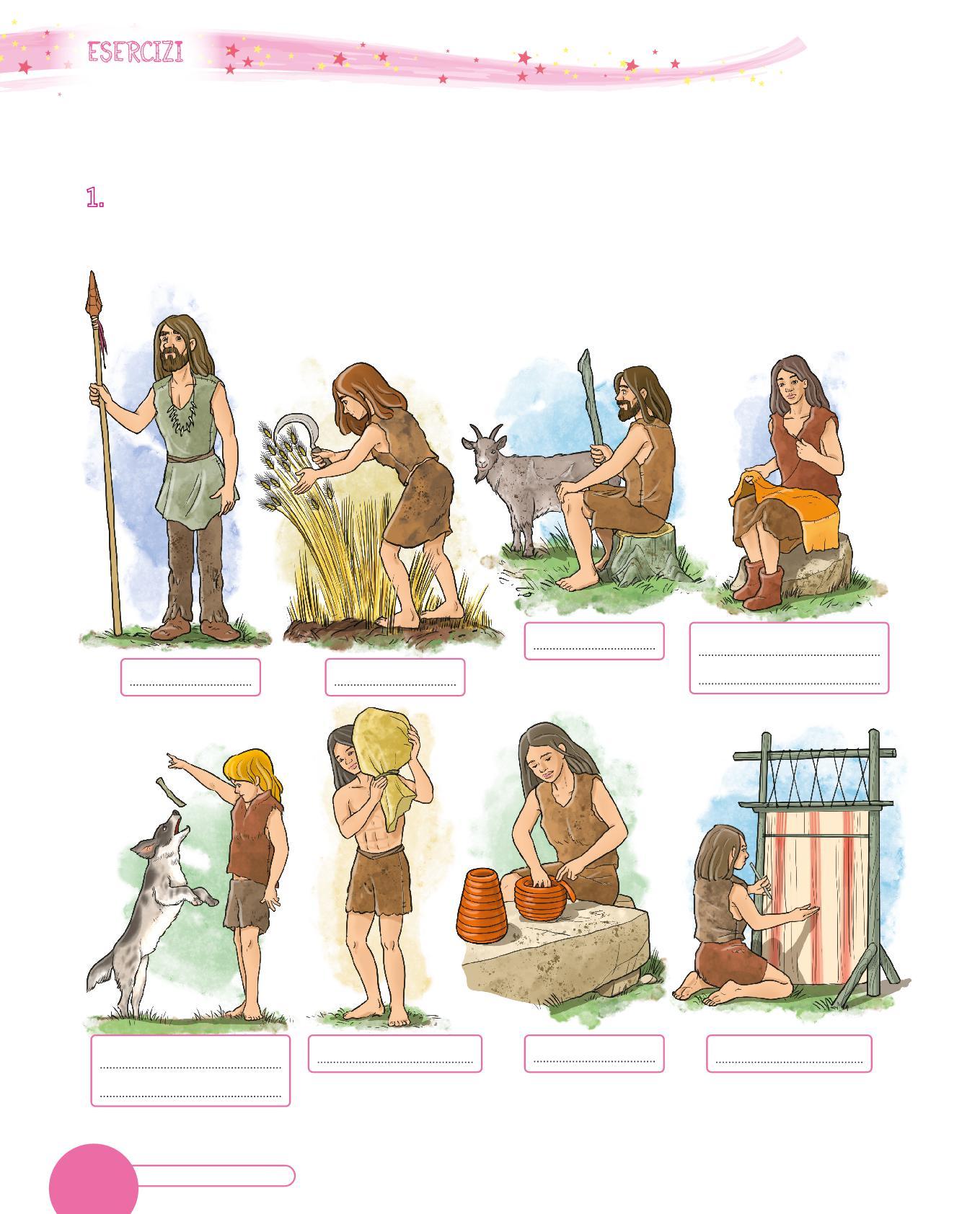 agricoltrice • allevatore • cacciatore • donna che cuce un vestito • commerciante • tessitrice • vasaia • bambino che gioca con un cane