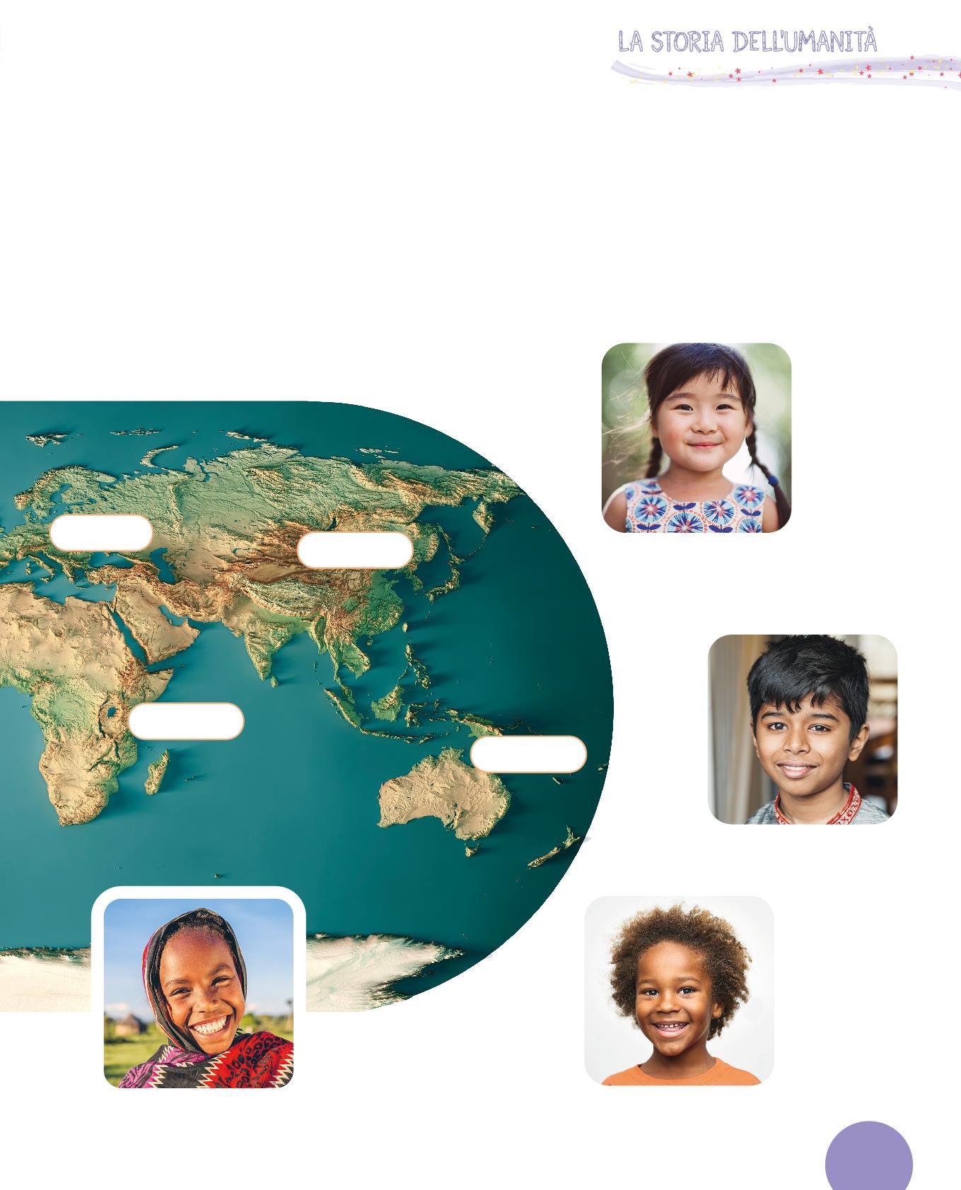 In ciascun continente vivono molte persone che possono avere delle caratteristiche diverse. Osserva le fotografie. Queste diversità si sono formate in centinaia di migliaia di anni, per permettere agli esseri umani di adattarsi (cioè modificare il proprio corpo) alle caratteristiche degli ambienti in cui vivevano: al freddo, al caldo, nella savana, nel deserto, sulle zone montuose, dove il Sole scalda di più o scalda di meno.