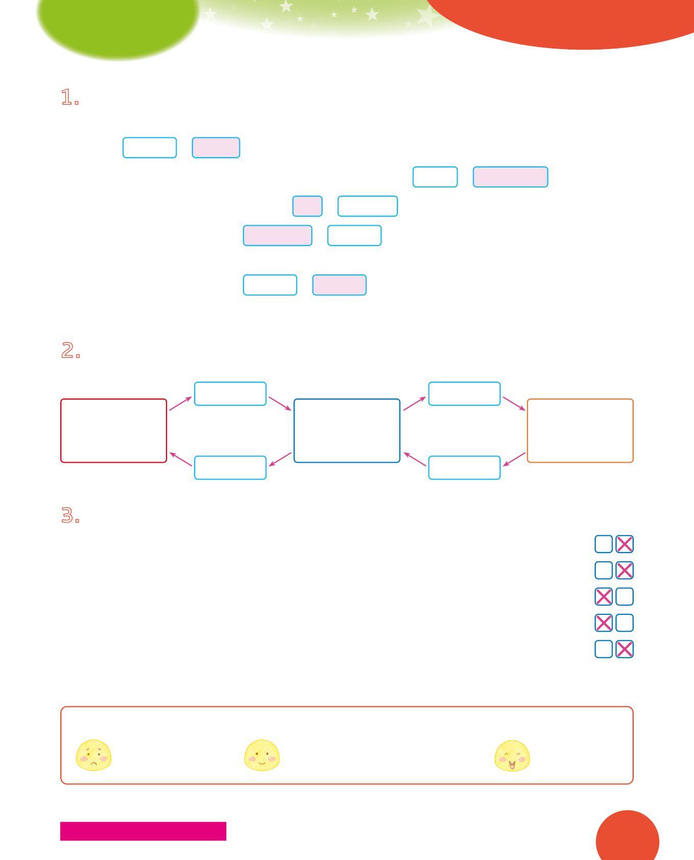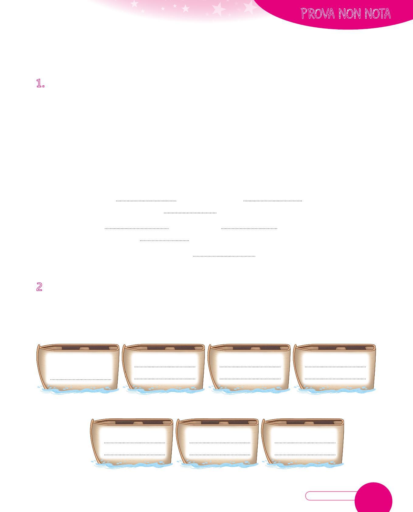 2 Suggerisci al contadino come fare per attraversare il fiume e arrivare al villaggio con tutti e tre gli elementi. Serviranno sette traversate tra andata e ritorno. Scrivi su ogni barchetta ciò che il contadino ogni volta deve trasportare.