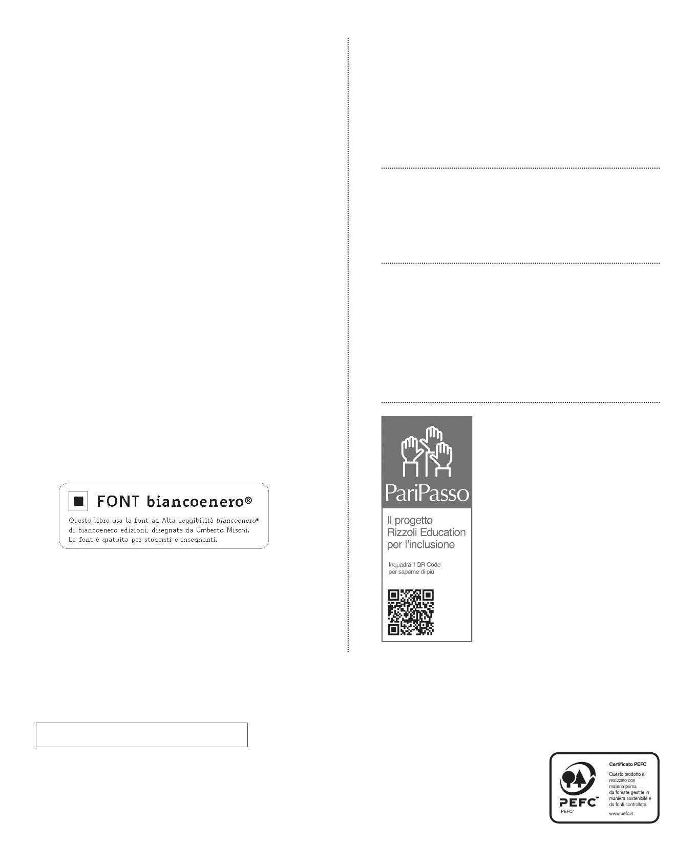 Segnalazione di errori e/o imprecisioni. La realizzazione di un libro scolastico è un’attività complessa che comporta controlli di varia natura. Essi riguardano sia la correttezza dei contenuti sia la coerenza tra testo, immagini, strumenti di esercitazione e applicazioni digitali. È pertanto possibile che, dopo la pubblicazione, siano riscontrabili errori e imprecisioni. L’editore ringrazia sin da ora chi vorrà segnalarli alle redazioni. Per segnalazioni o suggerimenti relativi al presente volume scrivere a: supporto@rizzolieducation.it