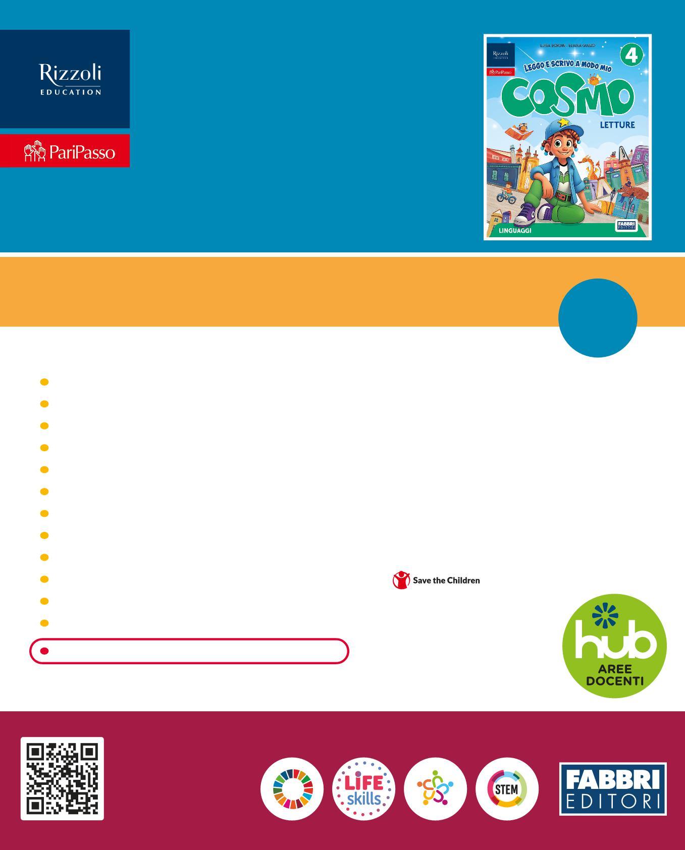 COSMO dà il titolo al corso ed è il personaggio guida dei Sussidiari delle discipline e dei linguaggi Fabbri 2026. La sua presenza identifica due progetti per il secondo ciclo della scuola primaria che hanno in comune innanzitutto l’idea che l’unica vera didattica inclusiva sia la didattica efficace per tutti e tutte, quella che mette al centro bambine e bambini, valorizza le differenze, promuove la collaborazione. Il sussidiario dei linguaggi è strutturato per tipologie testuali e generi e Cosmo accompagna bambine e bambini alla loro scoperta Lo fa diventando via via un avventuroso pirata, un investigatore come Sherlock Holmes… e tanti altri personaggi, anticipando domande e conoscenze relative ai diversi generi. È la guida sicura che conduce bambine e bambini passo passo agli apprendimenti ed è presente nei momenti di studio, di verifica, ma anche di gioco.