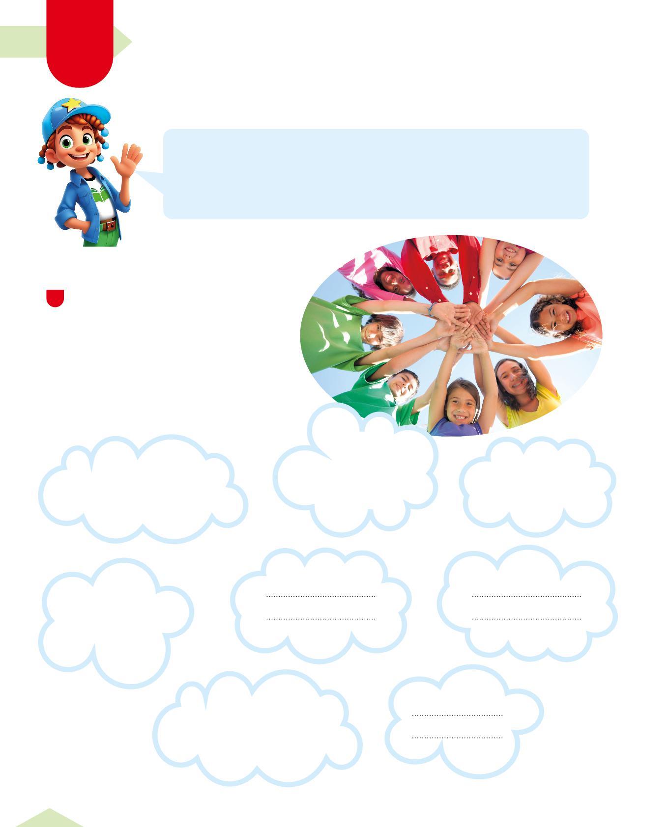 Guarda le parole che trovi nelle nuvole, sono parole che ripercorrono le tappe dell’anno scorso. Colora le nuvole che contengono le parole più importanti per te. Nelle nuvole vuote scrivi alcune parole a tua scelta. Poi confrontatevi in classe.