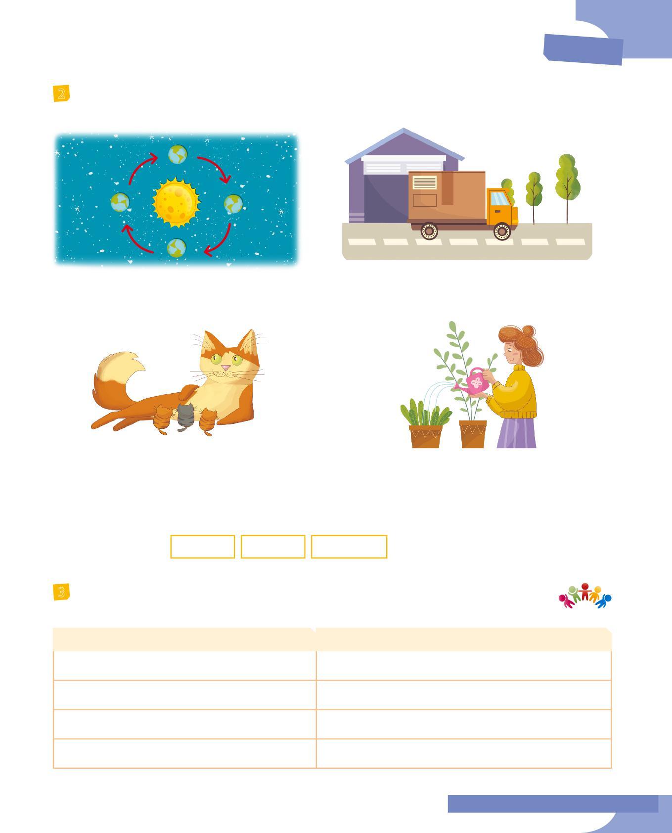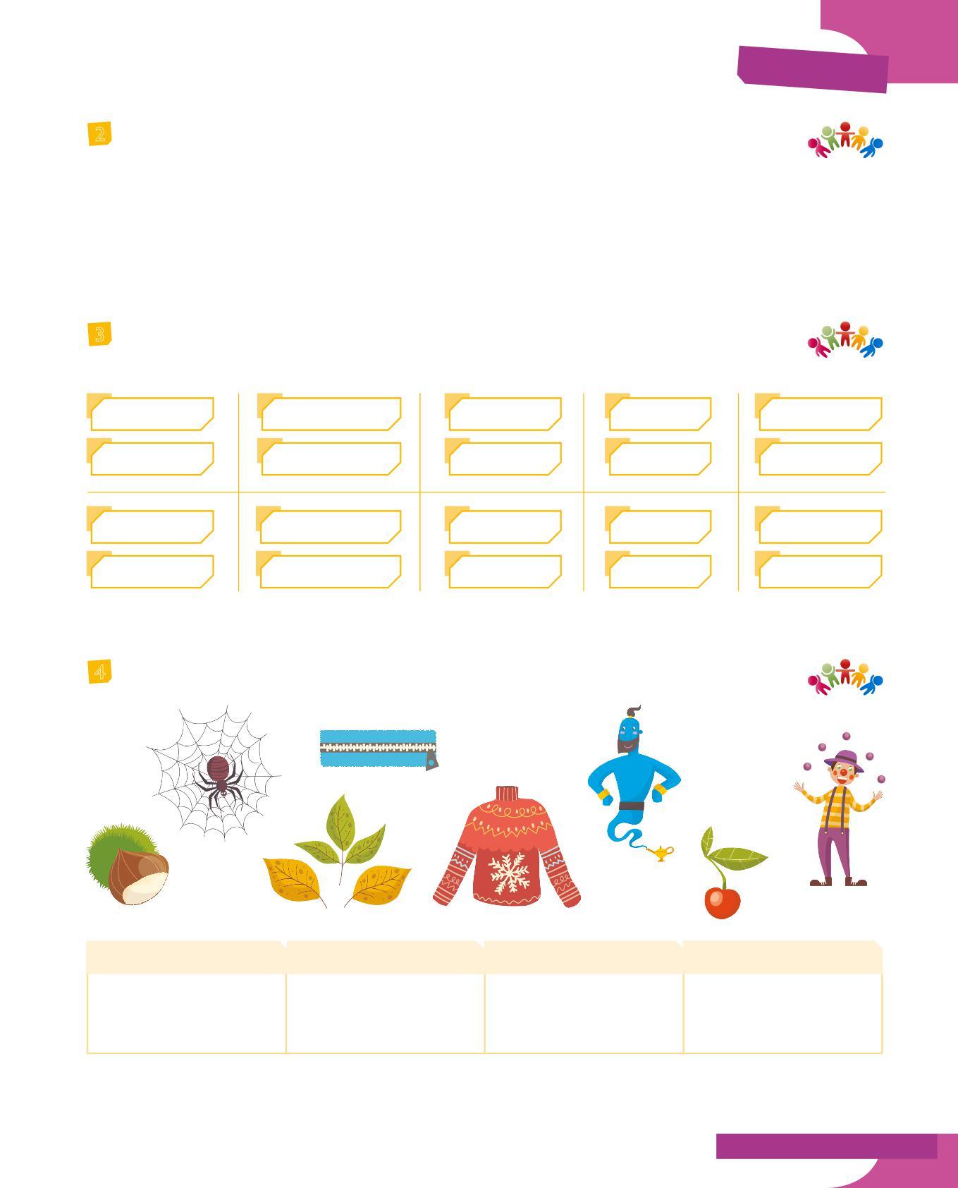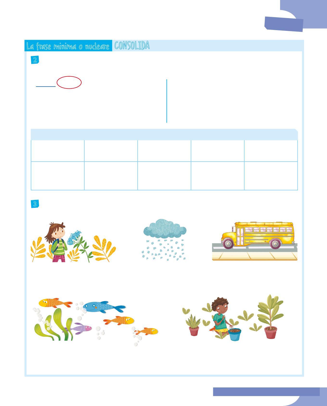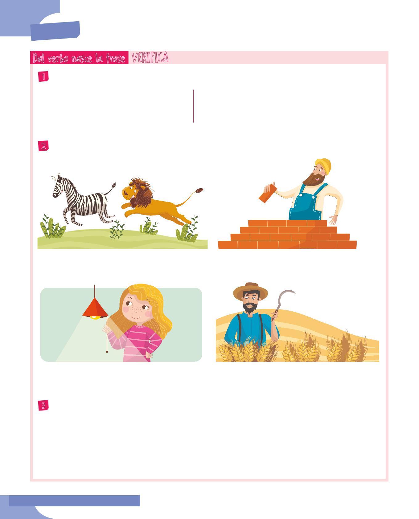 3 Abbina il soggetto al verbo adatto colorando allo stesso modo i cartellini: fai attenzione all’accordo nella persona e al significato. Poi scrivi delle frasi minime con le coppie soggetto-verbo che hai formato.