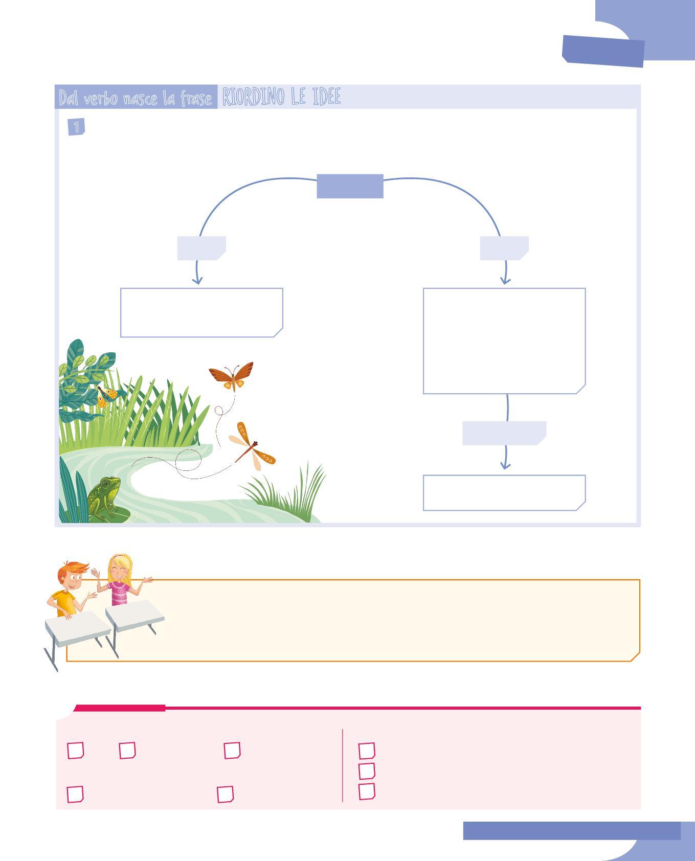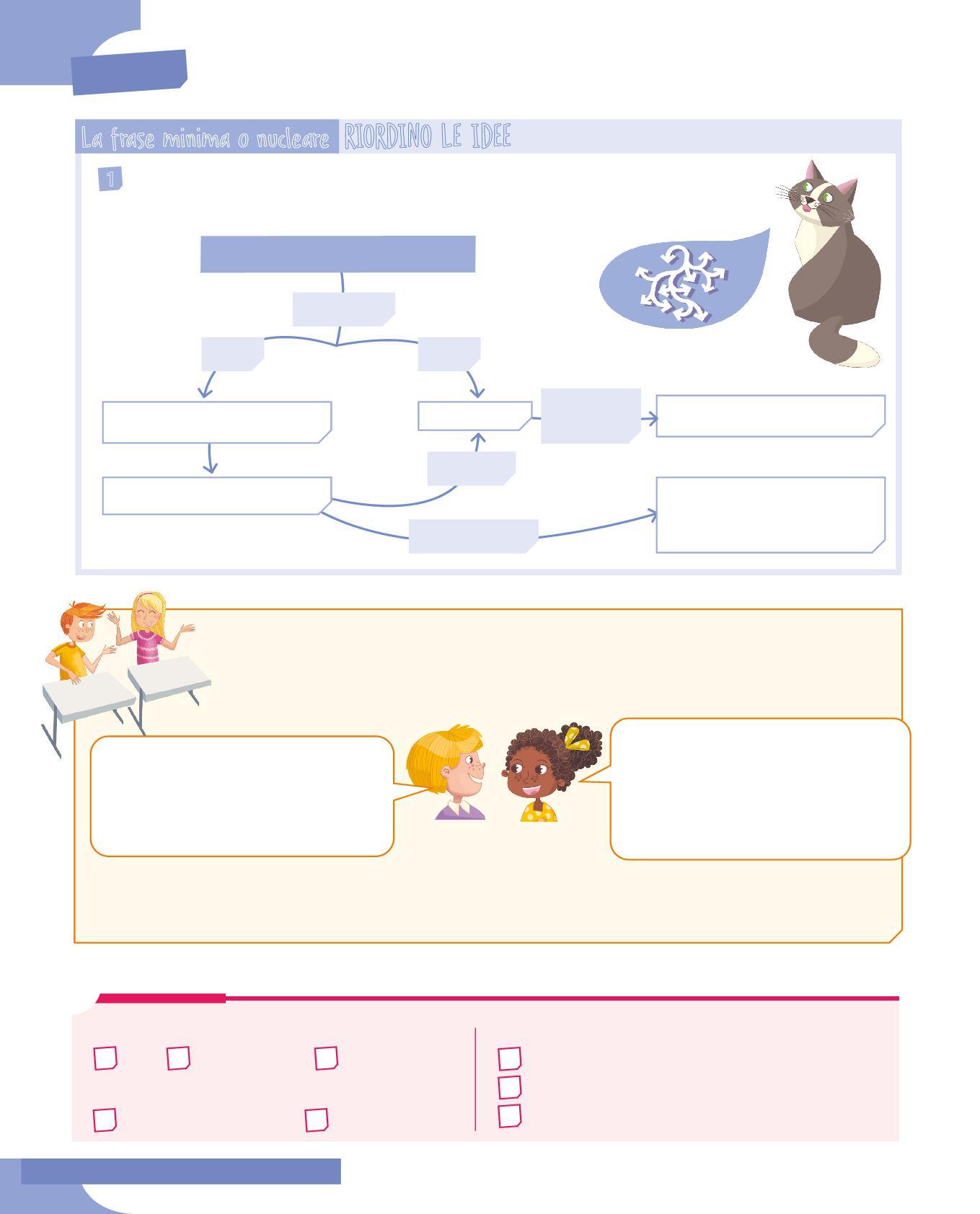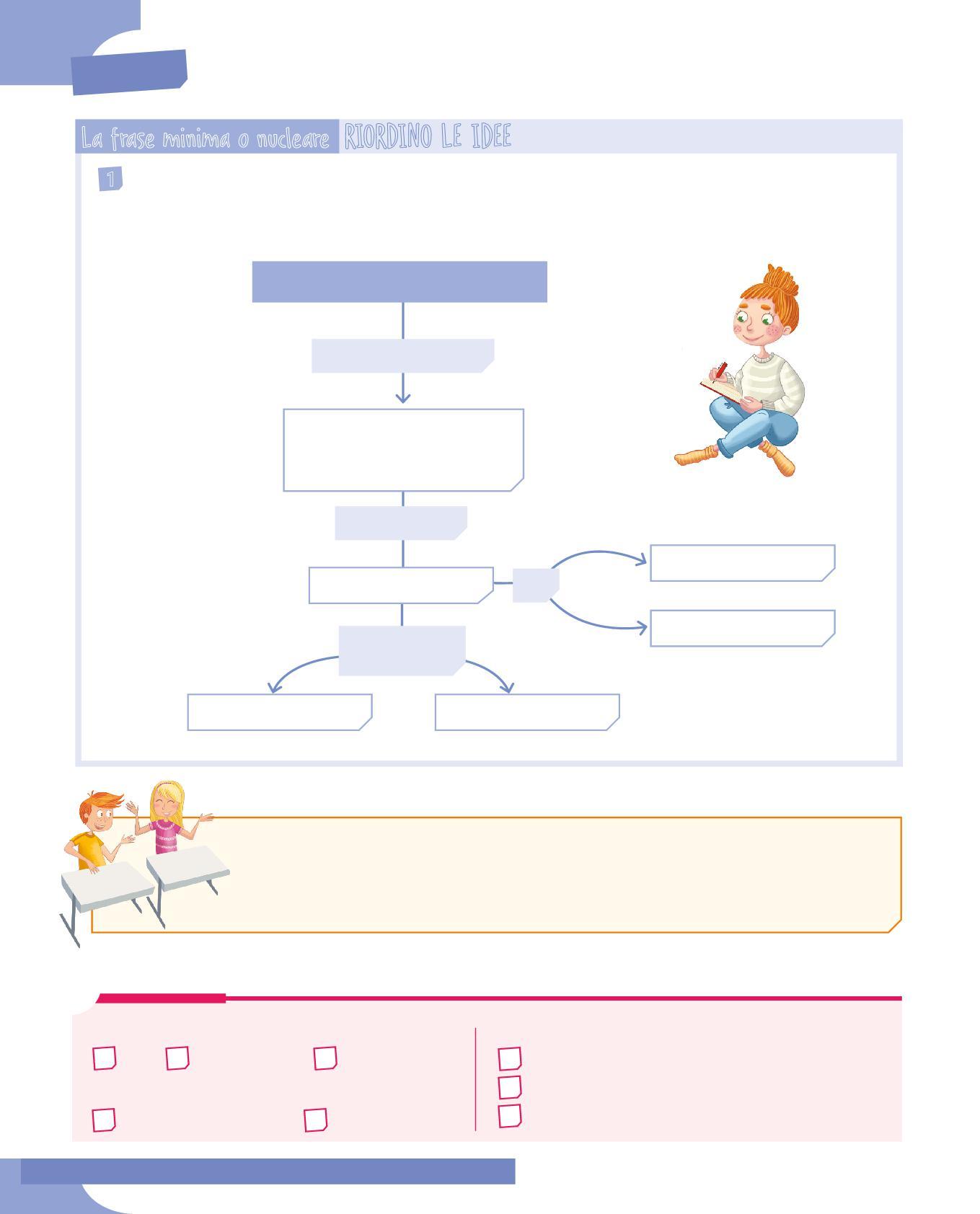 Vedrai che alcuni verbi possono narrare un evento da soli, senza chiamare nessun altro elemento; altri, per raccontare una scena, hanno bisogno di chiamare a sé uno, due, tre o quattro elementi. E vedrai come, nella frase, ogni elemento si aggancia agli altri in modo ordinato e logico per renderla completa. Così nasce la frase nucleare. Imparerai inoltre che le frasi si possono disegnare, costruendo degli schemi che rendono chiaro il lavoro svolto dalla nostra mente, quando va a cercare tutti gli elementi che le occorrono per costruire una frase intorno al verbo.