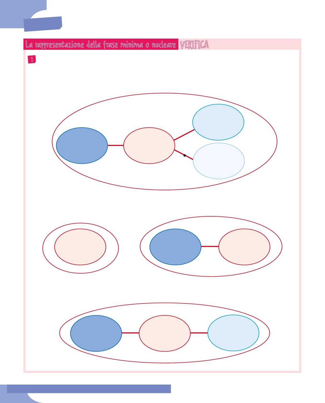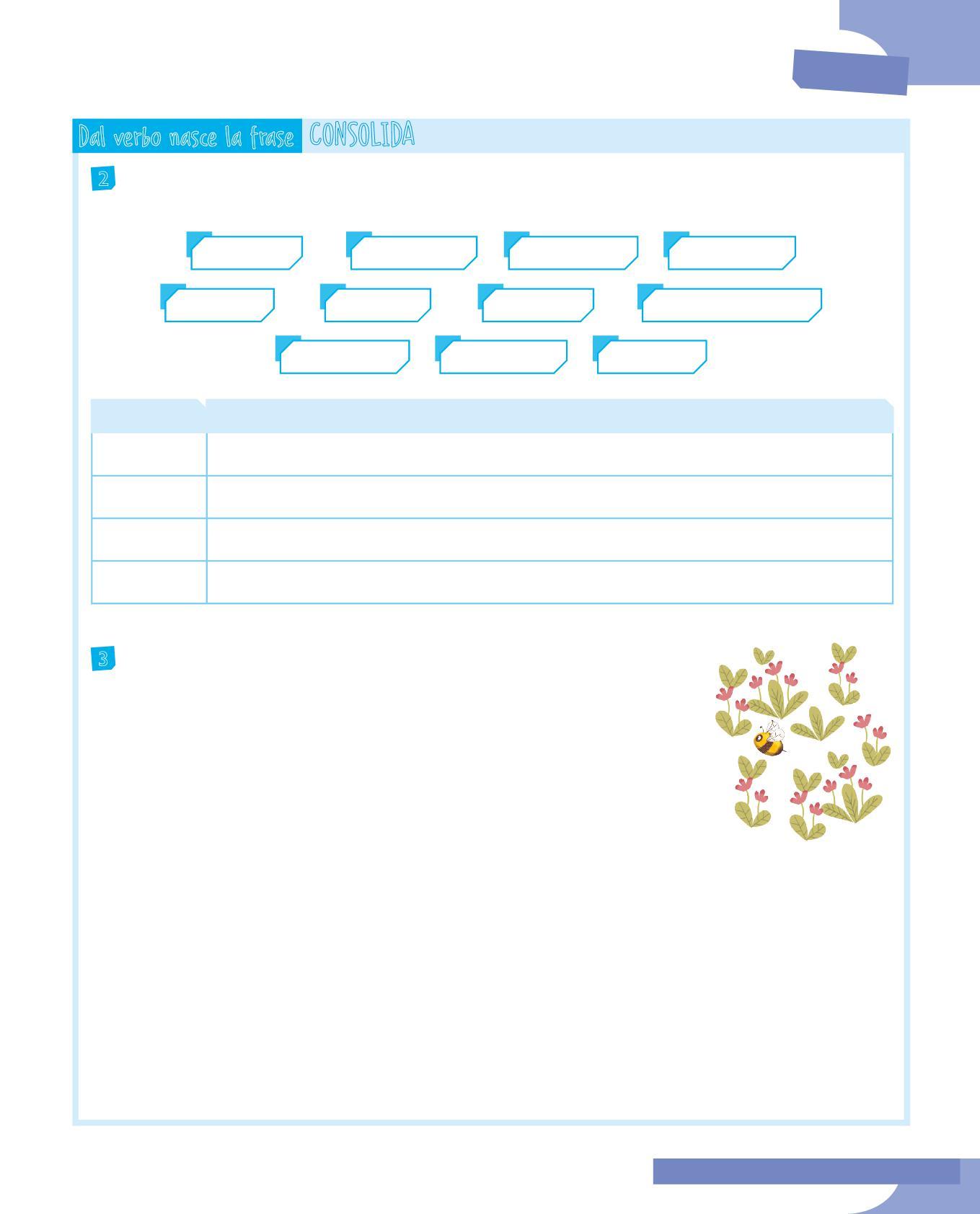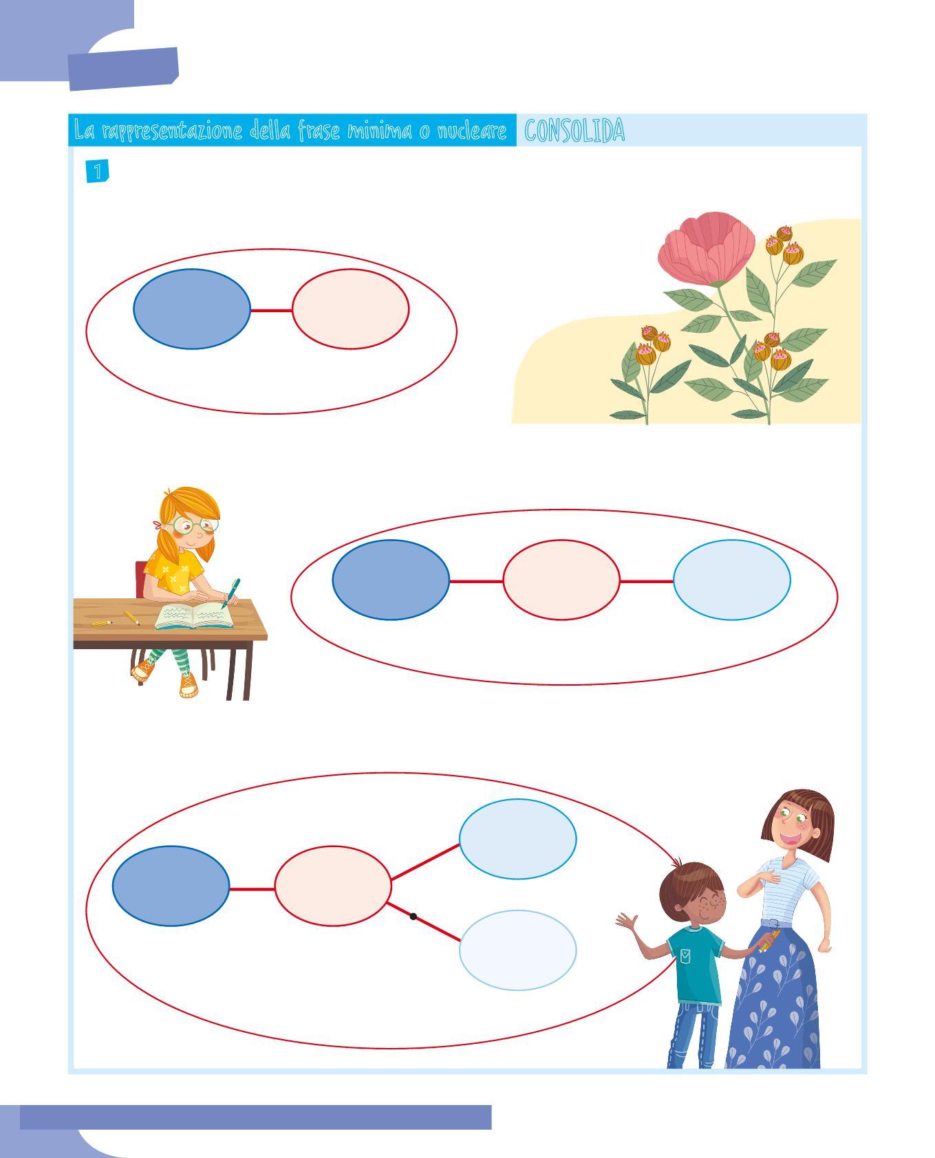5 Scegli tre frasi minime dell’esercizio precedente e rappresentale sul quaderno con gli schemi radiali, evidenziando con un riquadro grigio il predicato verbale.