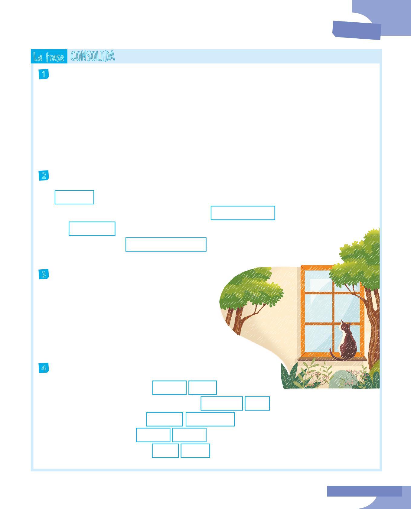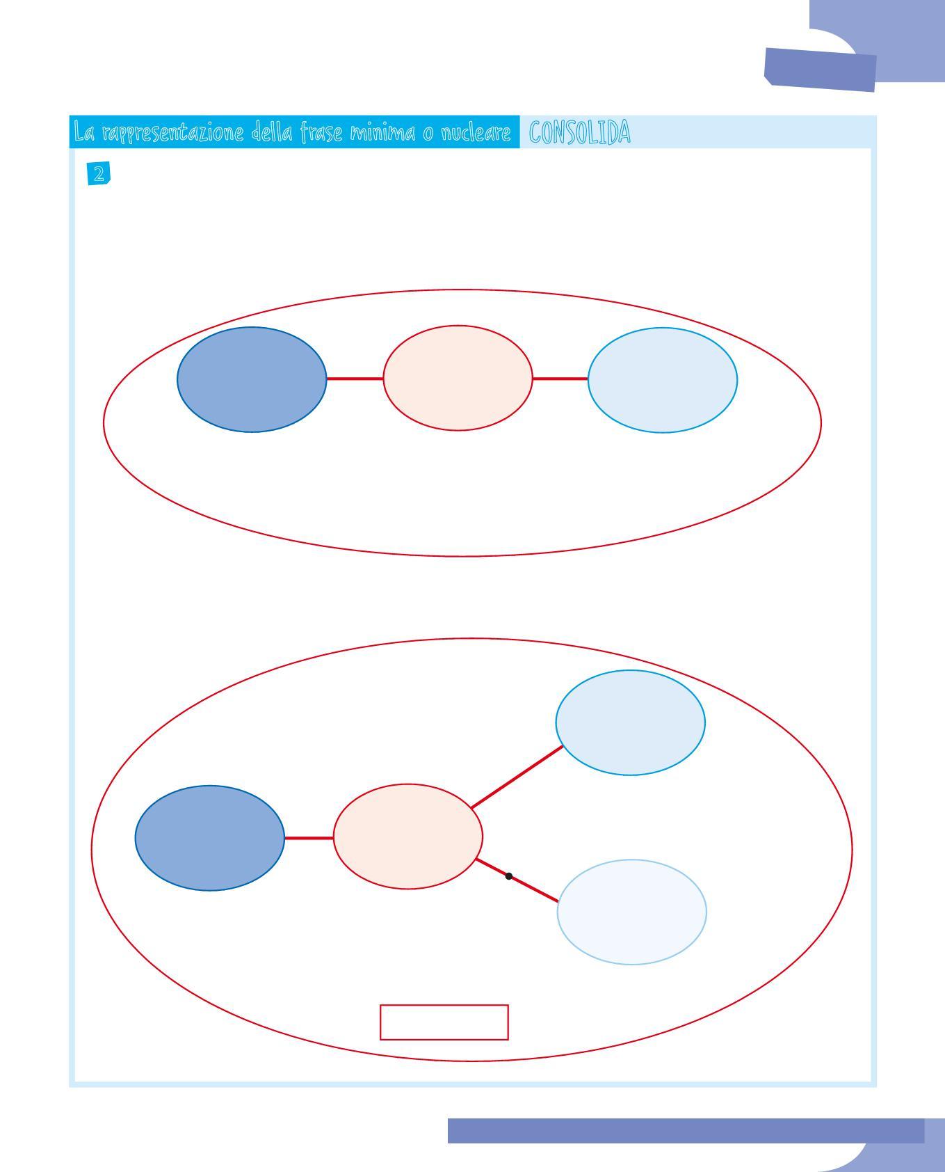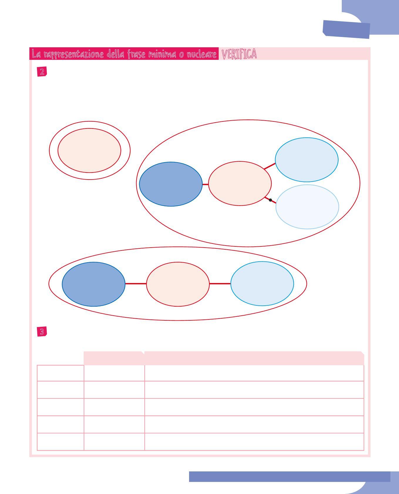 5 Scegli tre frasi minime dell’esercizio precedente e rappresentale sul quaderno con gli schemi radiali, evidenziando con un riquadro grigio il predicato verbale.
