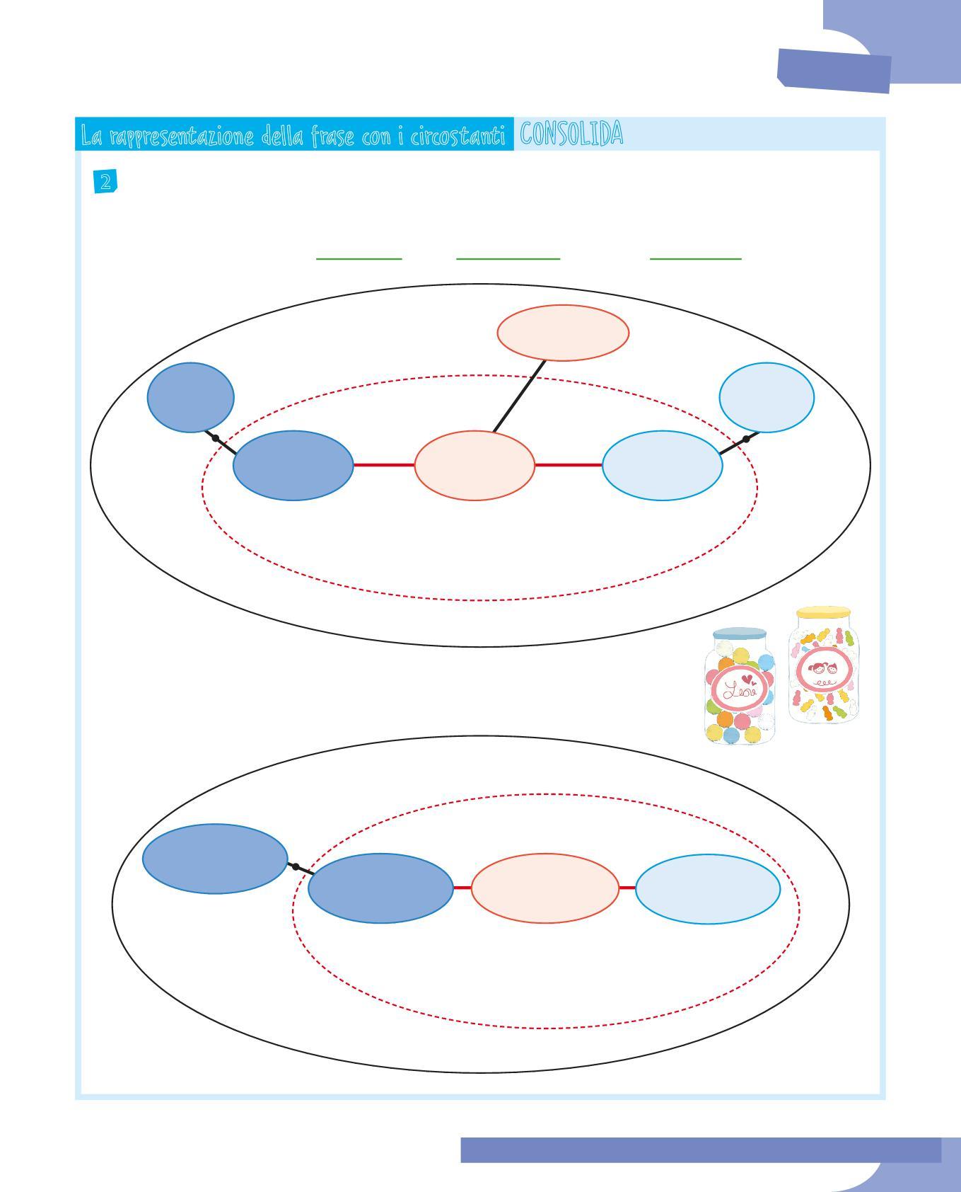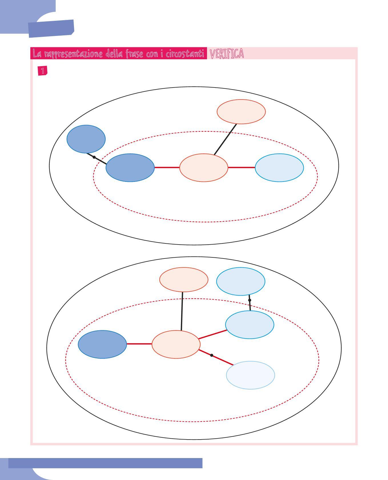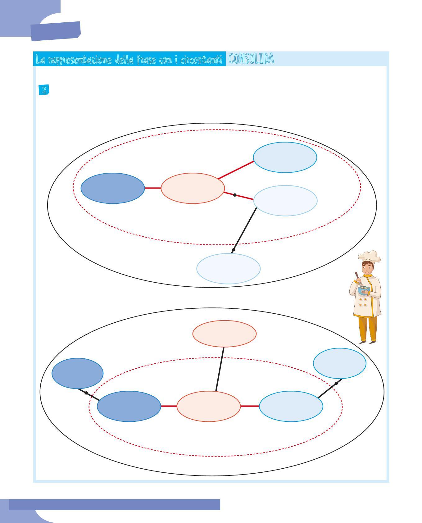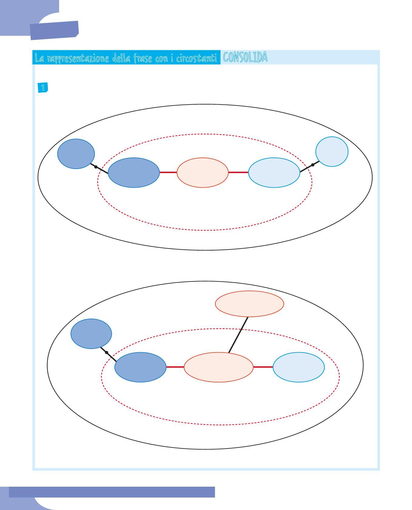 Nel secondo ovale, di colore nero, si collocano i CIRCOSTANTI, che si collegano all’elemento del nucleo a cui si riferiscono con una linea nera. Lungo questa linea di collegamento si mette un puntino nero, accanto al quale si scrive la preposizione semplice o articolata che fa da “gancio”.