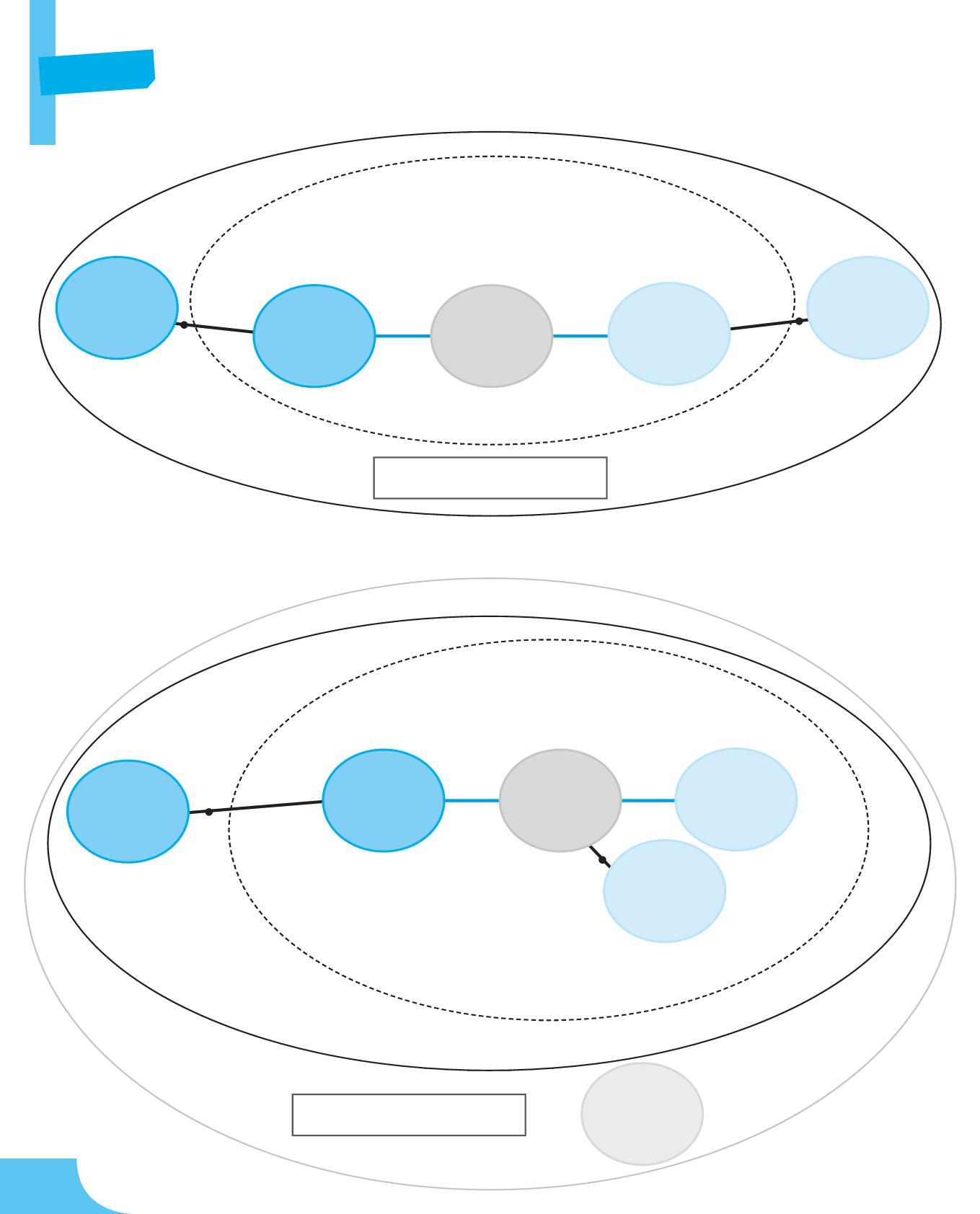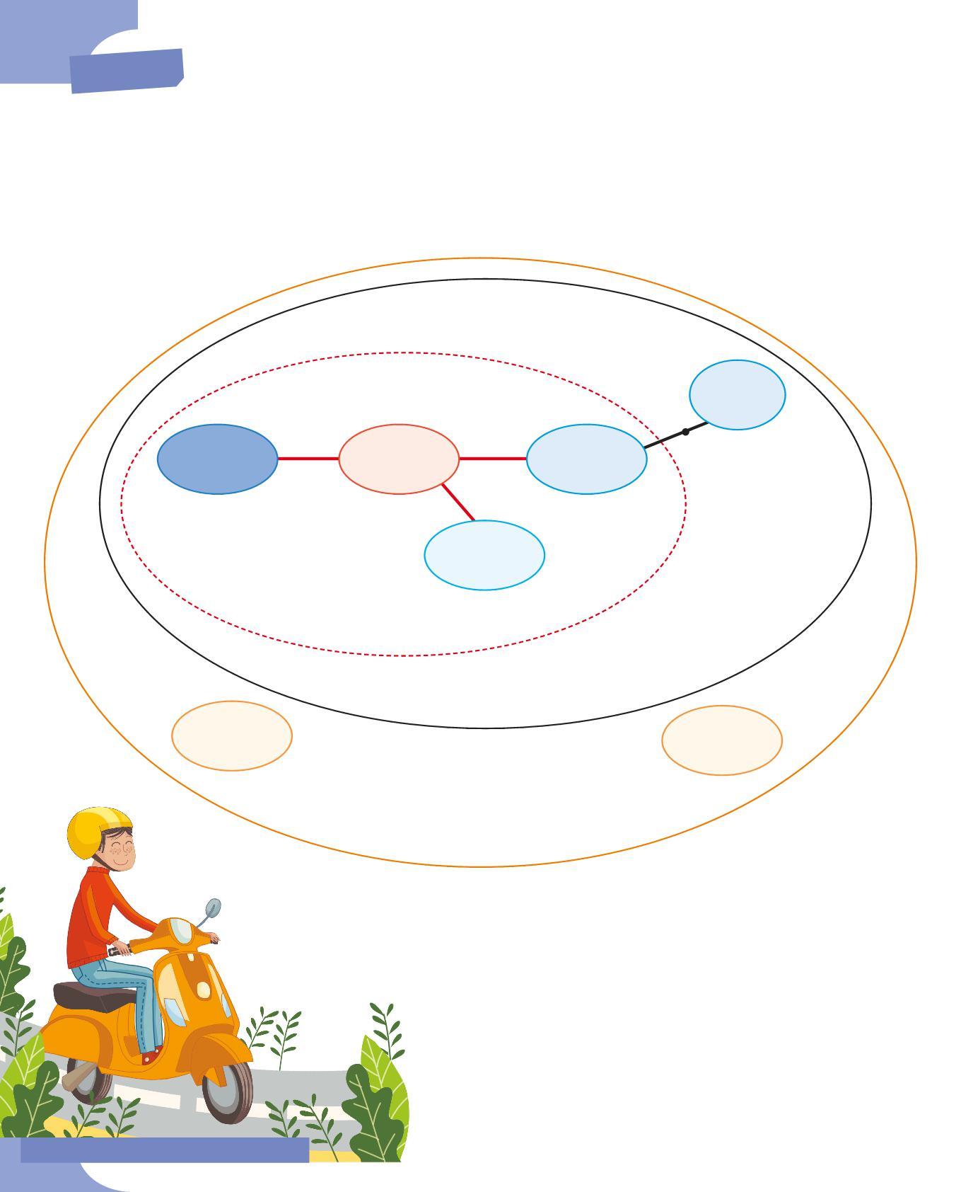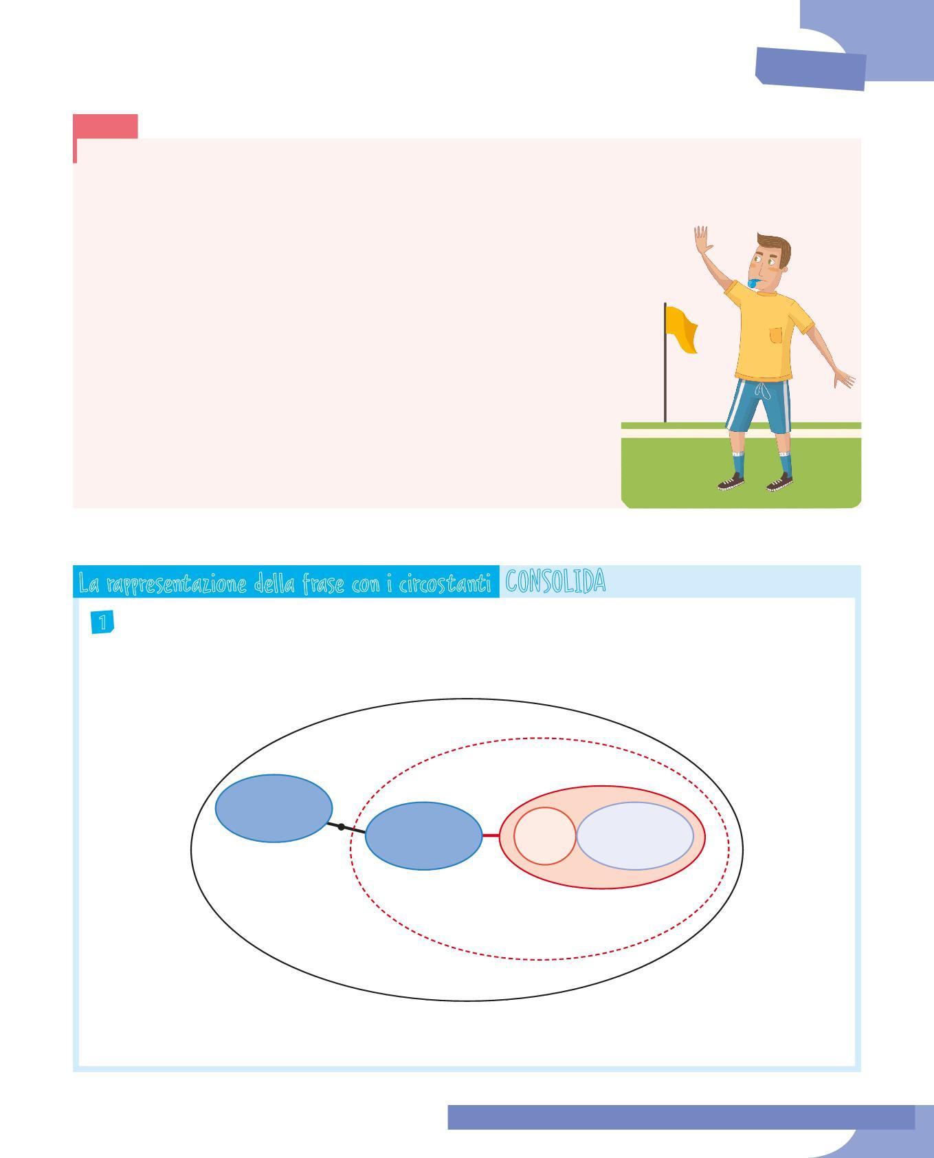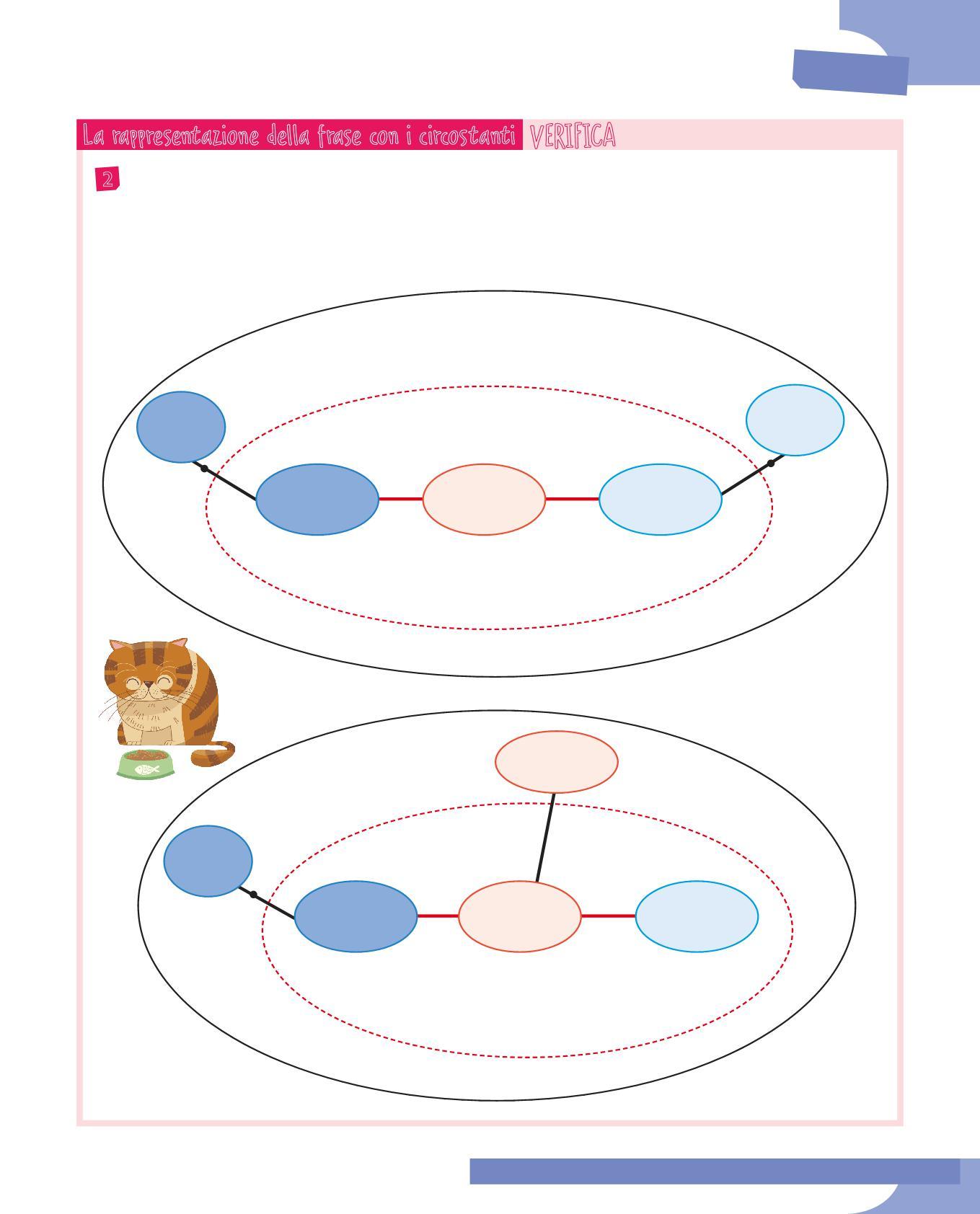Nel secondo ovale, di colore nero, si collocano i CIRCOSTANTI, che si collegano all’elemento del nucleo a cui si riferiscono con una linea nera. Lungo questa linea di collegamento si mette un puntino nero, accanto al quale si scrive la preposizione semplice o articolata che fa da “gancio”.