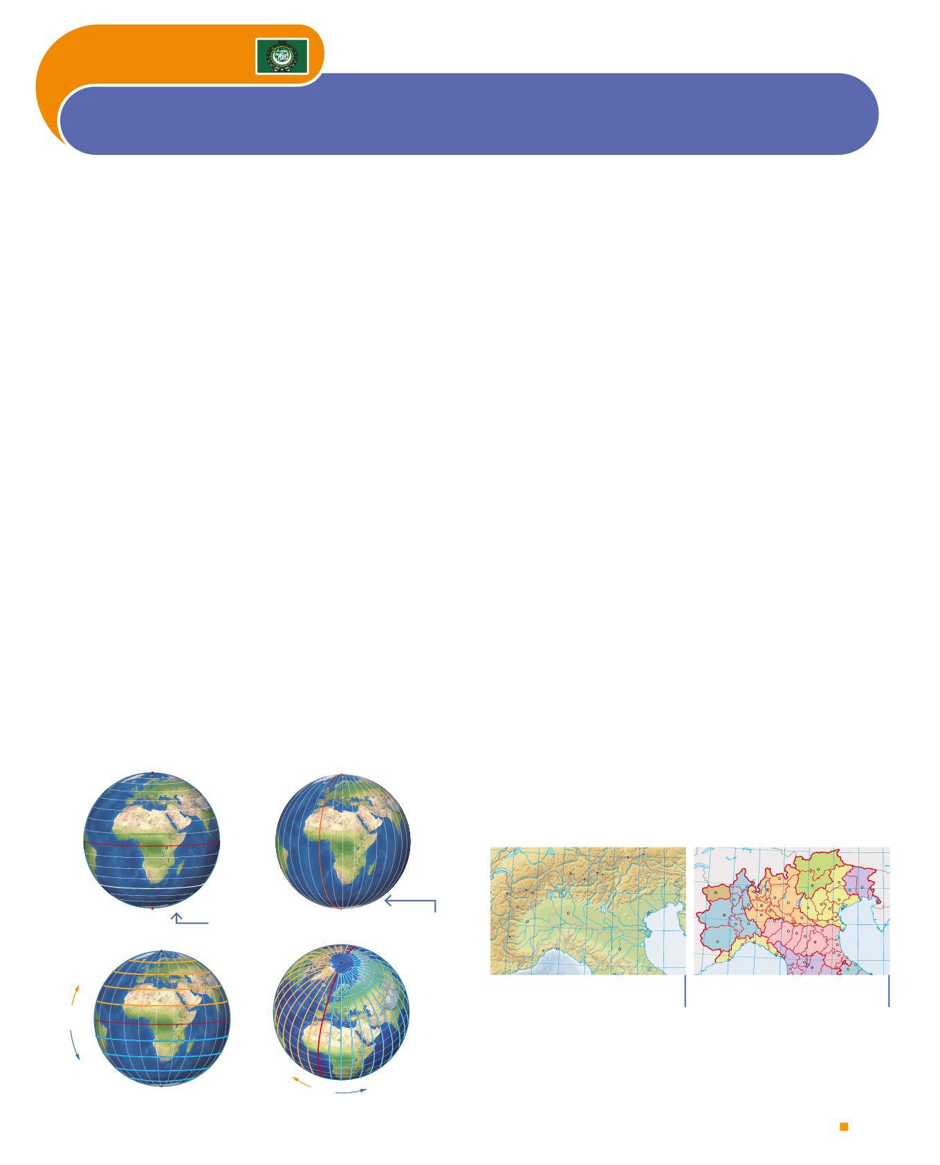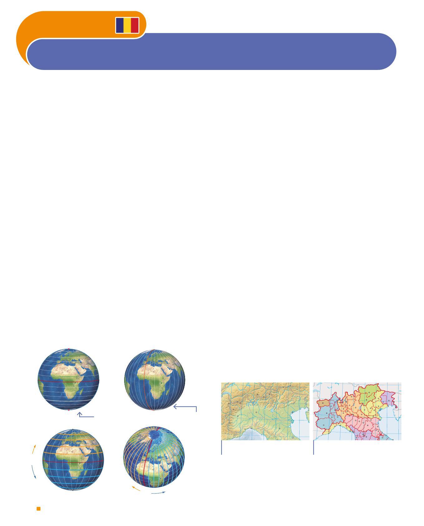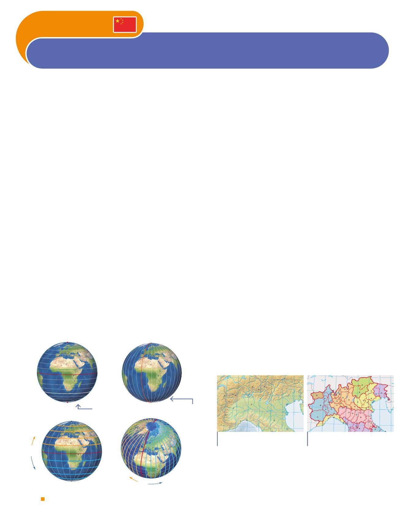 During the day, the reference points are the cardinal points: East (= Orient, where the Sun rises); West (= Occident, where the Sun sets); North (= North) and South (= South). At night, we orient ourselves using the North Star, a star that appears fixed and always points to the North. In the past, to find direction people used the compass, a very ancient tool with a single needle that always points to the North; today the GPS (Global Positioning System) accurately indicates where we are thanks to satellites located in space. To locate a place on Earth, geographers have drawn imaginary lines on its surface: the parallels, perpendicular to the Earth’s axis (an imaginary line that crosses the globe from the North Pole to the South Pole), are counted from the Equator toward North or South; the meridians, semicircles that connect the Poles, are counted from the Greenwich meridian toward East or West. Parallels and meridians form the geographical grid. A place is identified by indicating the intersection point between a parallel and a
