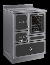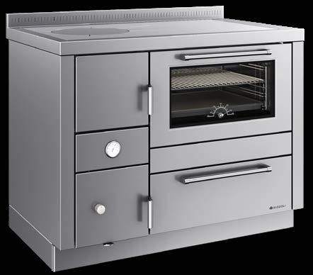 Presa aria esterna Regolazione automatica aria primaria Aria secondaria preriscaldata Uscita fumi posteriore regolabile Piedini livellatori regolabili in altezza Distanziali integrati Porta forno con doppio vetro e termometro Forno in acciaio inox con illuminazione elettrica Teglia e griglia Vasca acqua