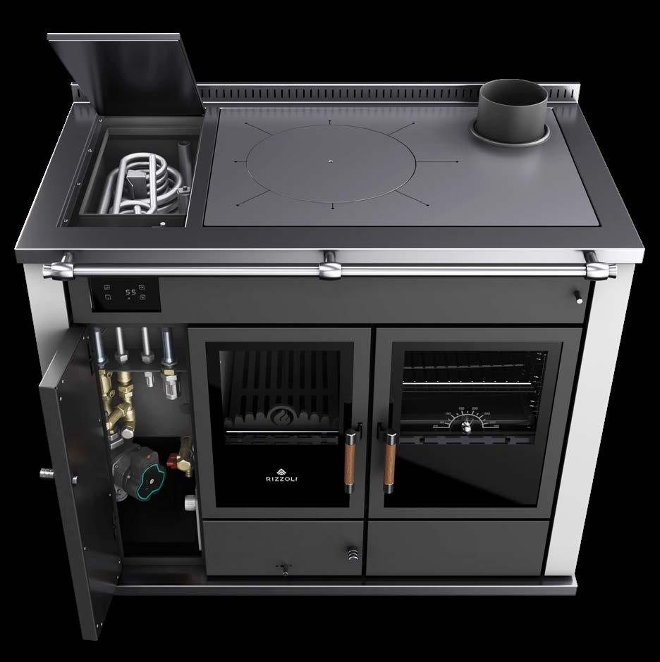 Il segreto dei forni delle cucine e termocucine a legna Rizzoli è tutto nell’accurato studio del doppio girofumi con elevata quantità di materiale refrattario che permette di ottenere cotture omogenee oltre i 350° e di portare in temperatura il forno in tempi record. Il particolare girofumi con lunghezza media pari a 270 cm avvolge il forno su tutti i lati (anche posteriormente), trattenendo maggiormente il calore all’interno della cucina a legna e garantendo cotture perfette con maggiori performance in termini di rendimento. Il tutto, grazie anche ai 4 distinti livelli di cottura. Le dotazioni del forno sono al top del mercato: termometro, griglia, teglia stampata e smaltata, guide telescopiche, valvola di eccesso vapore e una porta forno con ampio vetro serigrafato, singolo o doppio.