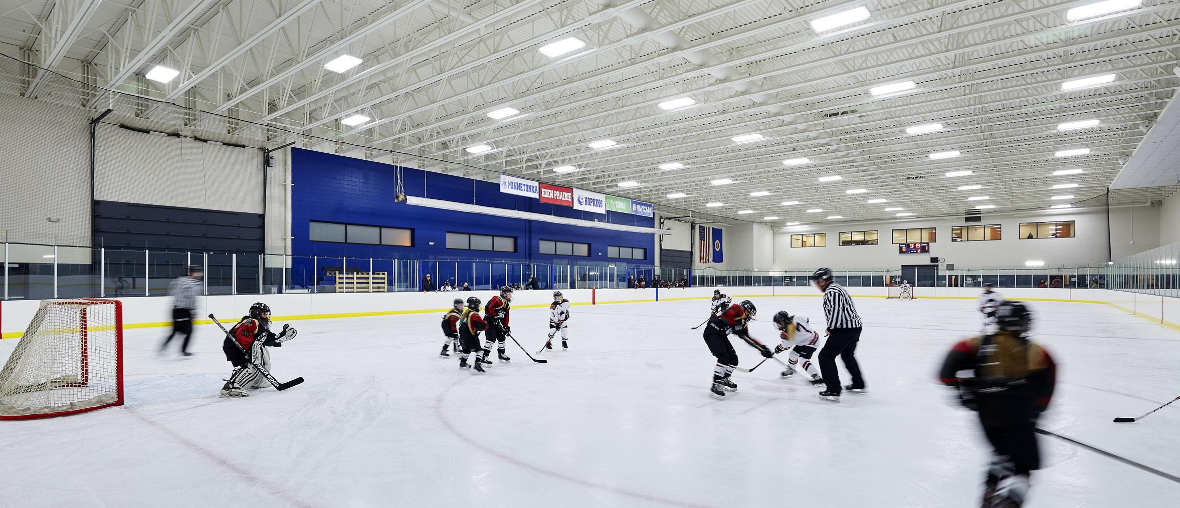 The project includes an NHL-size refrigerated outdoor ice rink. In the spring and summer months this space is converted into a turf field for soccer and other sports. The spectator area includes bleachers and an outdoor plaza with a fire pit. The project also includes team locker rooms and a covered walkway that leads visitors through the plaza.