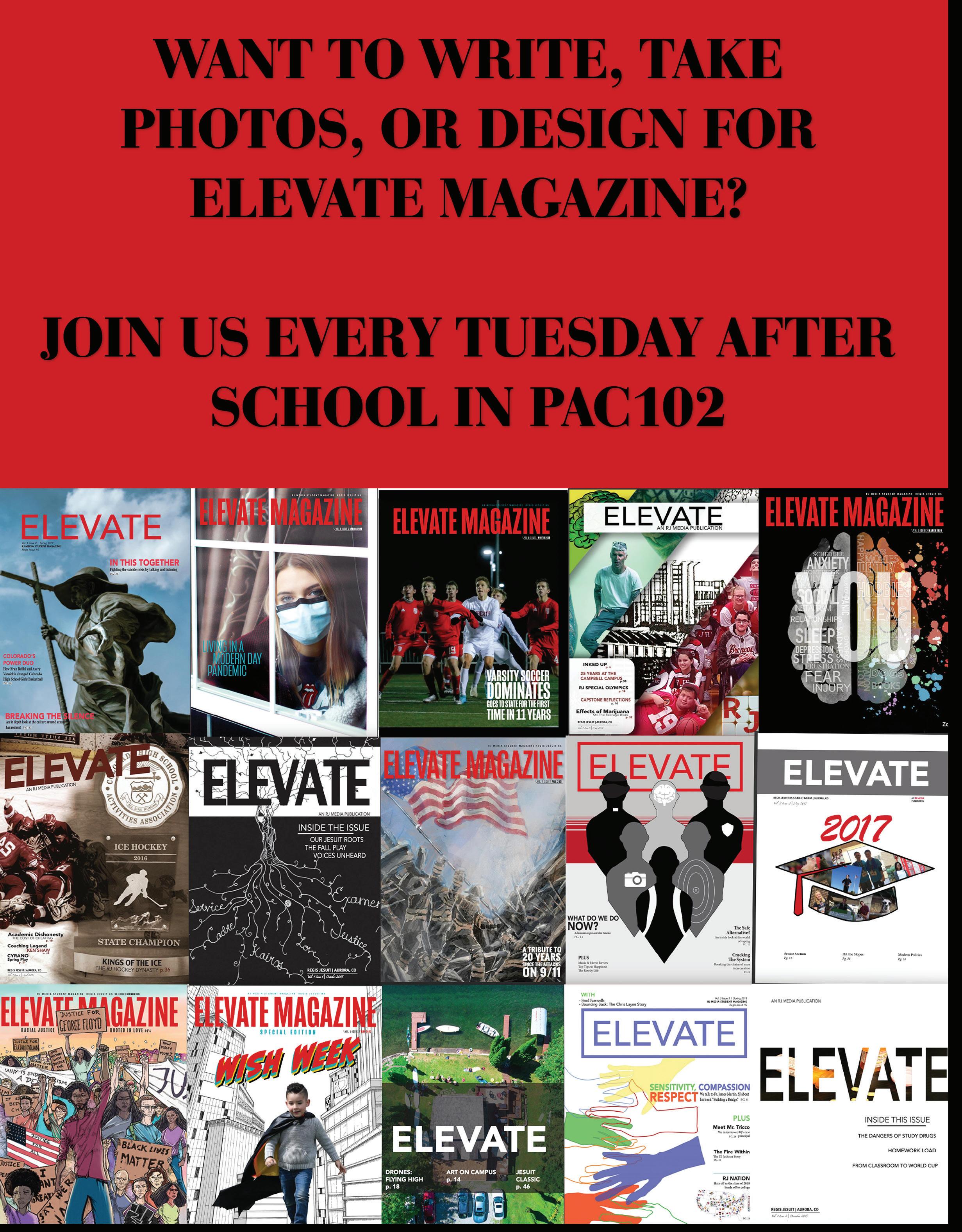 Elevate is the studentrun magazine for Regis Jesuit High School. It is a quarterly, print and online publication. The magazine strives to produce objective, balanced, accurate, and thoughtful journalism that reflects the varied interests, talents, and viewpoints of Regis Jesuit’s students and staff.