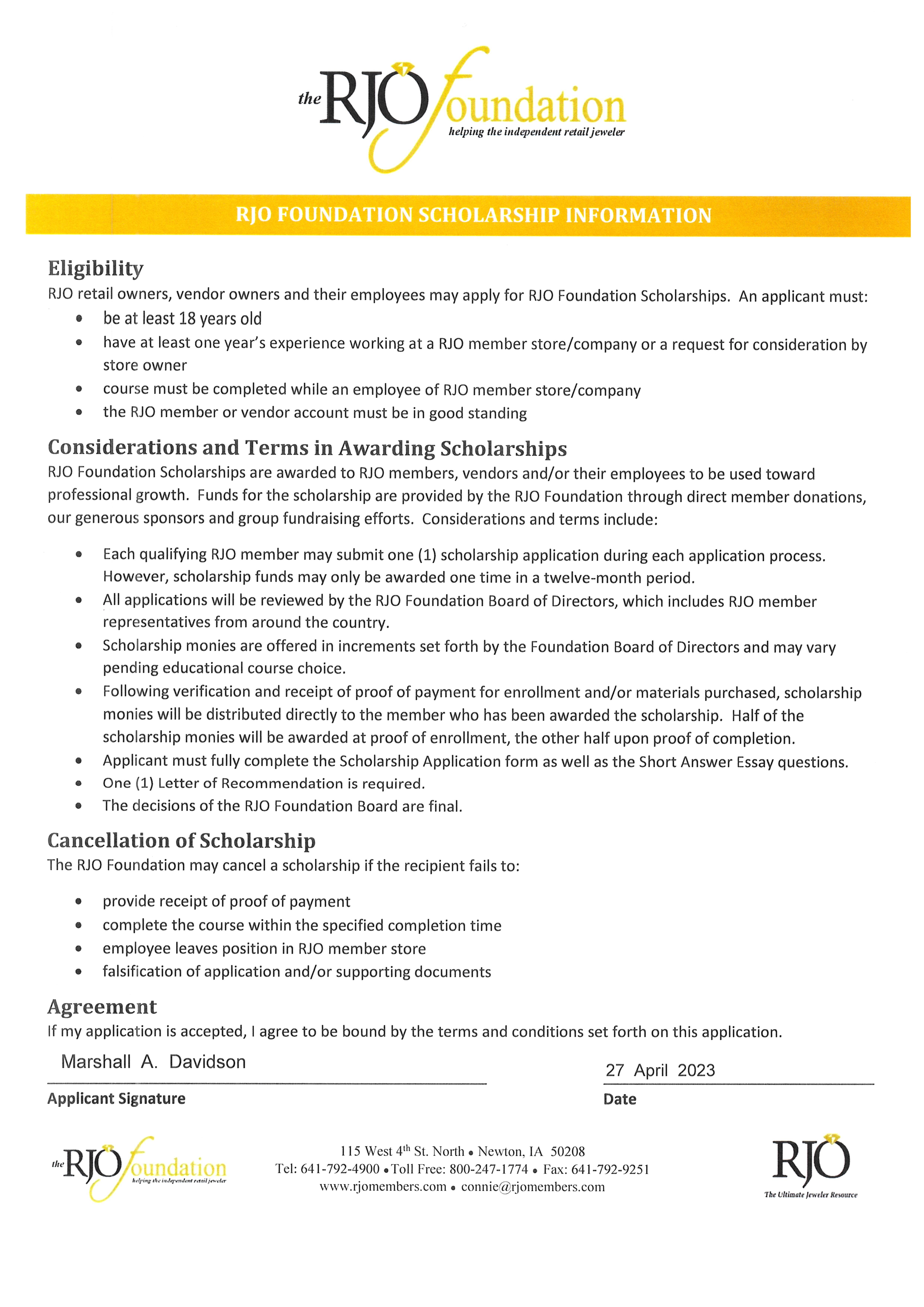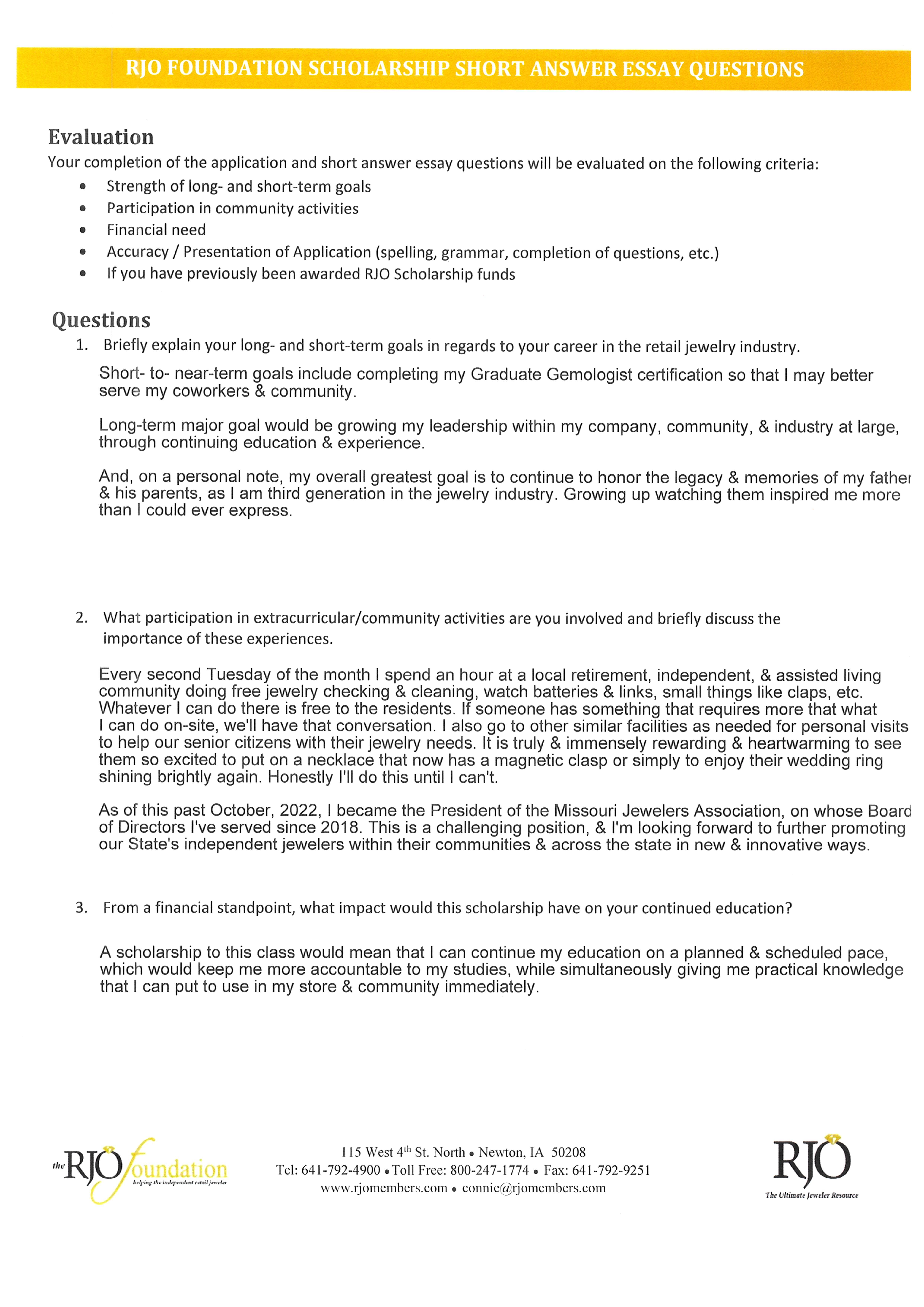 I would not be in the position I am today without my first scholarship through RJO I know it will have the same impact as it did before, which is growing my love for the jewelry industry Wickersham Jewelry was my first full time job, and I've been hooked ever since! RJO will always have an impact on my career since the beginning, and I would love to continue any way I can This Scholarship will not only help my personal growth, but growth within Wickersham Jewelry as well I would not be able to do it without the help from the RJO community.