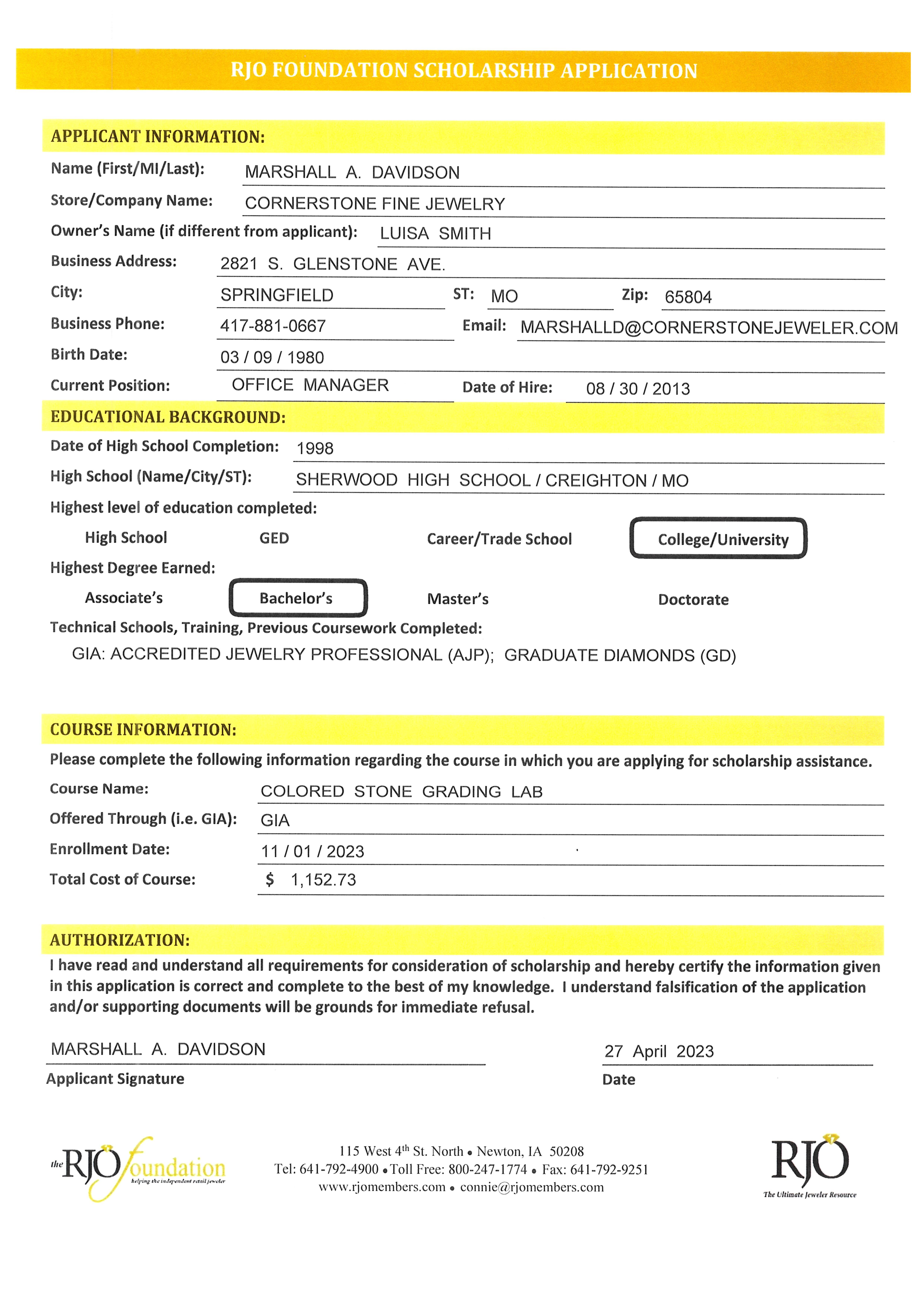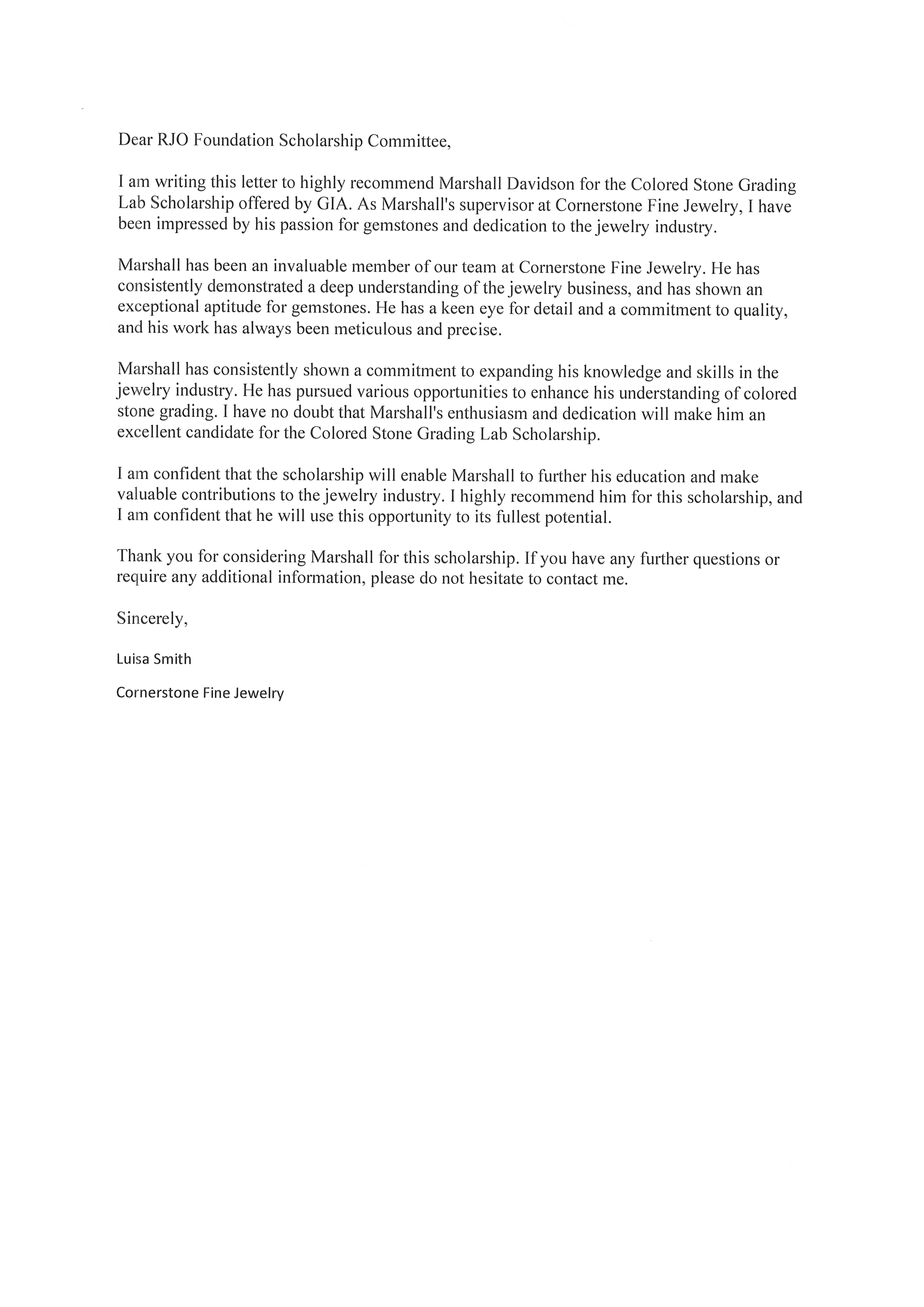 Emily has taken the initiative to have her GIA diamond essentials and GIA colored stone essentials courses completed and I believe she would be a great candidate to receive an RJO scholarship so she can add GIA colored stones to her education. It will help be able identify quality stones and assist in buying quality merchandise.