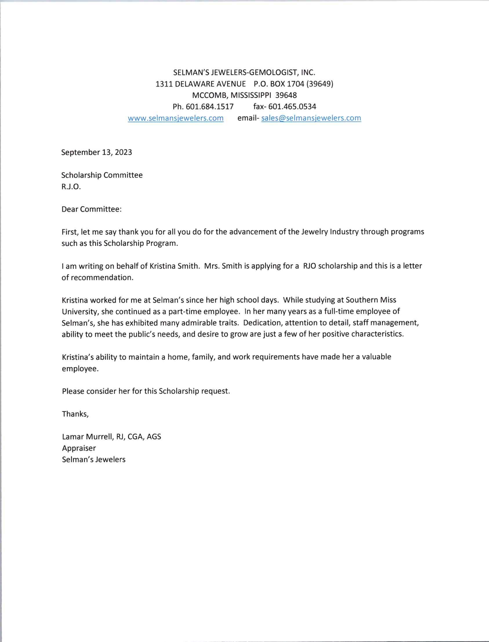 Reference scholarship application for Katherine Bennett. I have hired many people in my 49 years at Hodges Jewelry Co. and I can honestly say she is by far my best hire. She has all the qualities I look for in staff. Katherine is a self starter and never needs prompting to complete or start a task. She is loyal, personable, driven and smart. Katherine had some retail experience and also has worked in a watch kiosk which was very helpful. She is good with customers in sales, but her heart is in the art of jewelry repairs. Although she has taken 2 courses in jewelry repair her desire is to get all the advanced training available. We recently purchased a laser welder for her use and she has learned to use it on a limited basis. If she can get this scholarship it would certainly enhance her value to us and help her in her future endeavors in our industry.