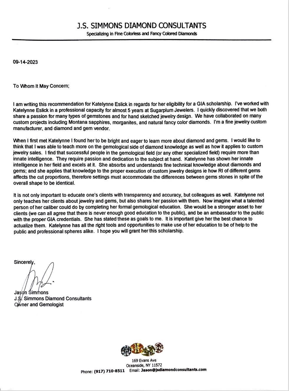 Katherine future plans are to concentrate on all facets of jewelry repair and sales on a limited basis only. If she is fortunate to receive this scholarship she will be thrilled to add this training to her resume. I highly recommend she receives all due consideration as someone young who wants to make her career in our industry.