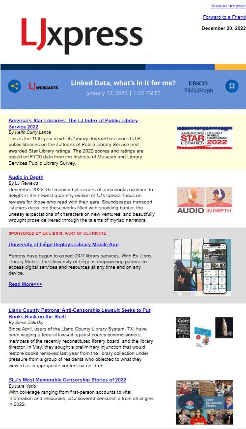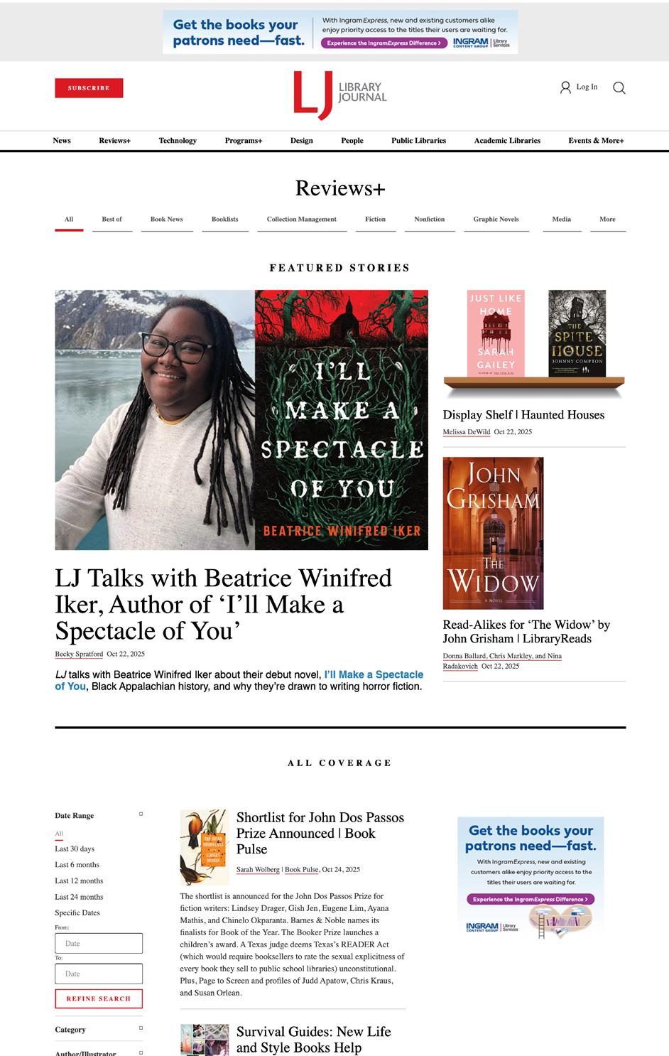 As the authoritative voice in the library market, Library Journal delivers in-depth reviews, emerging trends, key industry figures, and the news shaping the library landscape to our highly engaged audience. Backed by decades of expertise and a comprehensive integrated marketing suite, we’ll amplify your message across digital, print, events, newsletters, and social platforms.