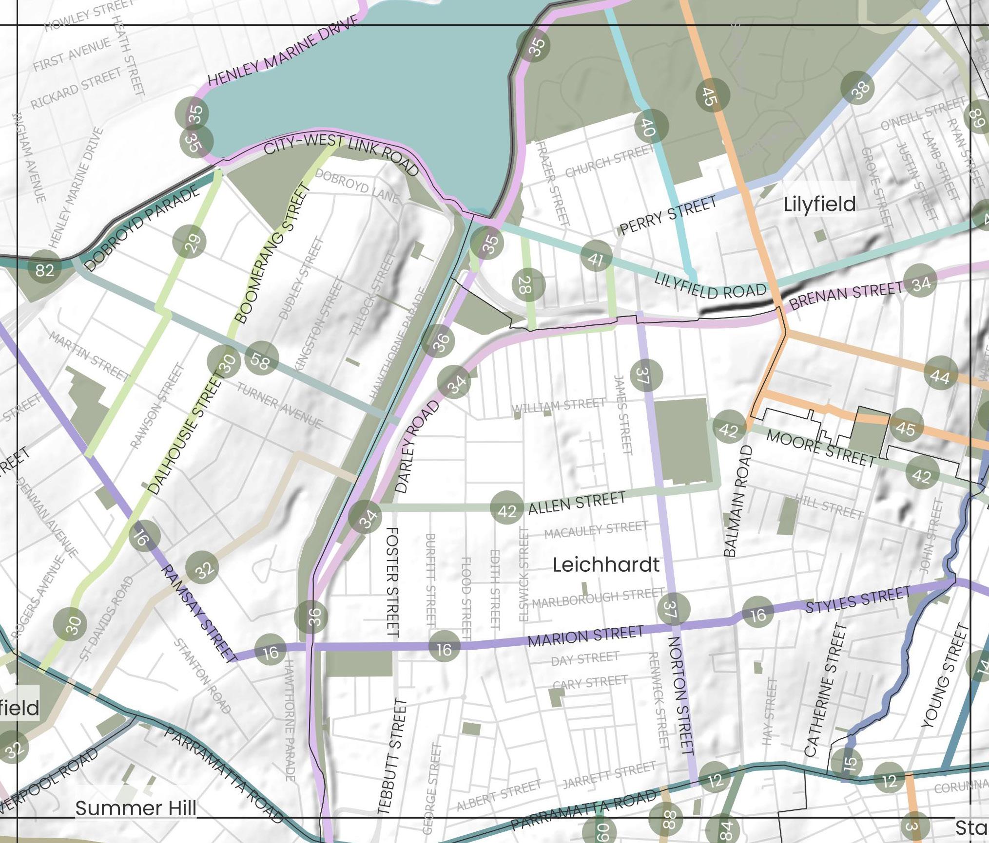 Knox Street to Pratten Park via Park Lane 25 Peace Park to Parramatta Road via Milton Street and Frederick Street 26 Ashfield Station to Parramatta Road along Bland Street 27 John Street to Bland Street 31 Orpington Street 32 Hawthorne Light Rail Stop to Bruce Street Reserve 33 Bland Street to Liverpool Road 59 Northern Link of Newtown to Croydon train line 82 Iron Cove Creek Corridor 29 Ashfield Park 30 Reg Cody Reserve 31 Hammond Park 32 Wadim (Bill) Jegorow Reserve