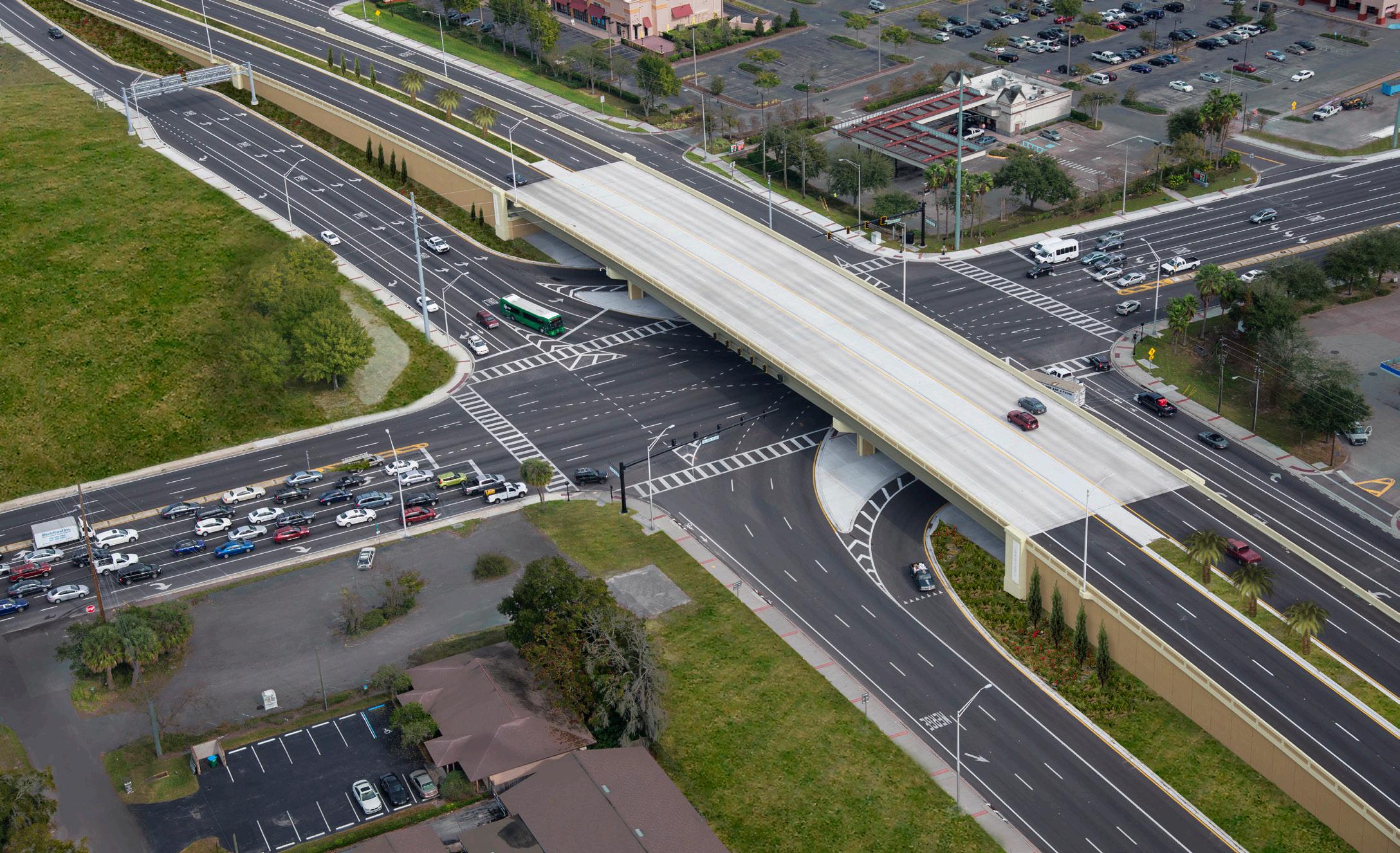 Structural engineers designed a SPUI to elevate four lanes of US 17/92 over SR 436 at what was previously an at-grade intersection. A 457-foot flyover bridge was designed for motorists to drive over SR 436 using concrete 96-inch-deep Florida-I Beams (FIBs). This groundbreaking bridge technology required the unprecedented delivery and installation of 13 of the longest single-piece prestressed concrete beams (209-foot) ever fabricated and installed not just in Florida but the United States. Each beam weighed 267,000-lbs. This project provides a major pipeline to motorists coming from I-4. It was designed and constructed with a $2 million savings to the Owner and a 25 percent reduction of the project schedule.