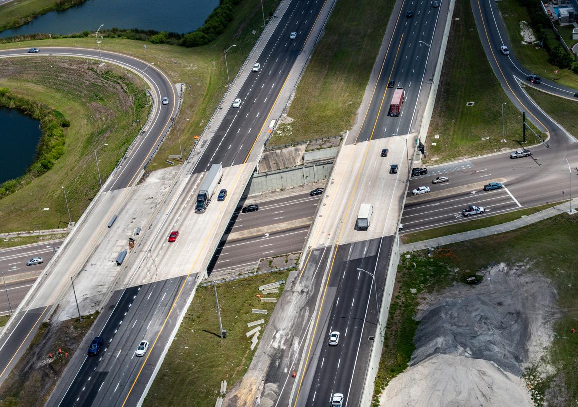 This interchange has five new bridges, two using concrete Florida-U Beams, and three using steel box girders. Four bridge widenings are included, three using Florida-I Beams and one uses steel I-girders.