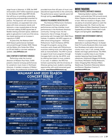 E X PE R IE N C E stage house in Arkansas. In 2018, the AMP announced a $13.9 million expansion project for the Walmart AMP, titled AMP 20|20, that will focus on providing outstanding programming and expanded amenities for patrons. The expansion will include more service windows, an expanded main entry plaza with more concession stands and restrooms, a new covered plaza at the top of the lawn adding 15,000 square feet of flexible viewing and event space, additional gates to get patrons in and out of the venue, new tiered seating and an increase in capacity to 11,000. At press time, the Walmart AMP 2020 Season performances had been announced through October 2020. Please call the Walton Arts Center Box Office at 479.443.5600 or visit their website for updates. www.AMPtickets.com