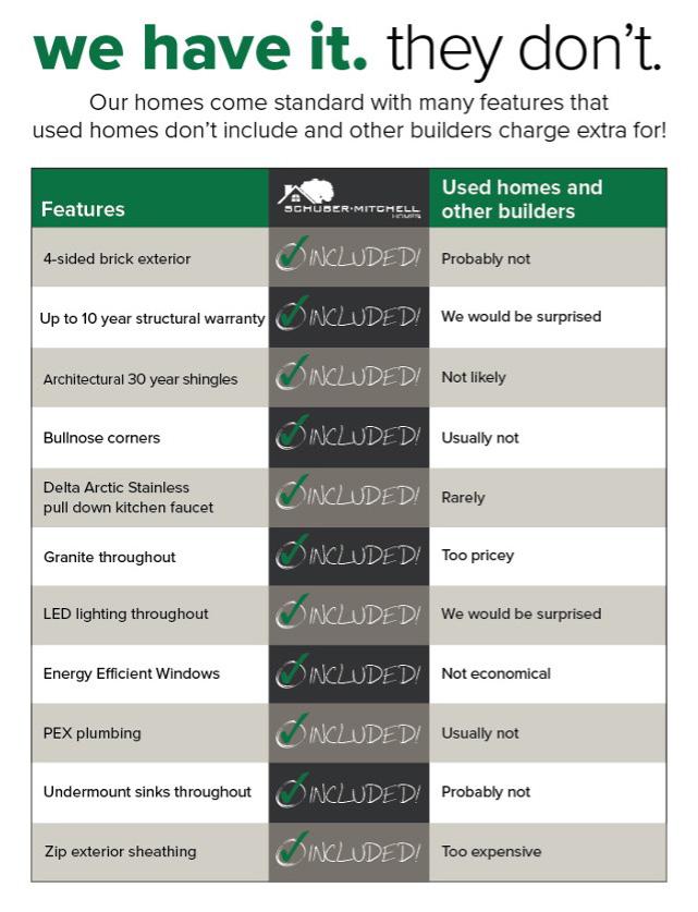 In addition to a truly unique buyer experience, each Schuber Mitchell home comes with many features that used homes don’t include and other builders charge extra for (see chart to the left).