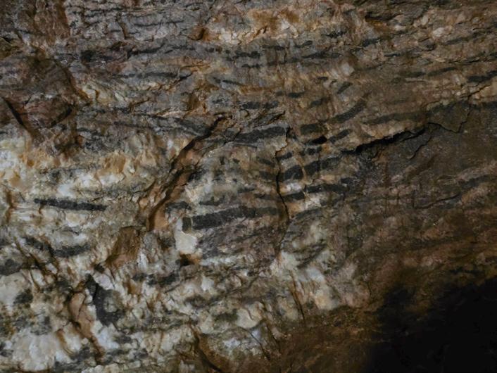 FIGURE 16: A) Zebra dolomite in the cave (Photo by Art Curtis). B) Formation known as “Bacon Rind” (Photo by Ron Parker). C) Cave formations in The Barn (Photo by Laura Wray). D) Exclamation Point view from tunnel in the cave (Photo by Rick Rhinehart). E) Calcite crust filing a void along a fault surface (Photo by Laura Wray).