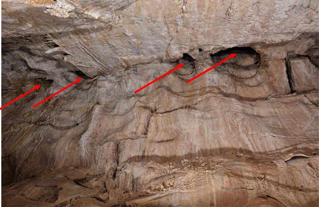 • Bubble trails – Deep grooves or channels in over hanging walls and ceilings. They are thought to form from acidic bubbles lowering the pH along the highest escape path. In the case of sulfidic caves, they more likely form in air-filled passages above floor vents that release warm, low-pH, sul fide-rich moisture that rises along the highest es cape path.