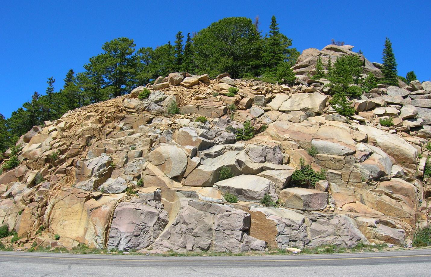 Our group assembled at the Brown Palace, one of Denver’s most famous and longest operating hotels (Figure 1). Constructed from 1890-92, the hotel was owned and operated by Henry Brown, a successful businessman in 19th century Denver. The Brown Palace exhibits a design theme common with buildings of this era. The foundation and first floor exterior are constructed with massive blocks of granite while the upper floors are composed of ‘lighter’ materials such as brick or in this case, a red eolian sandstone from Arizona called the Aztec. The granite, known as the Pike’s Peak (1.0 bya), was quarried from a site along the South Platte River in Jefferson County, Colorado. It is hard, durable and forms a beautiful light pink base to the hotel (Figure 2). The dark red sandstone of the upper exterior floor creates a vivid contrast in color and texture. Jurassic in age, this sandstone was easily workable, evidenced by 26 carved medallions rimming the exterior of the 7th floor depicting mammals of Colorado.