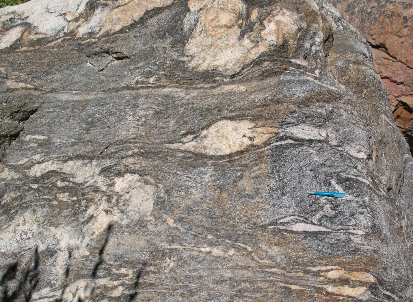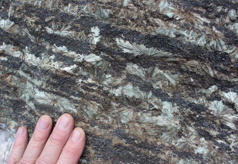 Outcrop photo of “zebra-striped” bands of dark magnetite and lighter tremolite-actinolite, Calumet Iron Mine, Turret Mining District, Salida, Chaffee County, Colorado. This arresting interlayering of magnetite and tremolite-actinolite occurred by metasomatic alteration of the Mississippian Leadville Limestone by fluids derived after intrusion of the late Cretaceous Whitehorn Granodiorite. Photo by Ronald L. Parker.