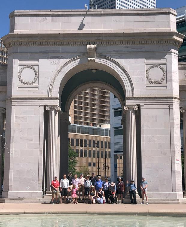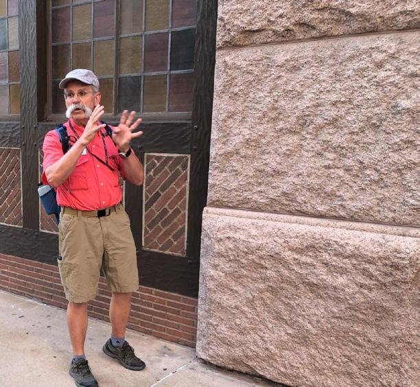 rock, as well as stone imported from other states and countries, used in the construction of many of Denver’s historic stone buildings. Walking the streets of Denver among an influx of Taylor Swift and New York Yankee fans, the group toured the exterior of nearly 20 buildings along a 2.5-mile loop through the city. While the leaders provided insight on the geology of the building stones and their specific quarry locations, both leaders and participants shared stories about the colorful history of the buildings themselves.